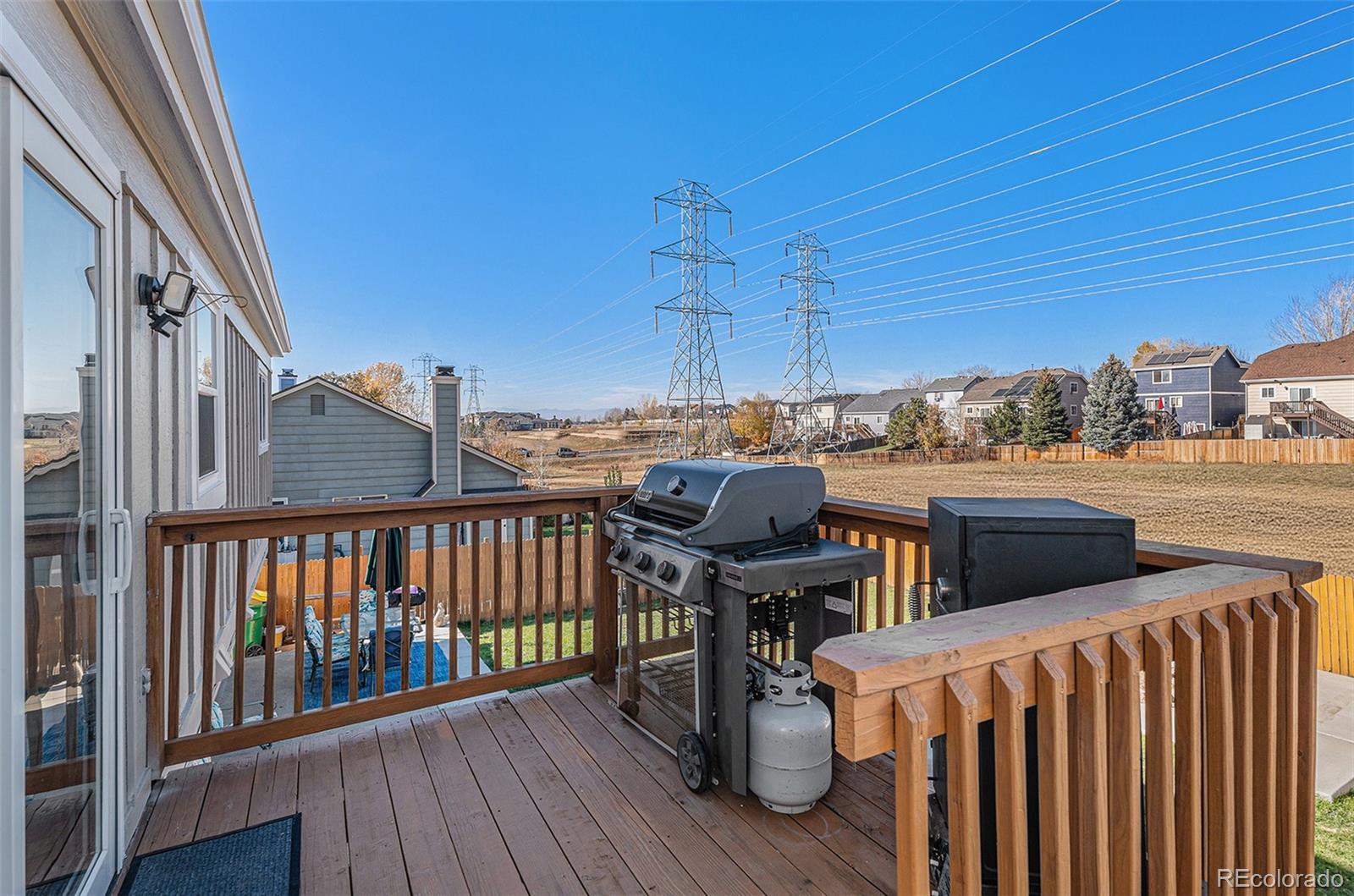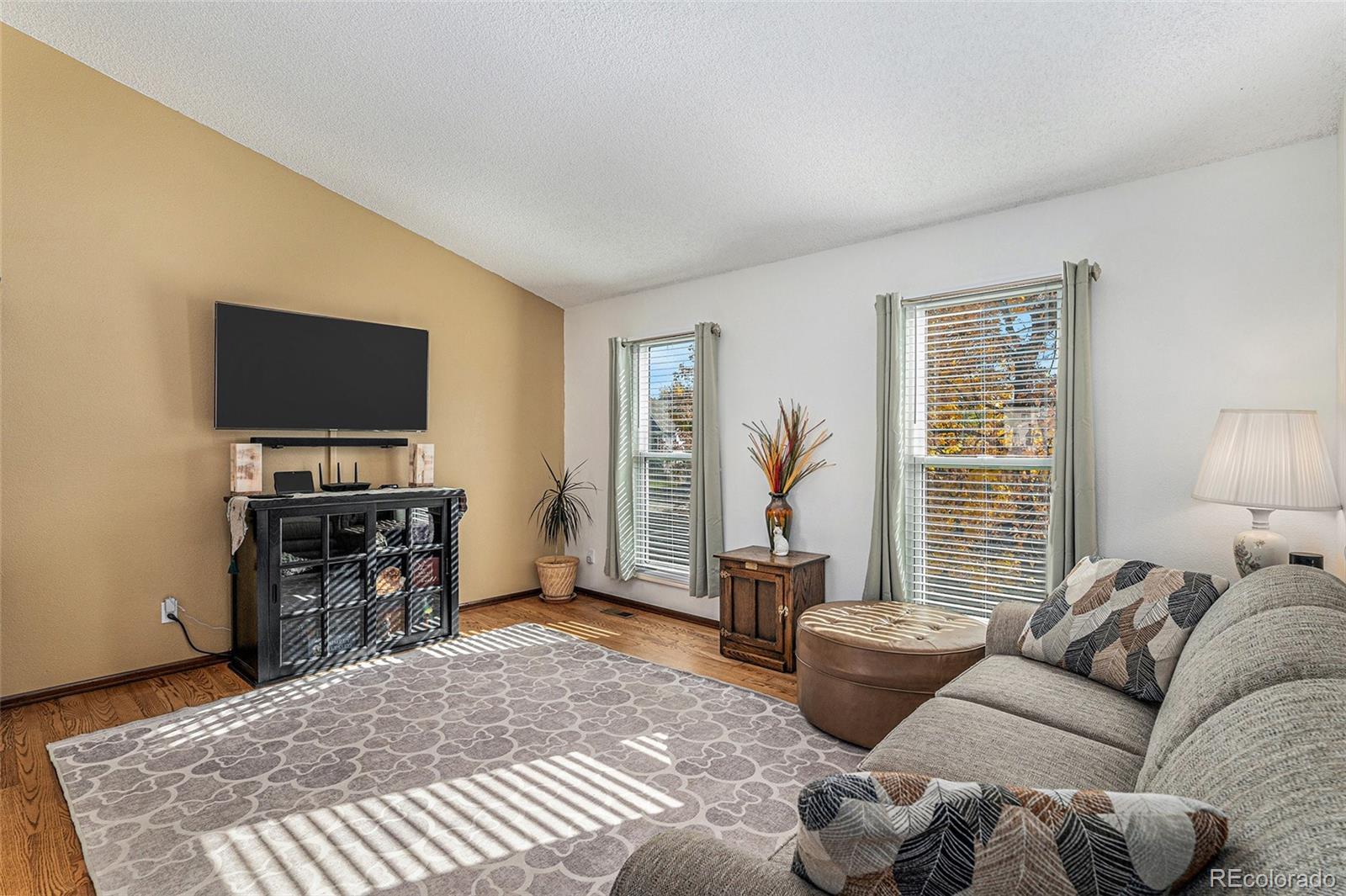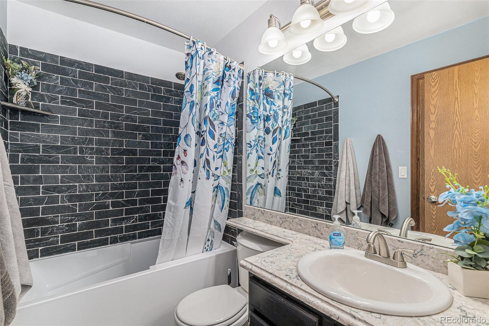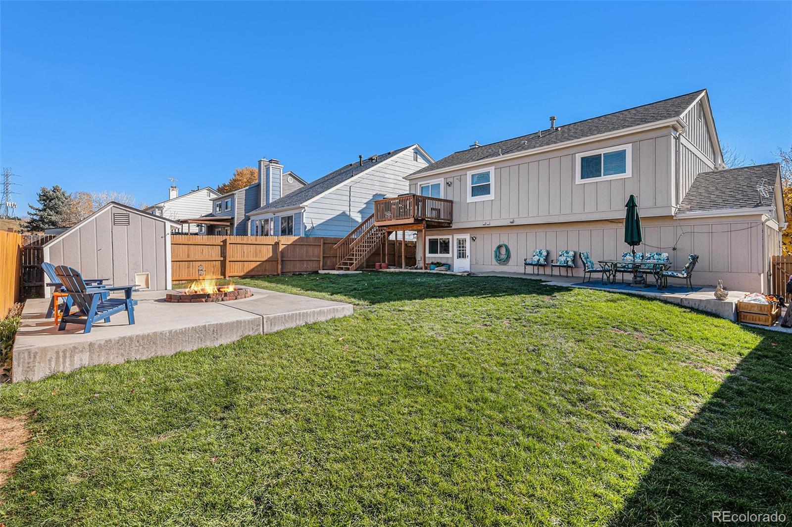 MOVE IN READY!! Great starter home in desirable Seven Hills Community and Award Winning Cherry Creek School District. The main floor features large living room open to dining room and kitchen. The living room and dining room have refinished wood floors. The dining room has direct access to the deck. The kitchen has wood floor, granite counters, stainless steel appliances and pantry. The Primary Bedroom has a walk in closet, carpet and access to the full bath. The 2nd bedroom has a full wall closet and carpet. The lower level has a family room with fireplace and room for an office or easy to make a 3rd bedroom and walkout access to the backyard. The 3/4 bath and laundry with washer and dryer complete the lower level. Walk out to a large fenced yard overlooking open space. There is a concrete pad that would be great for a firepit for late evening relaxing and entertaining. Two car attached garage with NEW garage door plus a shed for lawn and tool storage. Additional Features are central air, sprinkler system, newer carpet, new wrought iron stair spindles, lighting, door hardware, NEW roof and windows (2023), NEW exterior paint (2025) and much more. You won't want to miss this opportunity!