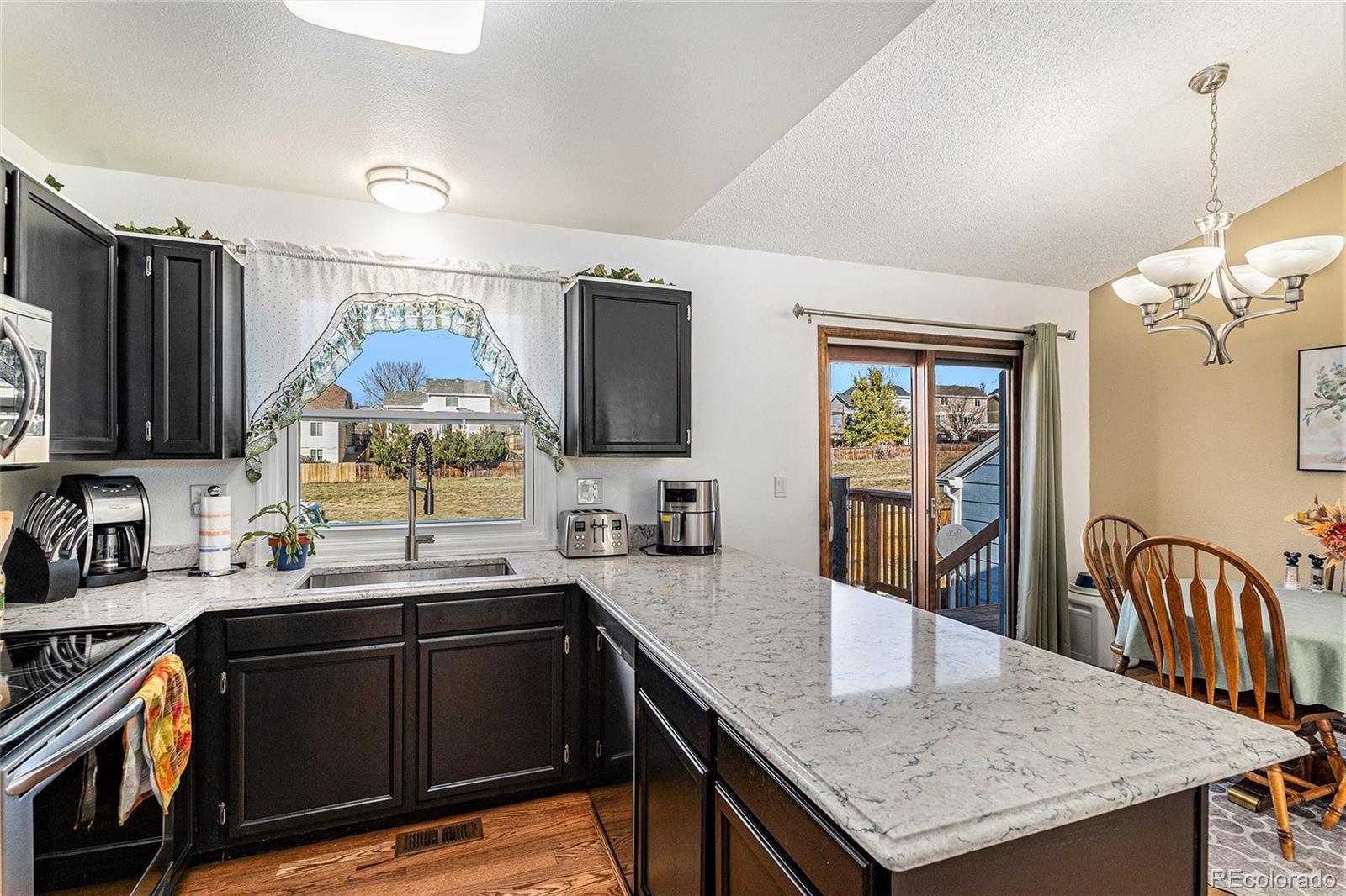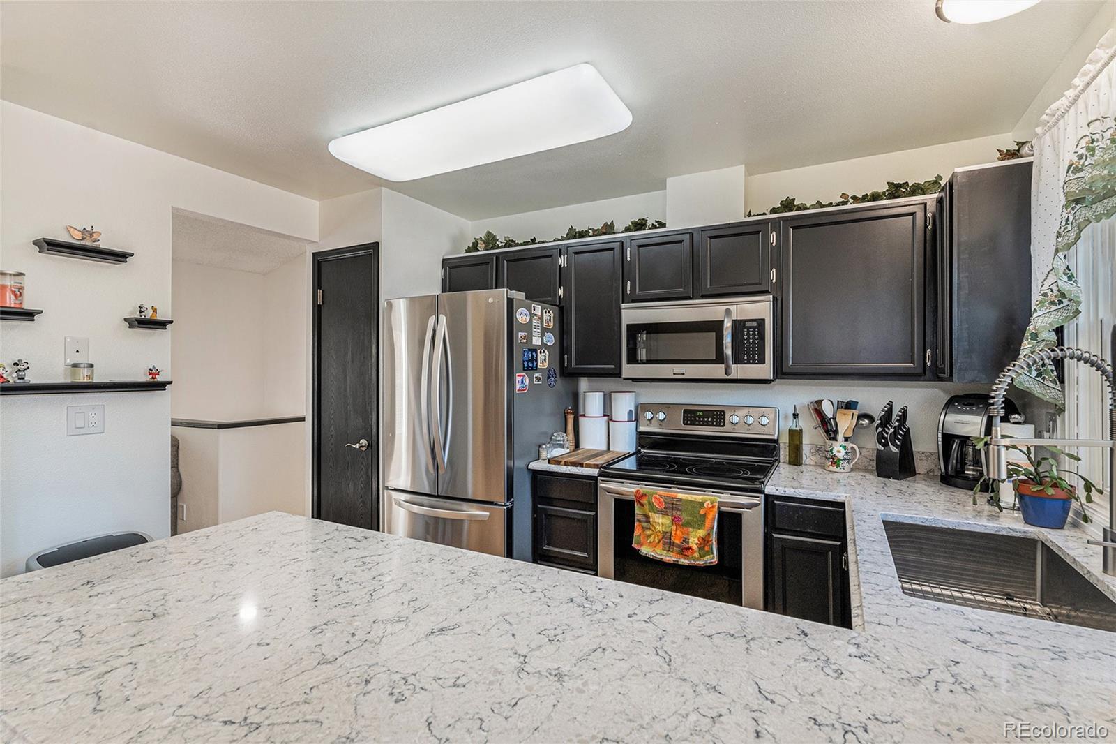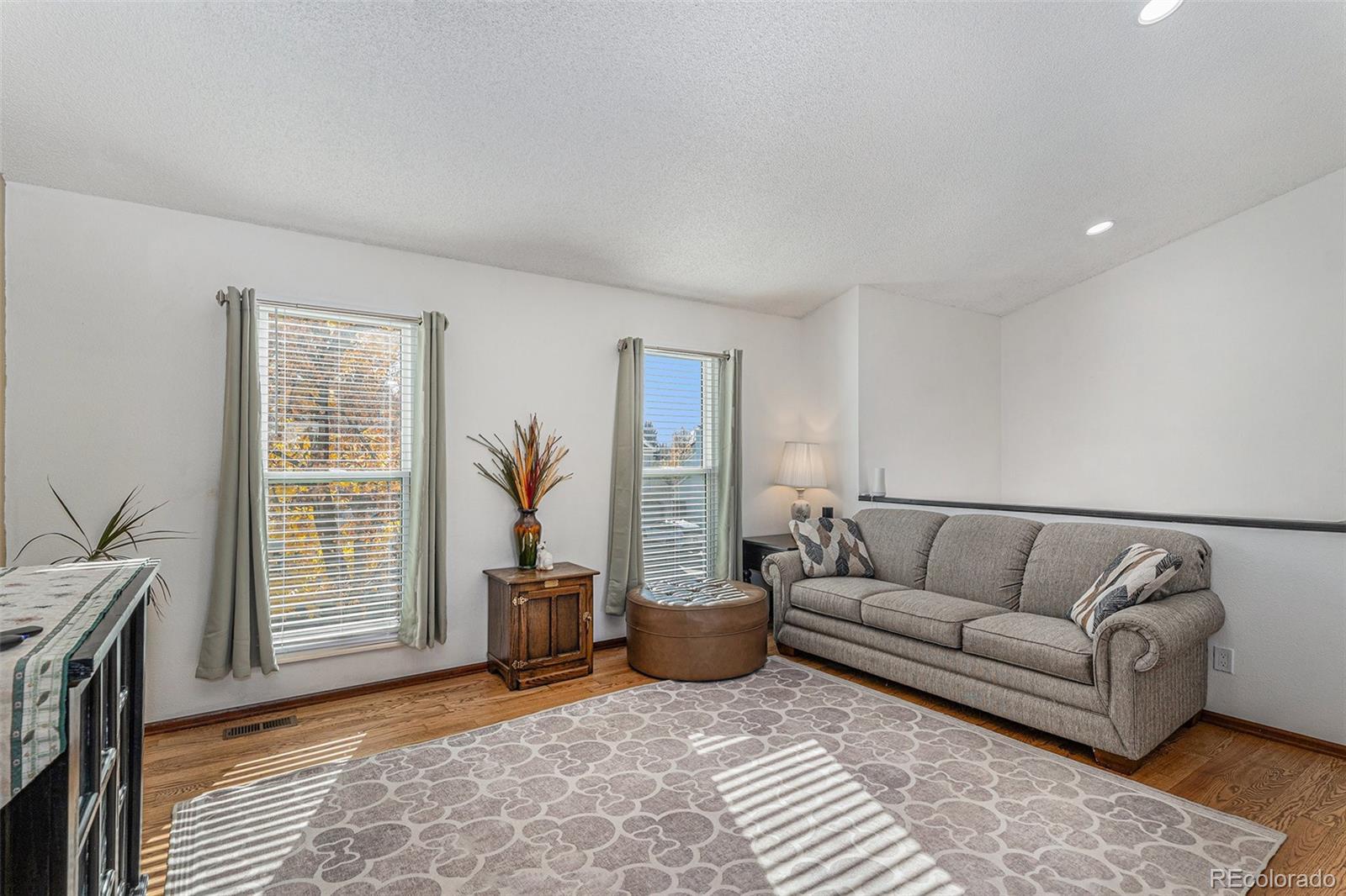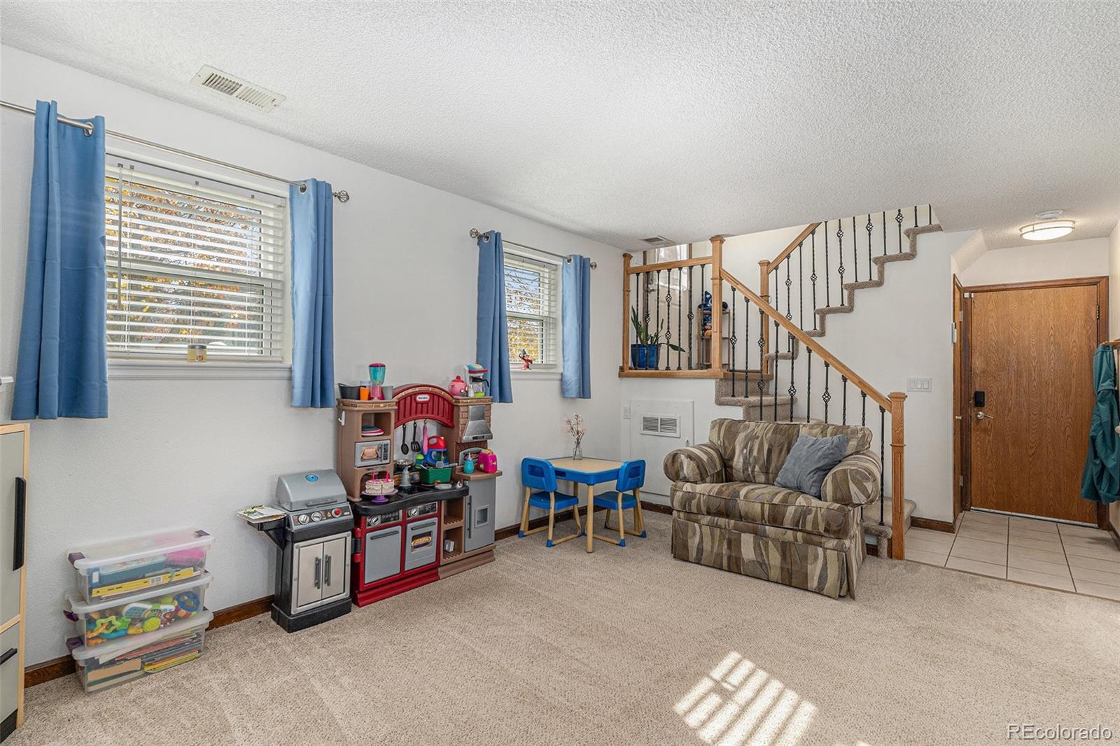 MOVE IN READY!! Great starter home in desirable Seven Hills Community and Award Winning Cherry Creek School District. The main floor features large living room open to dining room and kitchen. The living room and dining room have refinished wood floors. The dining room has direct access to the deck. The kitchen has wood floor, granite counters, stainless steel appliances and pantry. The Primary Bedroom has a walk in closet, carpet and access to the full bath. The 2nd bedroom has a full wall closet and carpet. The lower level has a family room with fireplace and room for an office or easy to make a 3rd bedroom and walkout access to the backyard. The 3/4 bath and laundry with washer and dryer complete the lower level. Walk out to a large fenced yard overlooking open space. There is a concrete pad that would be great for a firepit for late evening relaxing and entertaining. Two car attached garage with NEW garage door plus a shed for lawn and tool storage. Additional Features are central air, sprinkler system, newer carpet, new wrought iron stair spindles, lighting, door hardware, NEW roof and windows (2023), NEW exterior paint (2025) and much more. You won't want to miss this opportunity!