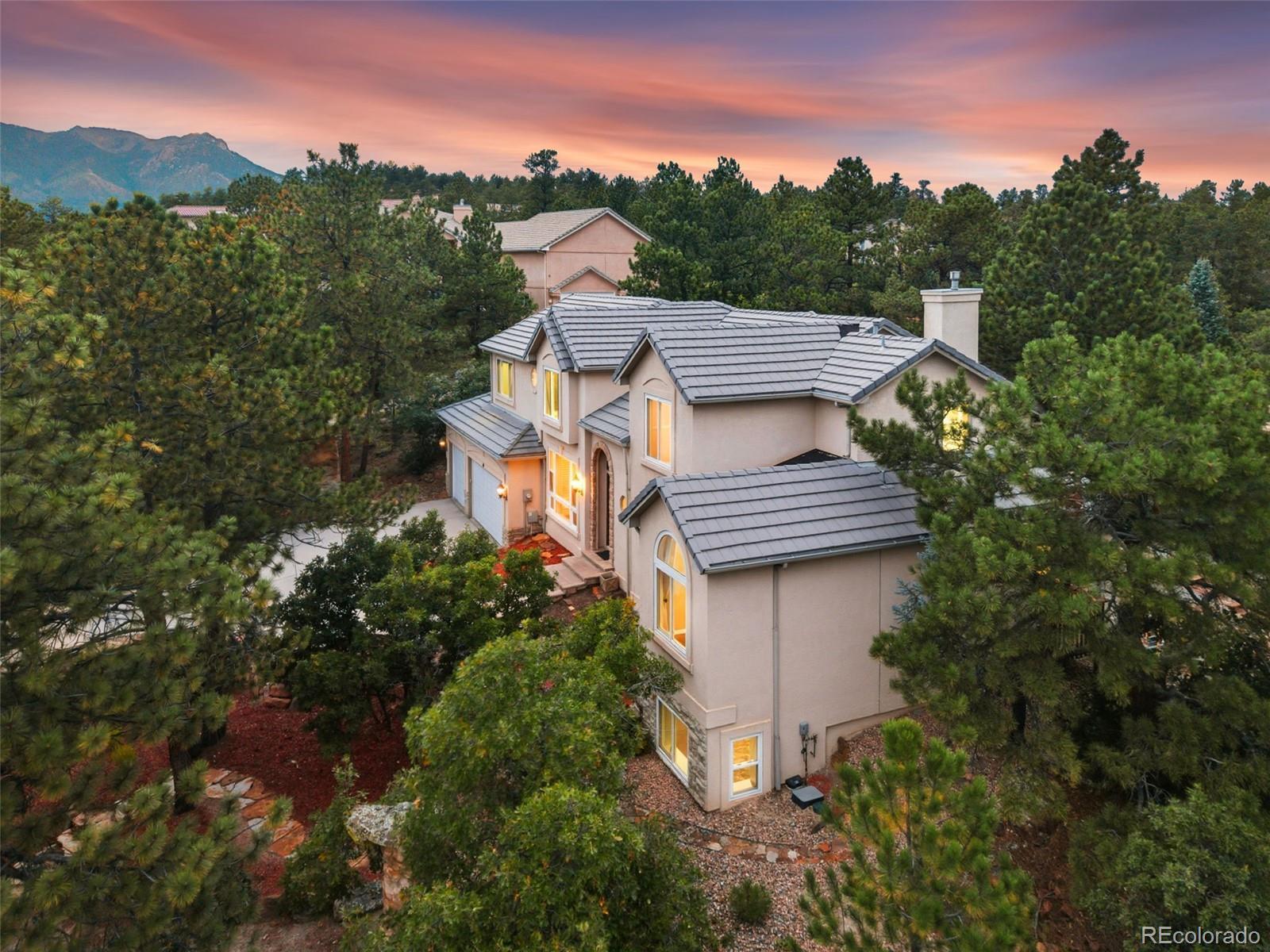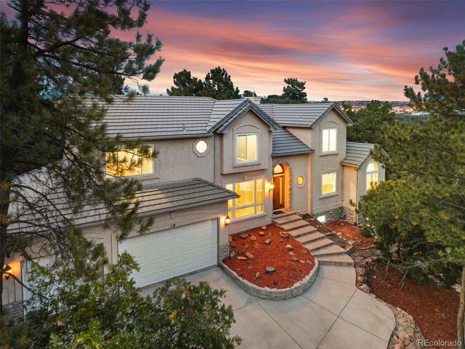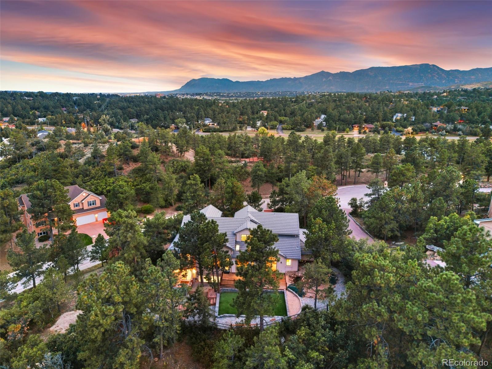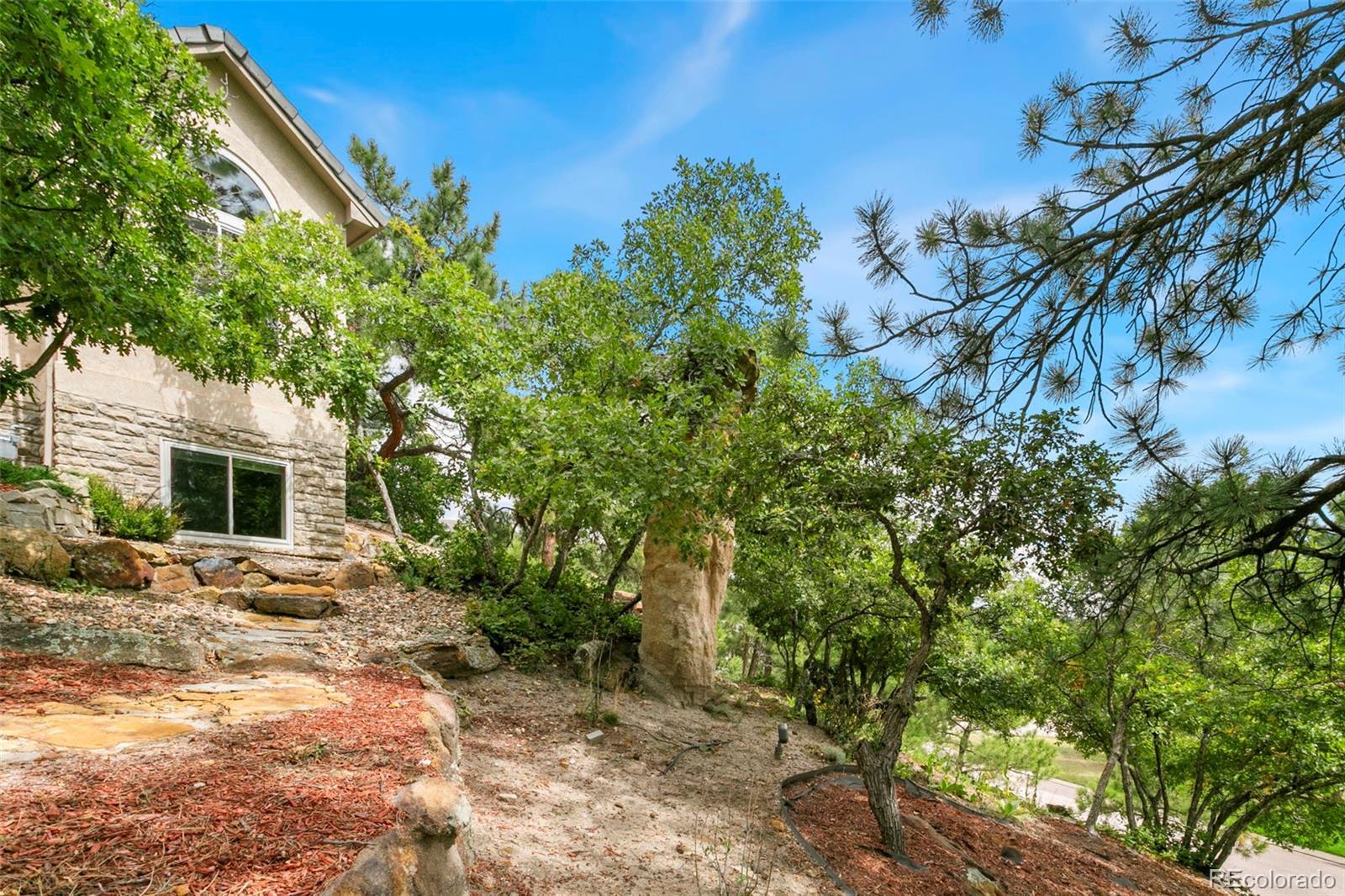 Welcome to 10 Cap Rock Way, a stunning luxury retreat in the exclusive Woodmen Oaks neighborhood. This 5-bedroom, 5-bath, 4,790 sq. ft. custom home rests on a private ¾-acre wooded corner lot and combines timeless elegance with modern updates. From the moment you arrive, you’ll appreciate the professionally landscaped grounds, rare natural hoodoo rock formations and the serene setting that makes this property one of a kind. Inside, soaring ceilings and expansive windows set the tone for gracious living. The gourmet kitchen boasts granite countertops, updated stainless appliances, a large granite sideboard, and opens seamlessly to the great room with its dramatic beamed ceilings and stone fireplace. Both spaces flow onto a spacious deck, complimented by a tranquil water feature; ideal for indoor-outdoor entertaining. A formal dining room with French doors, new hardwood floors, and deck access adds to the home’s sophistication. The main level offers true single-level living with a luxurious primary suite featuring two walk-in closets and a spa-like 5-piece bath. A sunken sitting room, powder bath, and main-level laundry complete this floor. Upstairs, you’ll find a private guest suite with ensuite, two additional bedrooms with private lavatories & a Jack & Jill bath. A versatile office with built-ins features sweeping views. The fully finished lower level is designed for entertaining with an expansive family/game room, tile flooring, wet bar, fireplace, dining space, and direct walkout access to the backyard oasis complete with fenced yard, artificial turf for year-round greenery, and a new hot tub. A fifth bedroom and full bath with a walk-in shower complete the lower level. Additional highlights include fresh interior paint, newly sanded and stained hardwood floors on the main level, and an oversized 3-car garage with workbench. Blending privacy, beauty, and exceptional craftsmanship, this home is ready to welcome you home just in time for the holidays.