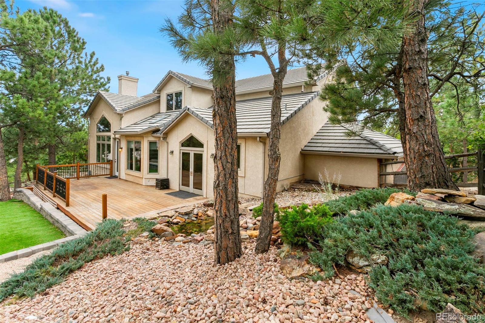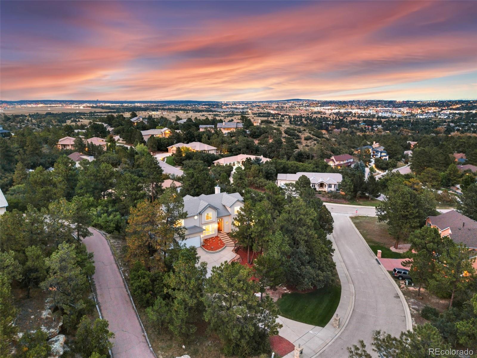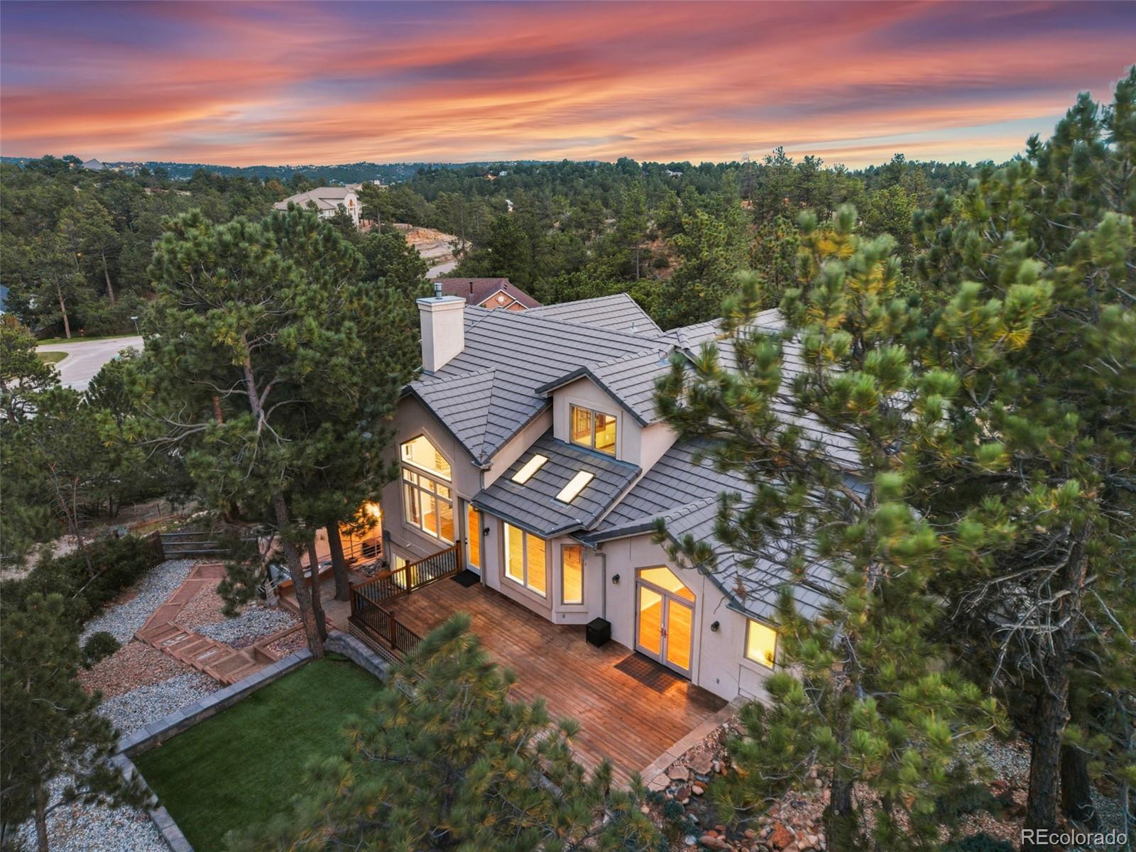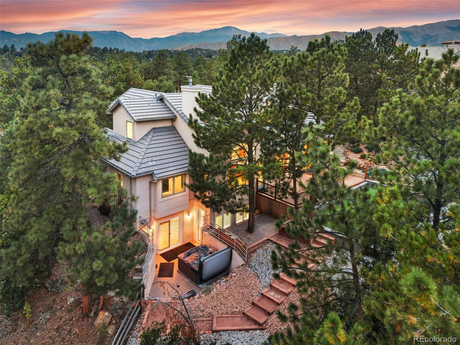 Welcome to 10 Cap Rock Way, a stunning luxury retreat in the exclusive Woodmen Oaks neighborhood. This 5-bedroom, 5-bath, 4,790 sq. ft. custom home rests on a private ¾-acre wooded corner lot and combines timeless elegance with modern updates. From the moment you arrive, you’ll appreciate the professionally landscaped grounds, rare natural hoodoo rock formations and the serene setting that makes this property one of a kind. Inside, soaring ceilings and expansive windows set the tone for gracious living. The gourmet kitchen boasts granite countertops, updated stainless appliances, a large granite sideboard, and opens seamlessly to the great room with its dramatic beamed ceilings and stone fireplace. Both spaces flow onto a spacious deck, complimented by a tranquil water feature; ideal for indoor-outdoor entertaining. A formal dining room with French doors, new hardwood floors, and deck access adds to the home’s sophistication. The main level offers true single-level living with a luxurious primary suite featuring two walk-in closets and a spa-like 5-piece bath. A sunken sitting room, powder bath, and main-level laundry complete this floor. Upstairs, you’ll find a private guest suite with ensuite, two additional bedrooms with private lavatories & a Jack & Jill bath. A versatile office with built-ins features sweeping views. The fully finished lower level is designed for entertaining with an expansive family/game room, tile flooring, wet bar, fireplace, dining space, and direct walkout access to the backyard oasis complete with fenced yard, artificial turf for year-round greenery, and a new hot tub. A fifth bedroom and full bath with a walk-in shower complete the lower level. Additional highlights include fresh interior paint, newly sanded and stained hardwood floors on the main level, and an oversized 3-car garage with workbench. Blending privacy, beauty, and exceptional craftsmanship, this home is ready to welcome you home just in time for the holidays.