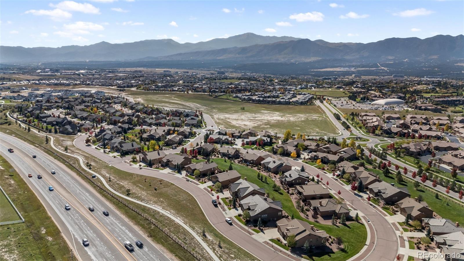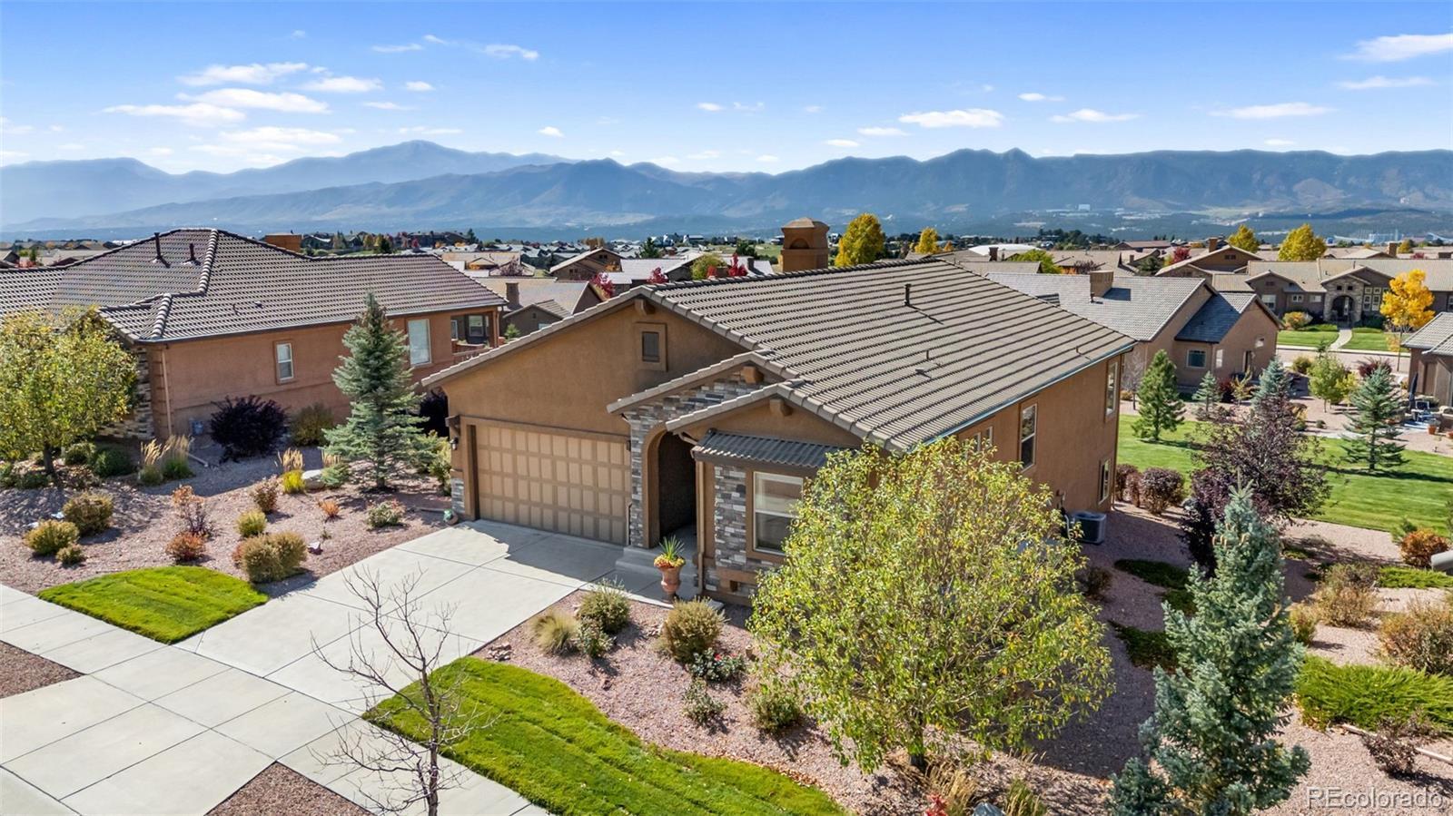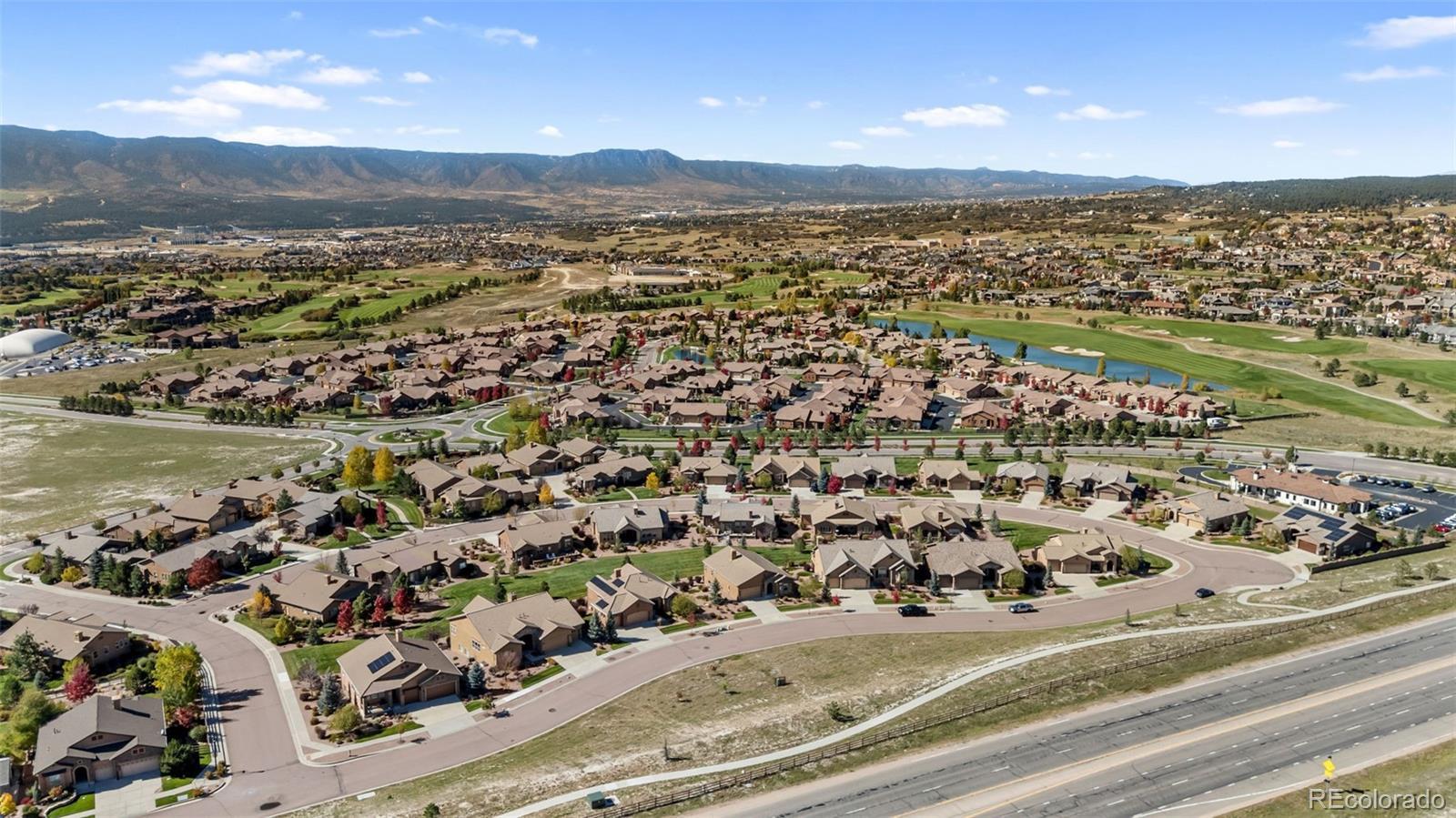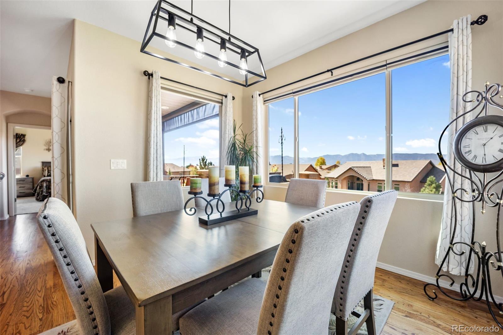 This bright and open ranch-style home in the desirable Flying Horse neighborhood offers stunning mountain views and access to award-winning Academy District 20 schools. Enjoy an ideal location with easy access to downtown Colorado Springs, the Air Force Academy, and major routes via I-25 and Highway 83. Inside, the renovated kitchen features granite countertops and wired under-cabinet lighting, flowing seamlessly into open living and dining areas with real hardwood floors. The primary suite is a serene retreat with a large picture window and updated bath featuring a tiled walk-in shower and barn door for privacy. Main-floor living continues with two additional bedrooms, main floor laundry, and an updated bathroom, making everyday life effortless. The finished walkout basement adds bright, versatile space with a spacious family room, built-ins for TV equipment (pre-wired for 7.2 sound system), and a flex room with double barn doors. Two more bedrooms with generous closets, a bathroom with double split vanities, and built-in shelving complete the lower level. Garden-level windows bring in natural light, while plantation shutters add style and comfort. Ample storage includes a large unfinished area with workbench cabinet. Step outside to take in Pikes Peak views and Thunderbird flyovers from the Trex deck with a remote-operated screen, or enjoy the walkout patio that extends to the backyard green space. Outdoor yard maintenance, snow, and trash removal are all handled by the HOA, making both front and back yards easy to enjoy. Every detail has been designed for comfort and convenience—from front stone accents and new carpet with extra padding, to custom tri-light blinds and double access utility doors. Whether it’s cozy evenings by the fireplace, sunny afternoons on the deck, or family gatherings in the basement, this home invites you to live fully and comfortably. It’s more than a house—it’s the perfect backdrop for your everyday story.