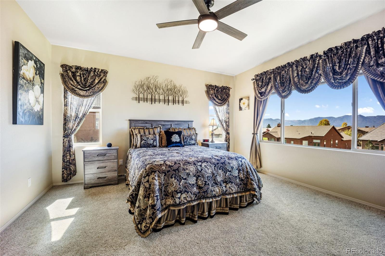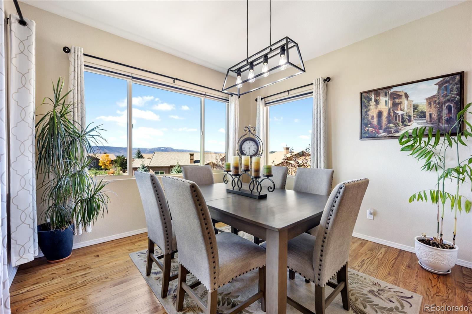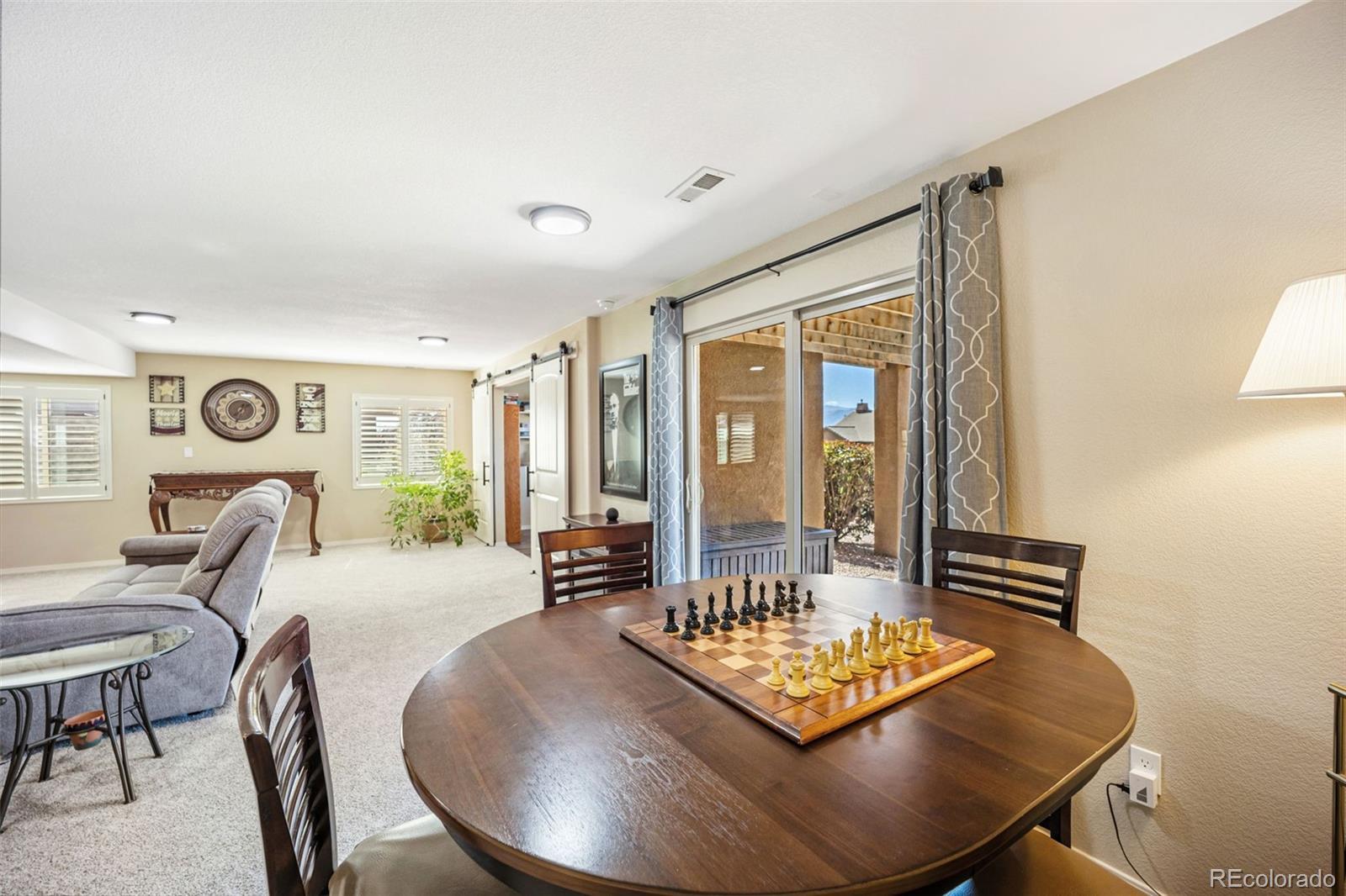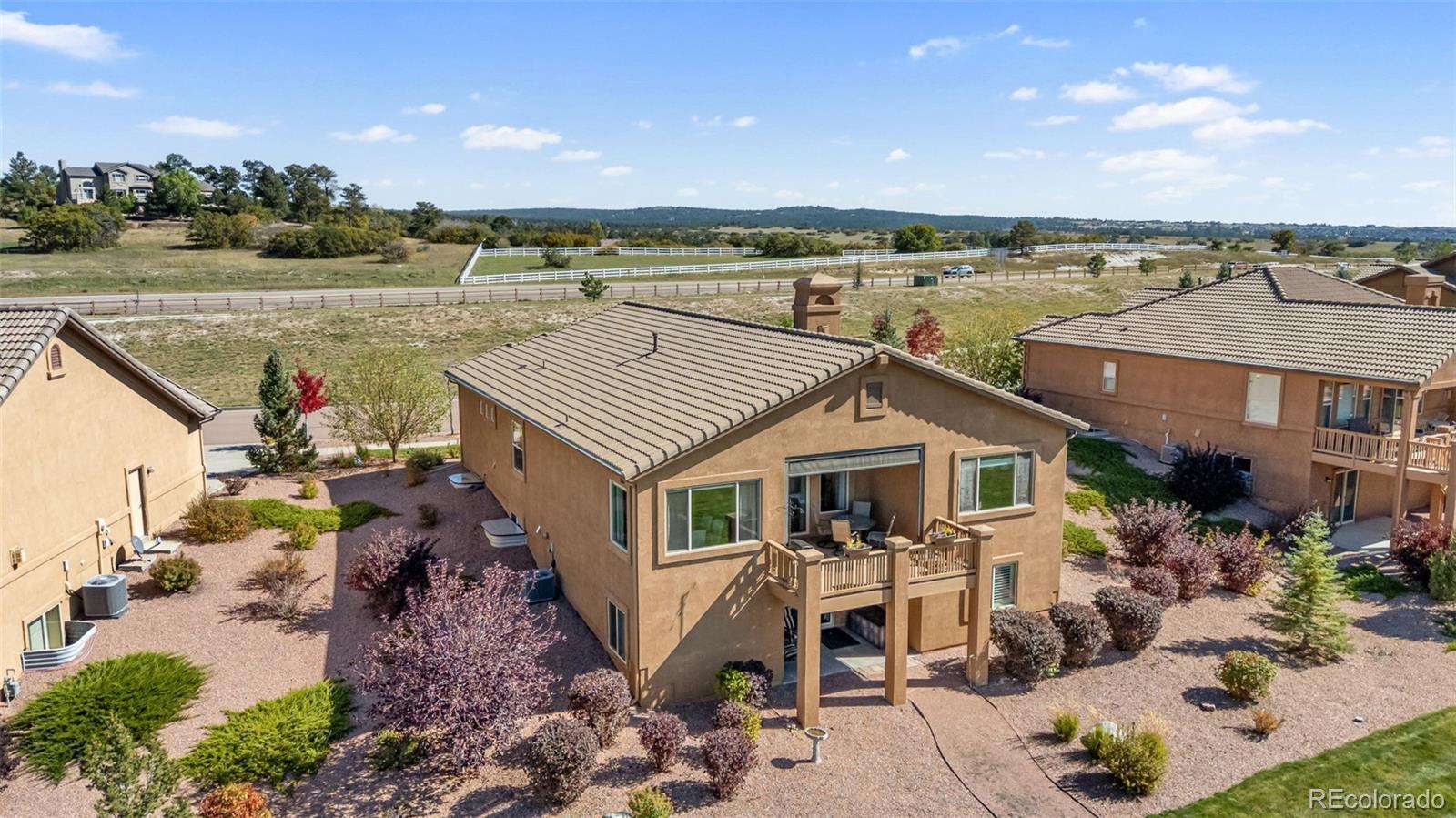 This bright and open ranch-style home in the desirable Flying Horse neighborhood offers stunning mountain views and access to award-winning Academy District 20 schools. Enjoy an ideal location with easy access to downtown Colorado Springs, the Air Force Academy, and major routes via I-25 and Highway 83. Inside, the renovated kitchen features granite countertops and wired under-cabinet lighting, flowing seamlessly into open living and dining areas with real hardwood floors. The primary suite is a serene retreat with a large picture window and updated bath featuring a tiled walk-in shower and barn door for privacy. Main-floor living continues with two additional bedrooms, main floor laundry, and an updated bathroom, making everyday life effortless. The finished walkout basement adds bright, versatile space with a spacious family room, built-ins for TV equipment (pre-wired for 7.2 sound system), and a flex room with double barn doors. Two more bedrooms with generous closets, a bathroom with double split vanities, and built-in shelving complete the lower level. Garden-level windows bring in natural light, while plantation shutters add style and comfort. Ample storage includes a large unfinished area with workbench cabinet. Step outside to take in Pikes Peak views and Thunderbird flyovers from the Trex deck with a remote-operated screen, or enjoy the walkout patio that extends to the backyard green space. Outdoor yard maintenance, snow, and trash removal are all handled by the HOA, making both front and back yards easy to enjoy. Every detail has been designed for comfort and convenience—from front stone accents and new carpet with extra padding, to custom tri-light blinds and double access utility doors. Whether it’s cozy evenings by the fireplace, sunny afternoons on the deck, or family gatherings in the basement, this home invites you to live fully and comfortably. It’s more than a house—it’s the perfect backdrop for your everyday story.