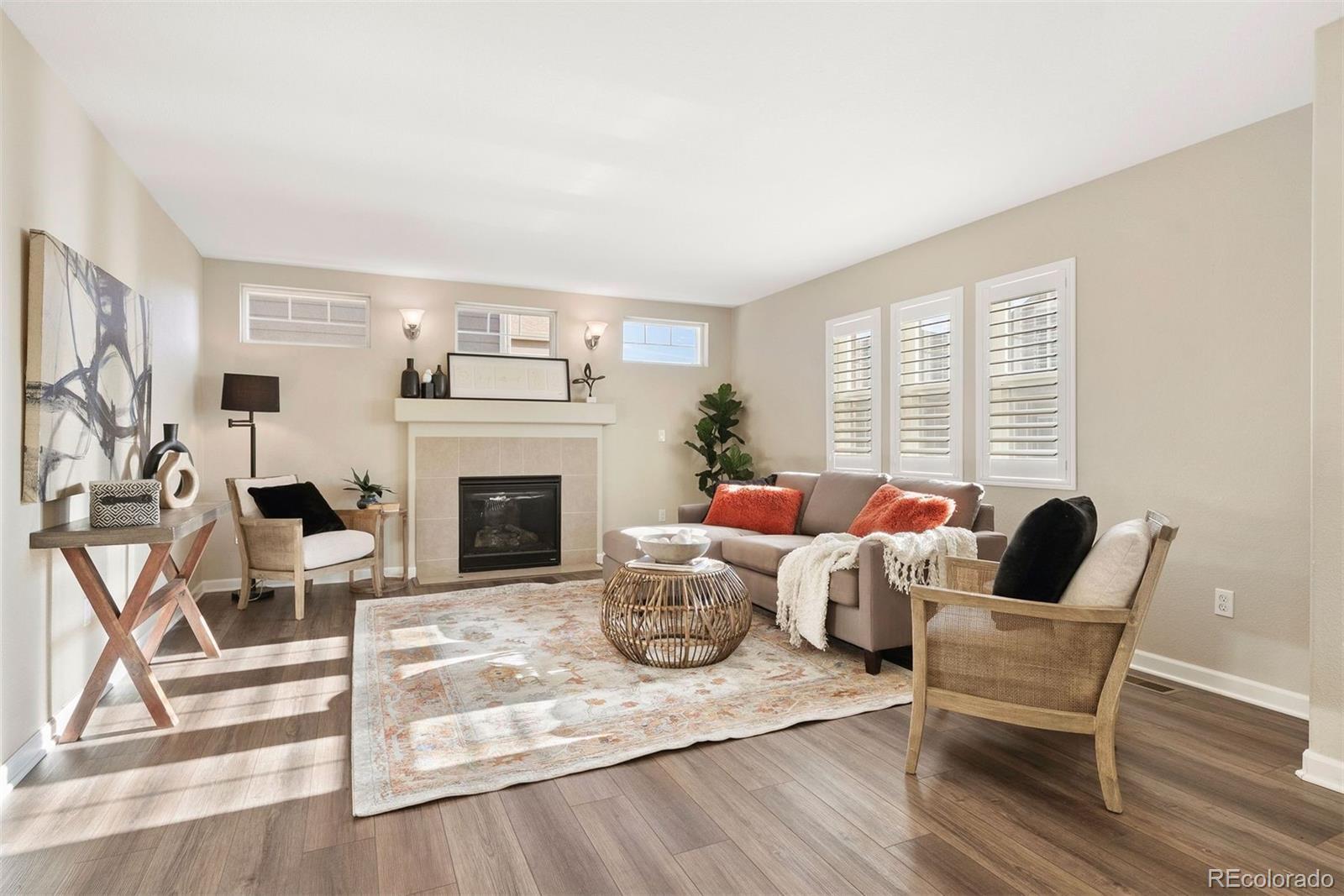 Spacious, updated, and move-in ready—this 4-bedroom home in The Conservatory offers over 3,400 total square feet, a rare full basement, and a long list of thoughtful upgrades. Set on a quiet street with a welcoming brick exterior and charming covered front porch, the home makes a strong first impression. Inside, vaulted ceilings in the living room add to the sense of space and natural light throughout. The main level includes a formal living room, separate dining area, and a large family room with gas fireplace—all flowing effortlessly into the heart of the home: a well-appointed kitchen with two islands, stainless steel appliances, and abundant cabinetry and countertop space. Luxury vinyl plank flooring runs throughout the entire main level and all bathrooms, complemented by custom plantation shutters on every window and brand-new carpet upstairs. Upstairs, you’ll find four vaulted bedrooms, including a spacious primary suite with a 5-piece bath, double vanity with great counter space, and a walk-in closet. The secondary bedrooms share a full hall bath, and some enjoy west-facing mountain views. The nearly 1,200 sq ft full unfinished basement offers excellent potential for storage, recreation, or future expansion—ideal for adding a 5th bedroom and 4th bath if desired. Additional updates include a new roof (2021) and brand-new A/C unit (2023). The Conservatory is a vibrant and desirable community featuring a neighborhood pool, clubhouse, scenic trails, parks, playgrounds, and year-round events. With its flexible layout, quality finishes, and rare full basement, this spacious home offers value, versatility, and a lifestyle you’ll love. Just in time to host the holidays, this move-in ready home is waiting to welcome its next chapter.