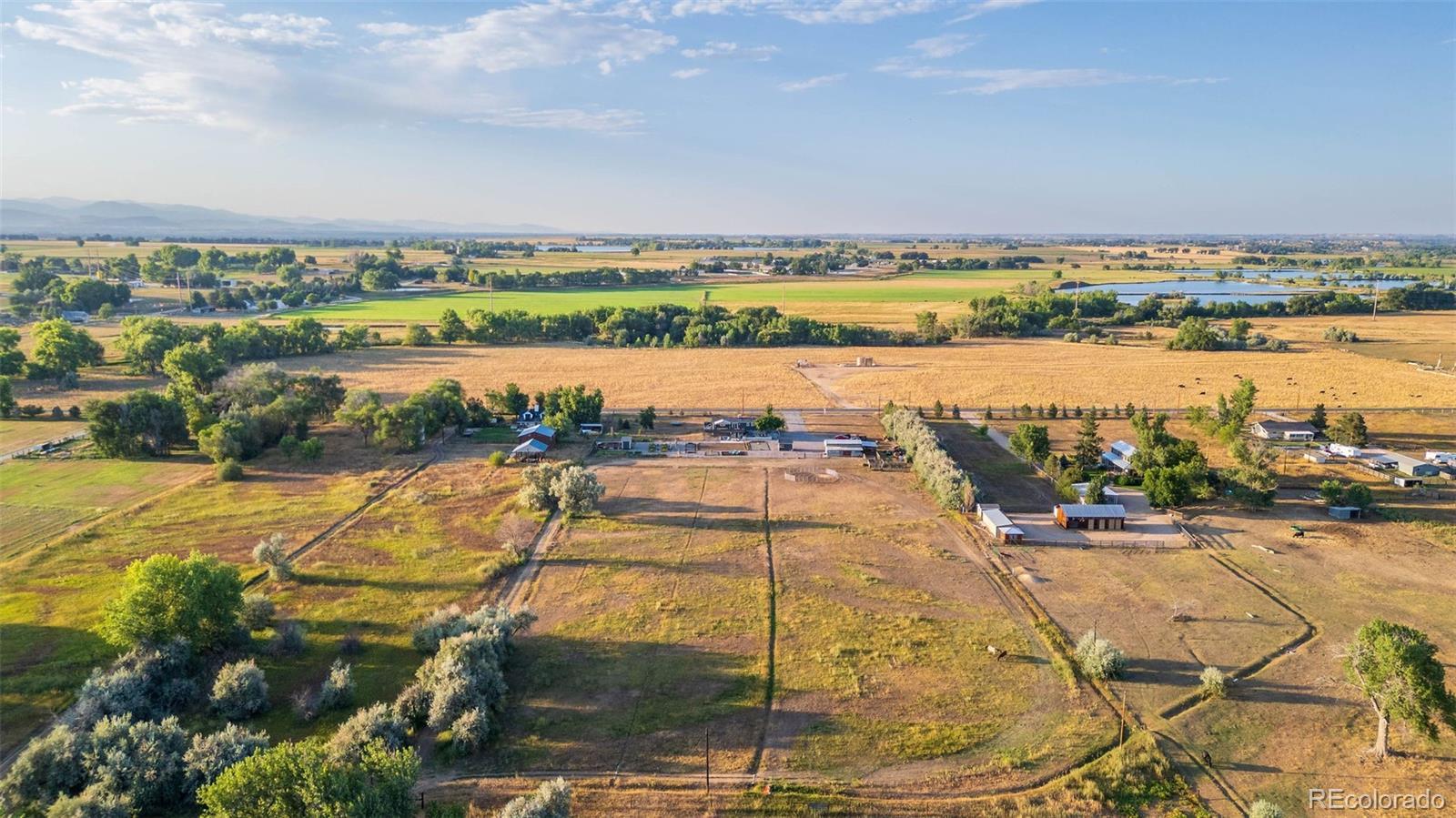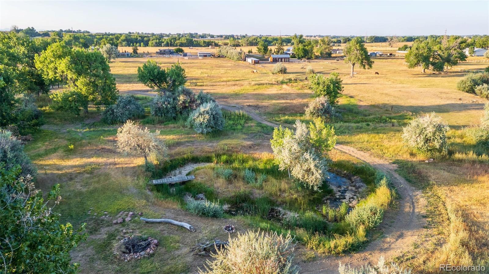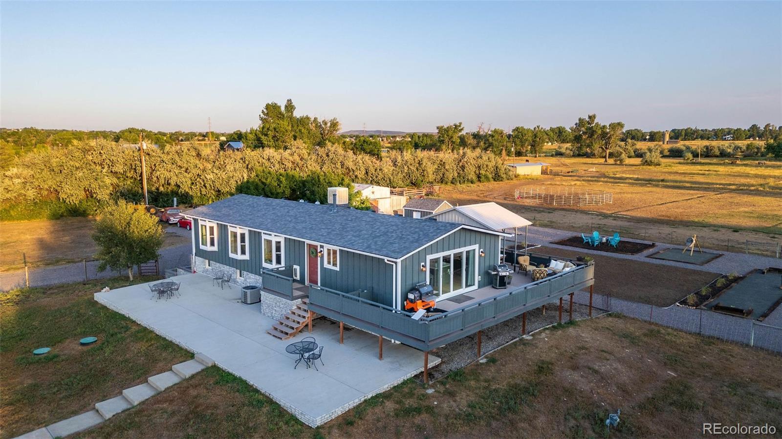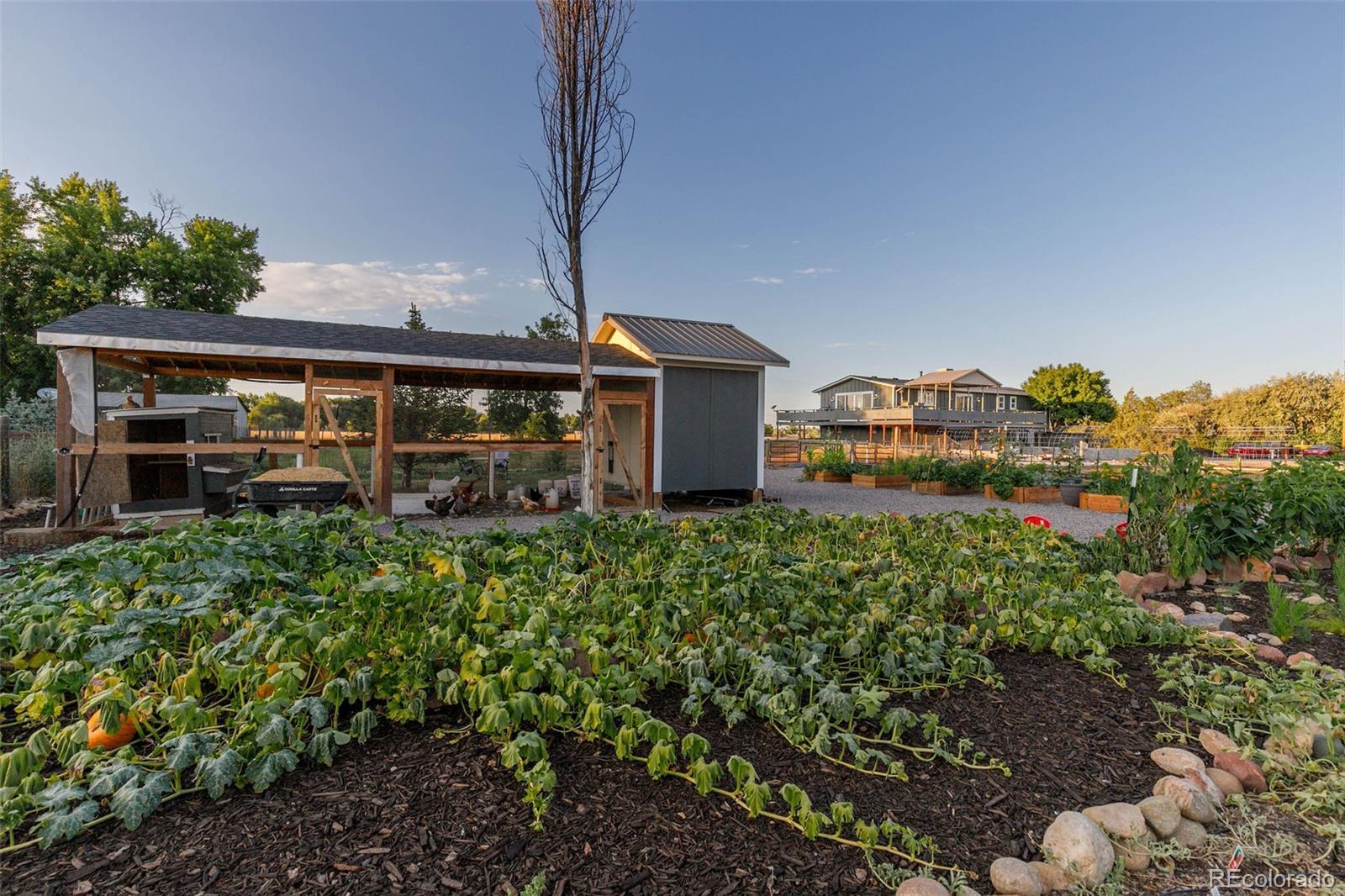 New Price! 10-Acre Mountain View Paradise & Erie Annexation. Discover a rare Colorado gem: 10 acres of privacy surrounded by 1,000 acres of open space, offering mountain views, farm amenities, and unmatched future potential. Agricultural zoning, shared irrigation water rights, city water to the house, and a private well make this property as practical as it is beautiful. A seasonal pond w/ an island and bridge creates the perfect backdrop for entertaining. The ranch style home walk-out basement was completely taken down to the studs in 2020 and rebuilt with comfort and durability in mind. Updates include upgraded insulation, James Hardie cement siding, new roof with gutters, energy-efficient windows, plumbing, electrical, HVAC, and a full interior remodel. Inside you'll find a chef's kitchen with custom cabinetry, a floor-to-ceiling pantry with pull-out drawers, and a 12-foot island designed for gatherings. Fresh living spaces, remodeled bathrooms, a primary suite with en-suite bath, and four additional bedrooms make this home truly move-in ready. Outdoors, the property offers a 10k SF garden with raised beds, melon/pumpkin patches, and orchard. A covered chicken coop with a large run set on a concrete perimeter provides both space and security, while the classic barn features 2 horse stalls and a lean-to area for additional animals or storage. For recreation enjoy a semi wrap-around deck, 4 concrete patios with accent finishes and sit walls, a fire pit, horseshoe, cornhole, and axe-throwing pits, and a bar/shed. Recent annexation into the Town of Erie unlocks extraordinary possibilities. Unlike neighboring Boulder County properties, this parcel allows flexibility to add structures, build an ADU, host farm events, or even scrape/rebuild without size restrictions. Whether you're envisioning a private retreat, hobby farm, or event venue, this property delivers a lifestyle rarely available with such sweeping views and long-term potential.