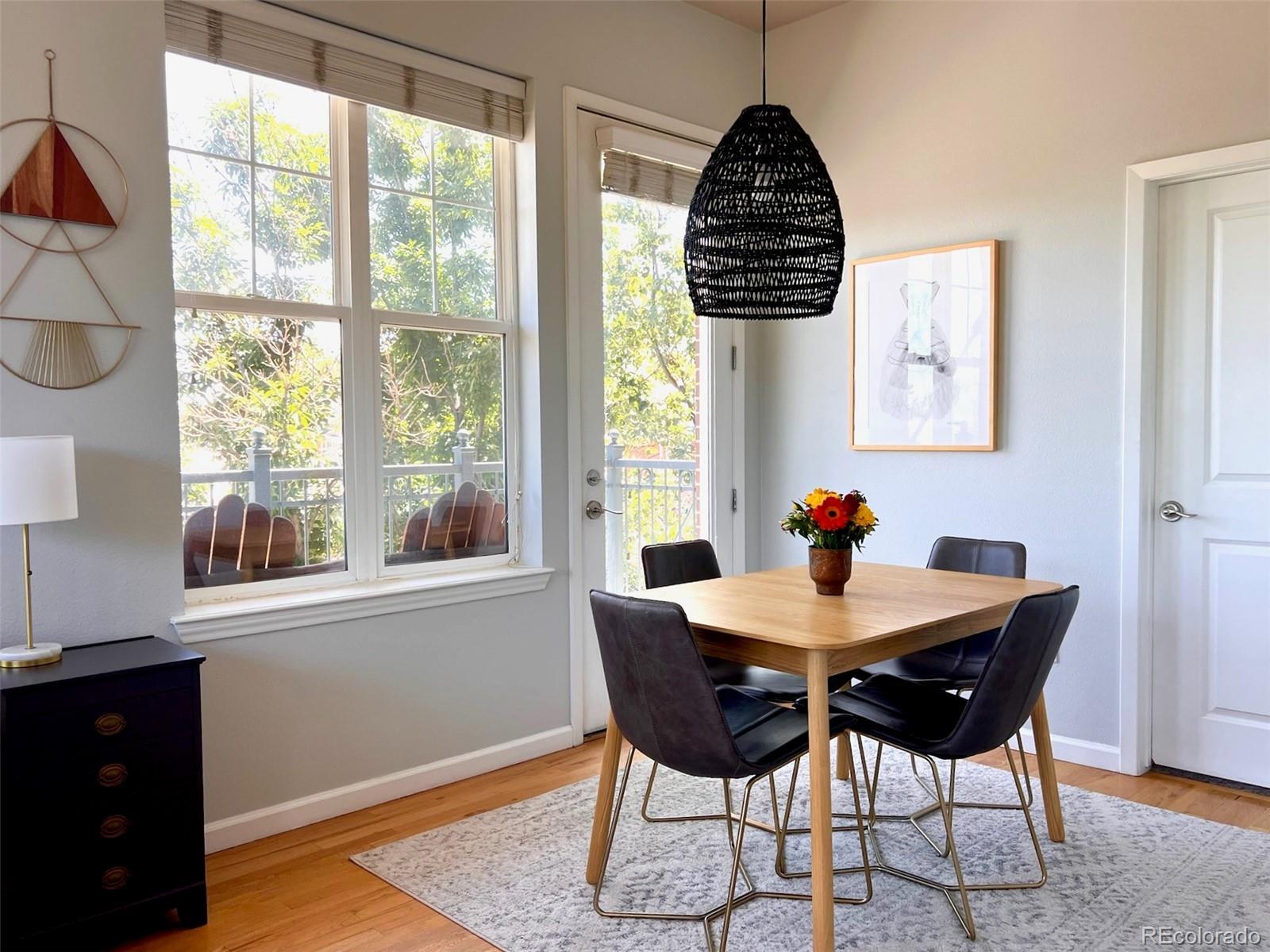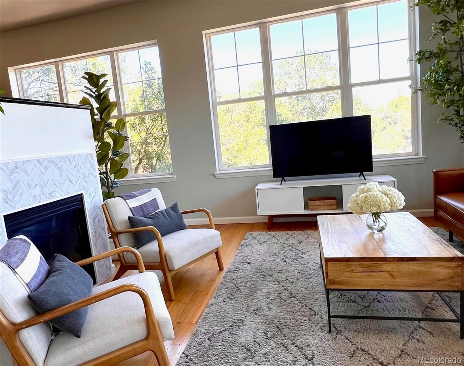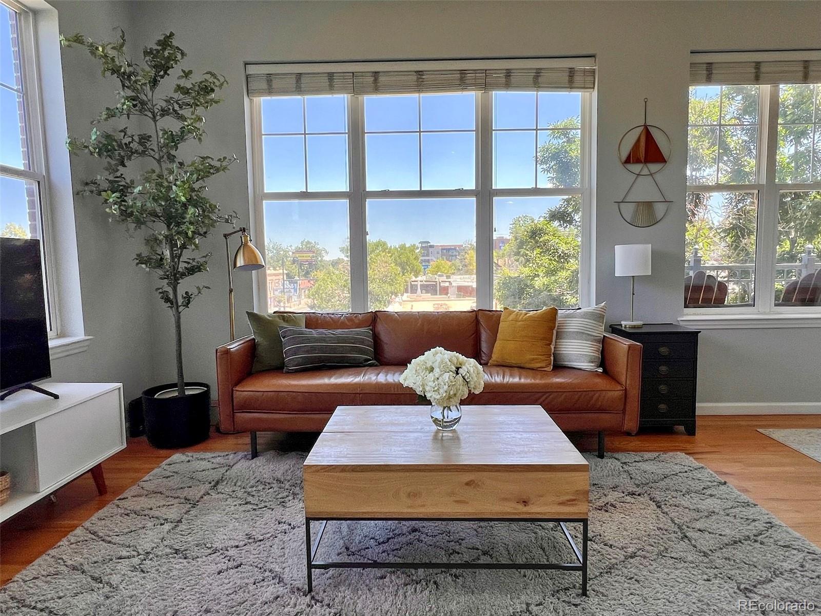 ight-filled corner unit in one of the best positions in the building. Surrounded by walkable amenities just outside your door, this rare layout features wraparound north- and east-facing windows across the kitchen, living, and dining areas, filling the home with natural light throughout the day. Oversized windows sit at tree-canopy level, creating a uniquely private, leafy setting—unlike many units that offer only a single exposure or face directly into neighboring buildings. The primary bedroom includes an en-suite bathroom and walk-in closet. The living area is highlighted by tall ceilings, a cozy gas fireplace, and access to a private balcony, ideal for everyday living or entertaining. Recent updates include a new A/C unit, refrigerator, bathroom vanities, updated lighting throughout, and fresh paint in every room. Additional highlights include: One of the lowest HOA dues in the building Covered garage parking with storage In-unit laundry Elevator access Secure, well-managed, primarily owner-occupied building Step outside and enjoy immediate access to cafés, groceries, dining, fitness and yoga studios, salons, and the Bluebird Theater—without sacrificing quiet or privacy at home. With upcoming Colfax transportation improvements enhancing long-term accessibility and value, this home offers both immediate livability and future upside. A standout unit—rarely available and offered for a limited time before returning to successful long-term rental use. Offered as a private listing with opportunities for private showings and daily open houses.
