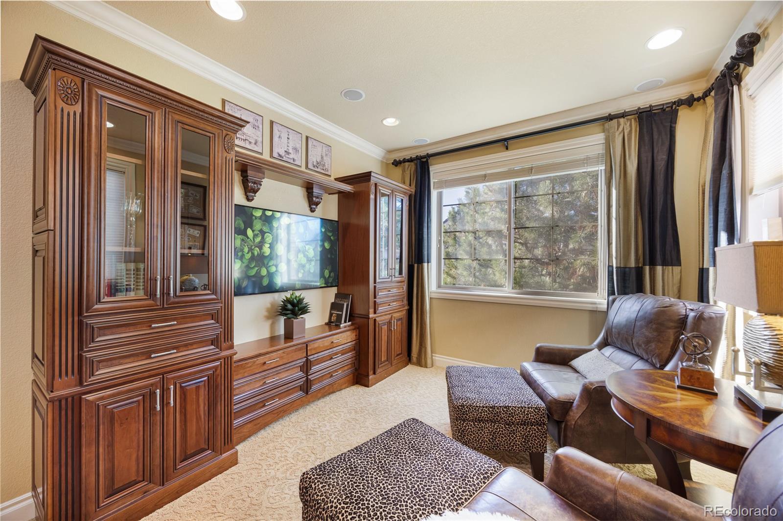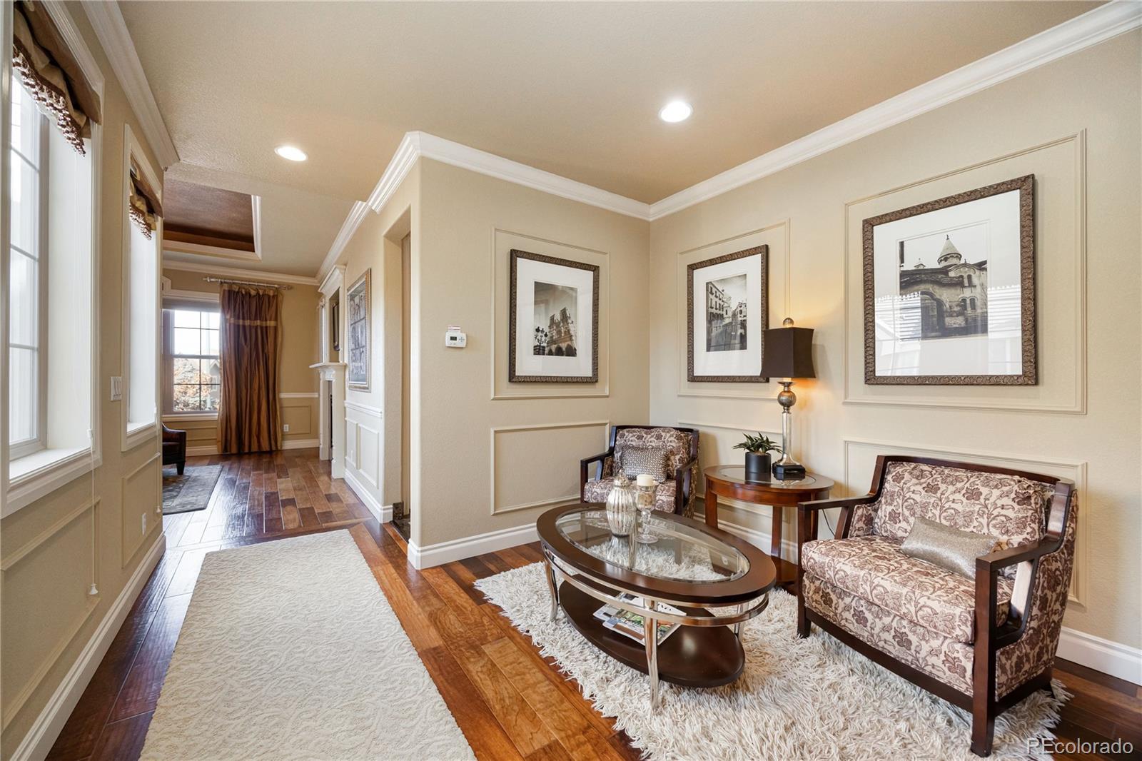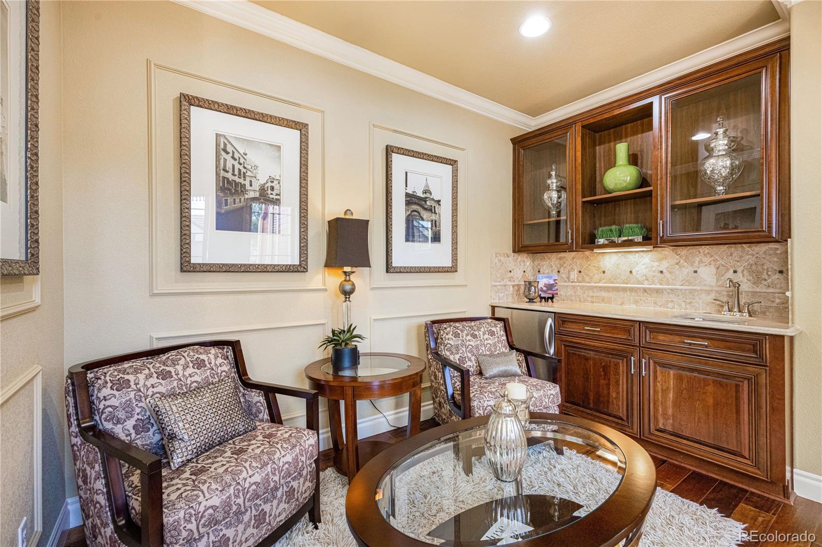 FORMER MODEL HOME! Prepare to be impressed from the moment you step inside this meticulously maintained end-unit Townhome with luxurious Model Home décor with every premium upgrade the builder offered. Gleaming hardwood floors flow throughout the main level while custom crown molding adds sophistication to every room. The inviting Living room showcases a gas fireplace, built-in shelving, and custom window accents. The chef's Kitchen features a custom island with additional storage, built-in refrigerator, walk-in pantry, granite counters, and high-end appliances including gas cooktop with griddle and range hood, double ovens, and wine refrigerator. Step through the large slider from the kitchen or main floor office into your private enclosed courtyard featuring custom brick built-in BBQ, fireplace, and wine fridge perfect for entertaining! The expansive master suite will take your breath away with its sitting area complete with coffee station and mini-fridge. The master bedroom boasts tray ceiling, large windows, gas fireplace, and access to the upstairs balcony. Indulge in the spa-like 5-piece master bath with jetted soaking tub and large walk-in closet. Two additional bedrooms and spacious loft provide versatile living space, with the 3rd bedroom set up as a home gym featuring mirrored wall, 4 TV's, and beverage station! The end-unit position includes a 3-car garage with finished drywall and Elfa storage system. Unbeatable location, walk to the Library or Arts Center! Centrally positioned near I-25 in the heart of Lone Tree, less than a mile from light rail station for easy commutes to Denver or airport. Park Meadows mall and Bluffs Regional Park nearby.The property will be sold fully furnished. Experience model home elegance with low-maintenance luxury. Schedule your showing today! Click here to see Video tour: https://youtube.com/shorts/1H-XcvEsvSQ?si=YsIFCRlisc2hux6c OPEN HOUSE Saturday, Jan 10th 11AM-3PM