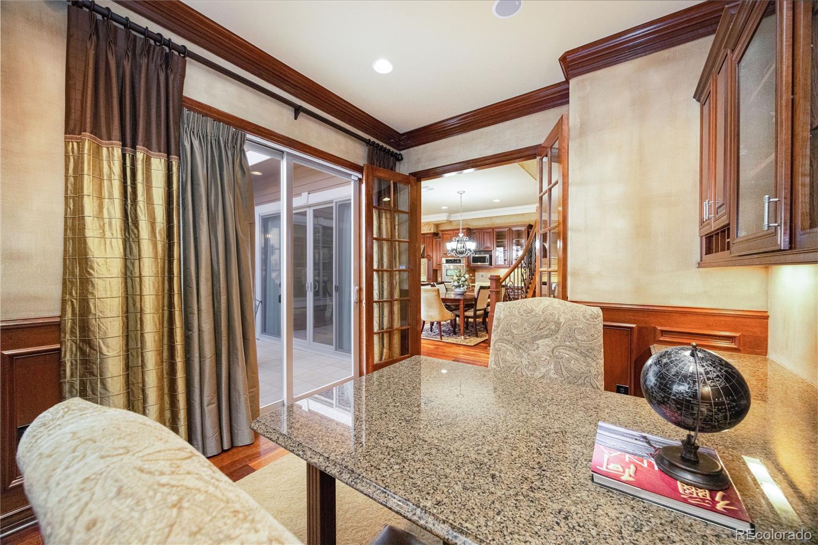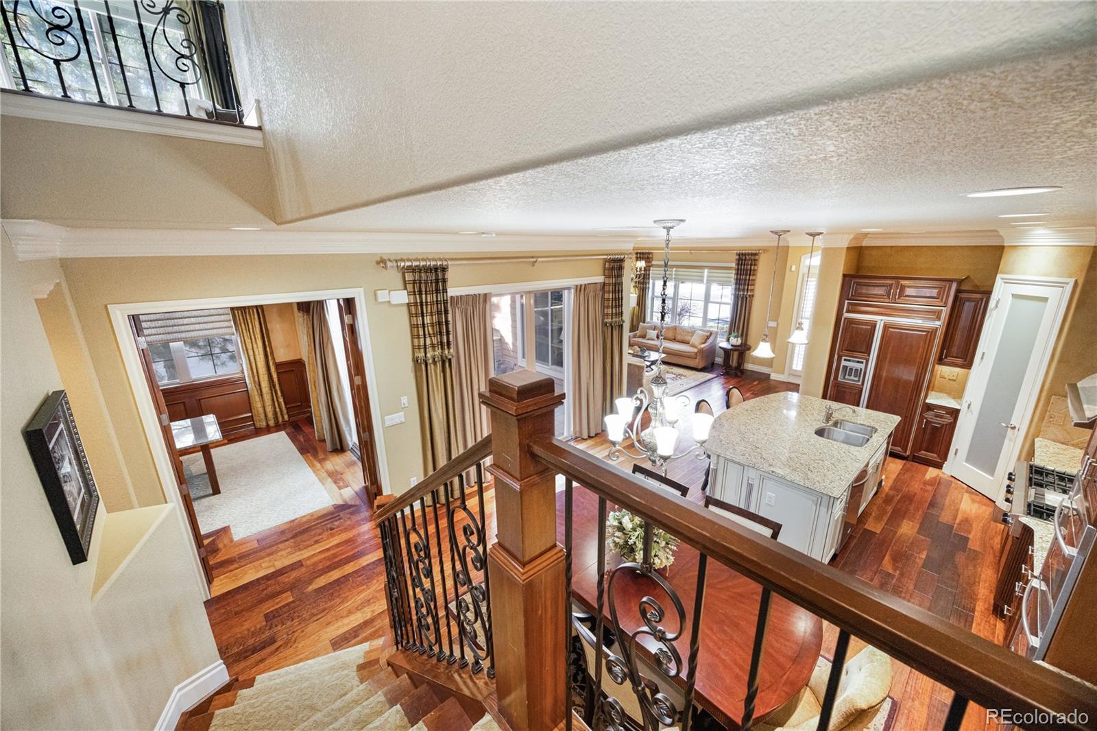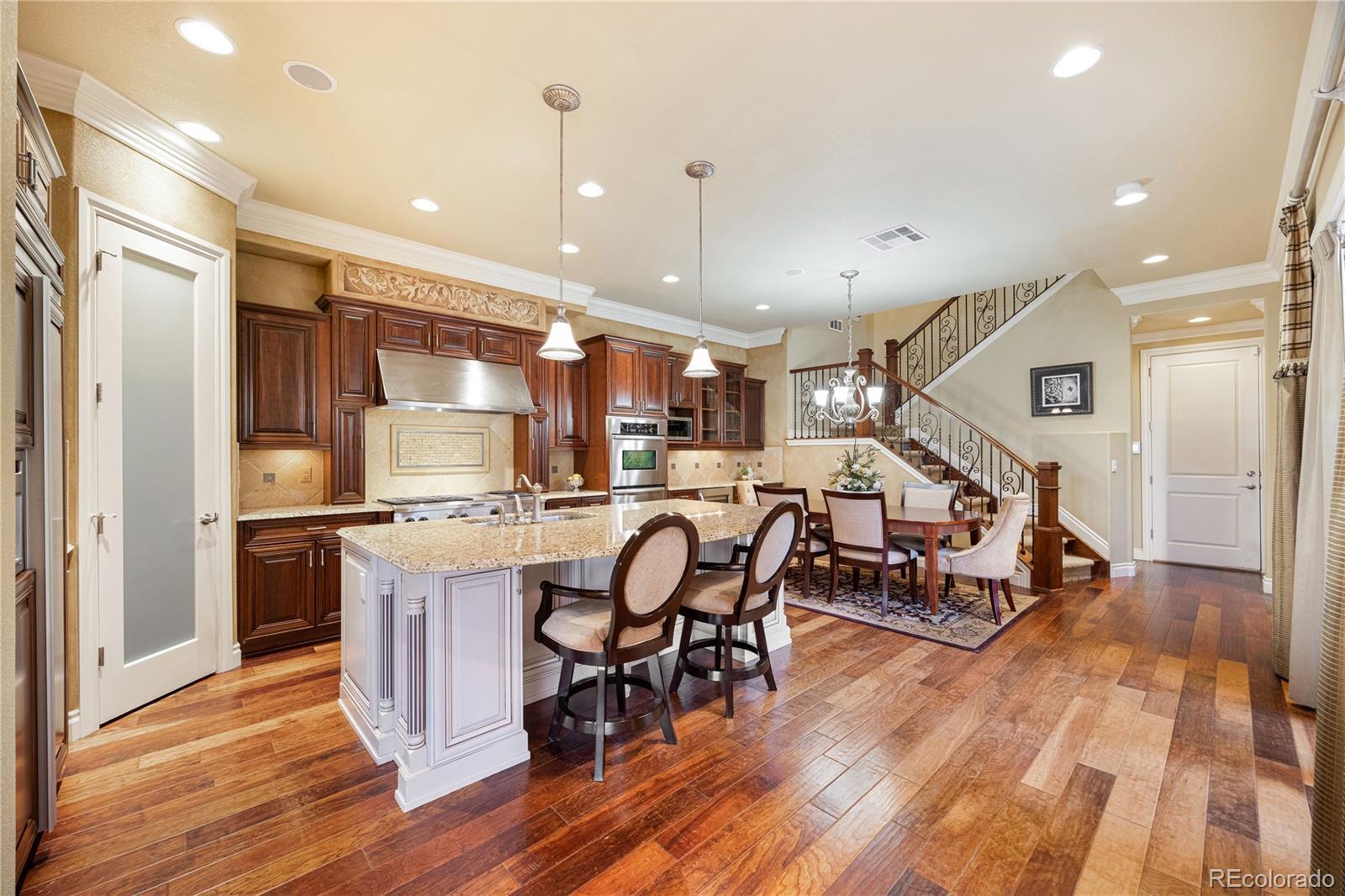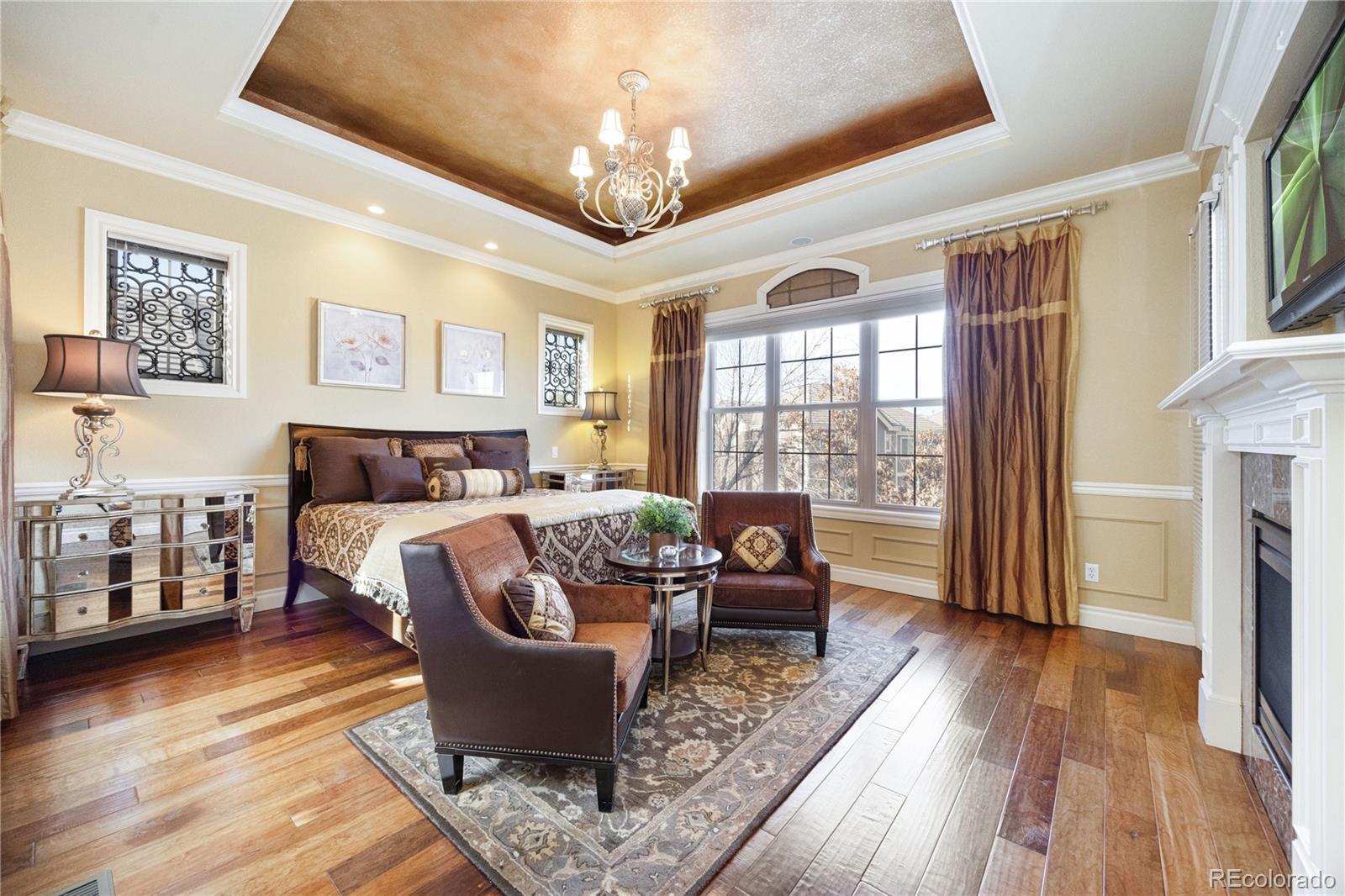 FORMER MODEL HOME! Prepare to be impressed from the moment you step inside this meticulously maintained end-unit Townhome with luxurious Model Home décor with every premium upgrade the builder offered. Gleaming hardwood floors flow throughout the main level while custom crown molding adds sophistication to every room. The inviting Living room showcases a gas fireplace, built-in shelving, and custom window accents. The chef's Kitchen features a custom island with additional storage, built-in refrigerator, walk-in pantry, granite counters, and high-end appliances including gas cooktop with griddle and range hood, double ovens, and wine refrigerator. Step through the large slider from the kitchen or main floor office into your private enclosed courtyard featuring custom brick built-in BBQ, fireplace, and wine fridge perfect for entertaining! The expansive master suite will take your breath away with its sitting area complete with coffee station and mini-fridge. The master bedroom boasts tray ceiling, large windows, gas fireplace, and access to the upstairs balcony. Indulge in the spa-like 5-piece master bath with jetted soaking tub and large walk-in closet. Two additional bedrooms and spacious loft provide versatile living space, with the 3rd bedroom set up as a home gym featuring mirrored wall, 4 TV's, and beverage station! The end-unit position includes a 3-car garage with finished drywall and Elfa storage system. Unbeatable location, walk to the Library or Arts Center! Centrally positioned near I-25 in the heart of Lone Tree, less than a mile from light rail station for easy commutes to Denver or airport. Park Meadows mall and Bluffs Regional Park nearby.The property will be sold fully furnished. Experience model home elegance with low-maintenance luxury. Schedule your showing today! Click here to see Video tour: https://youtube.com/shorts/1H-XcvEsvSQ?si=YsIFCRlisc2hux6c OPEN HOUSE Saturday, Jan 10th 11AM-3PM