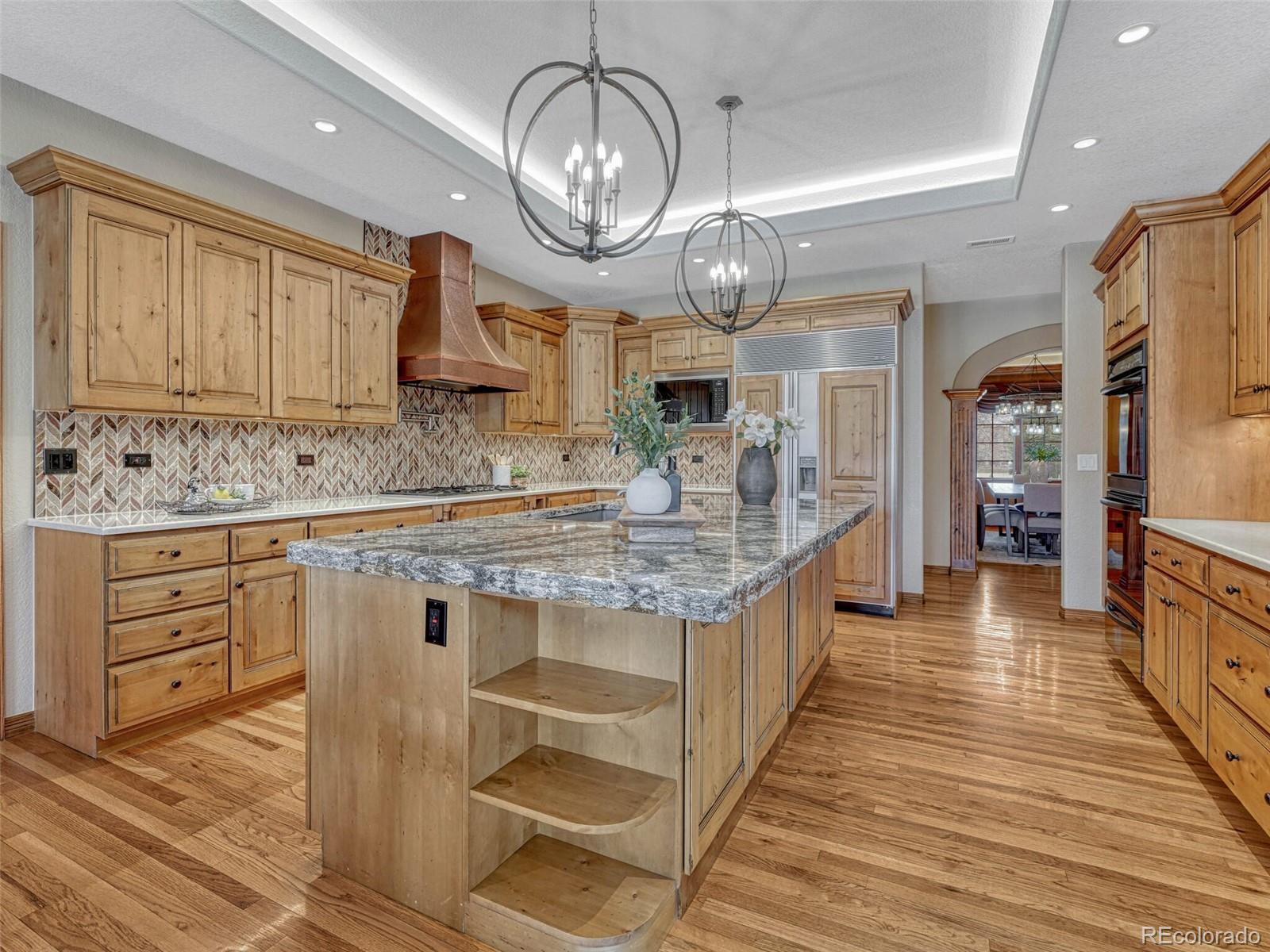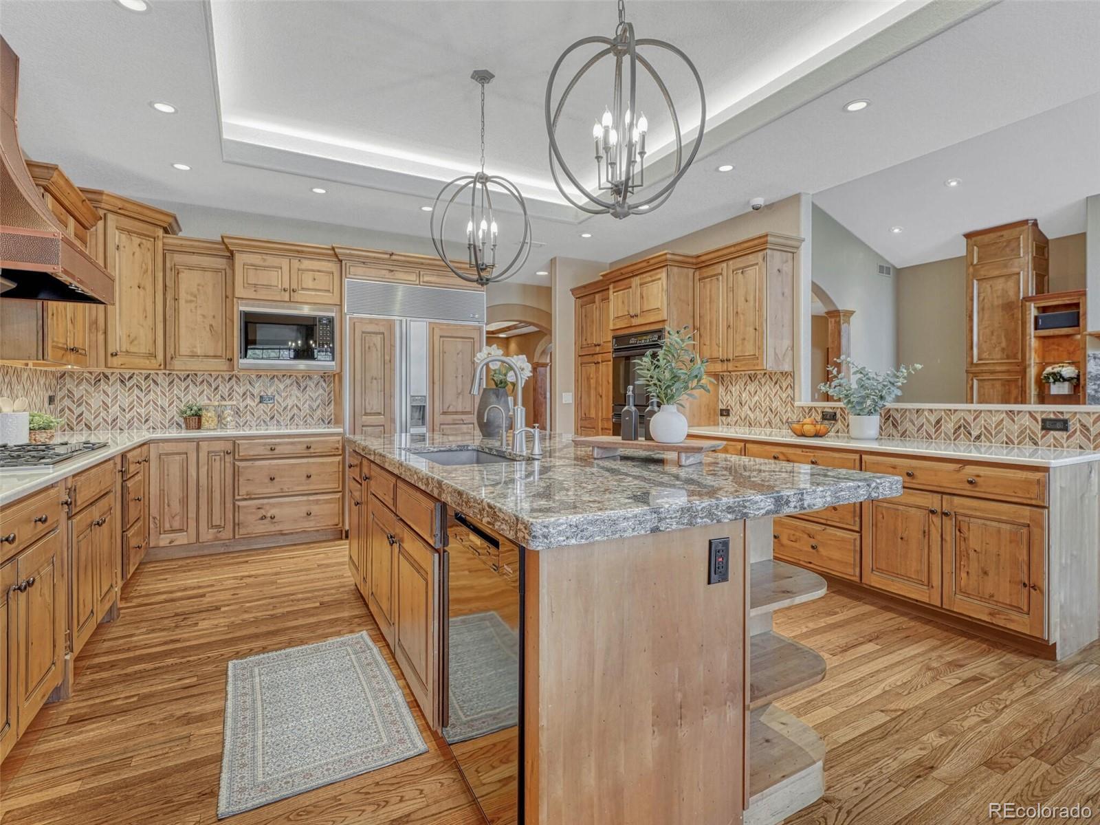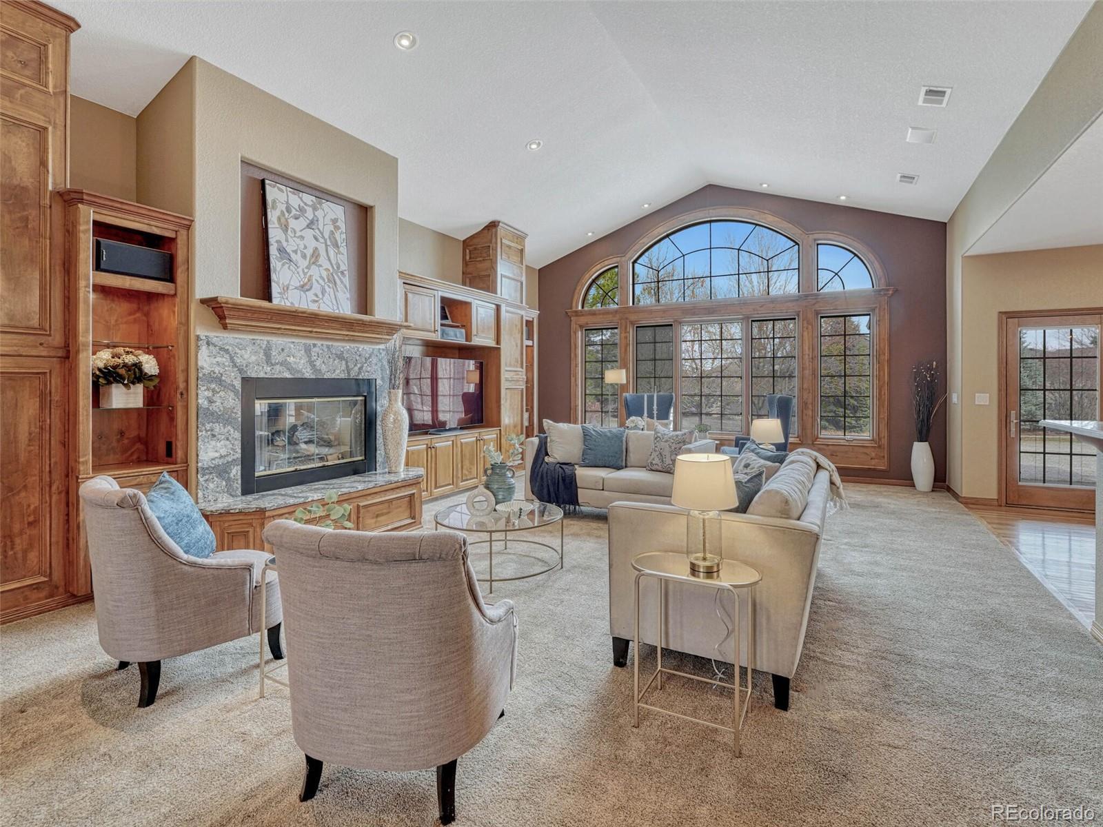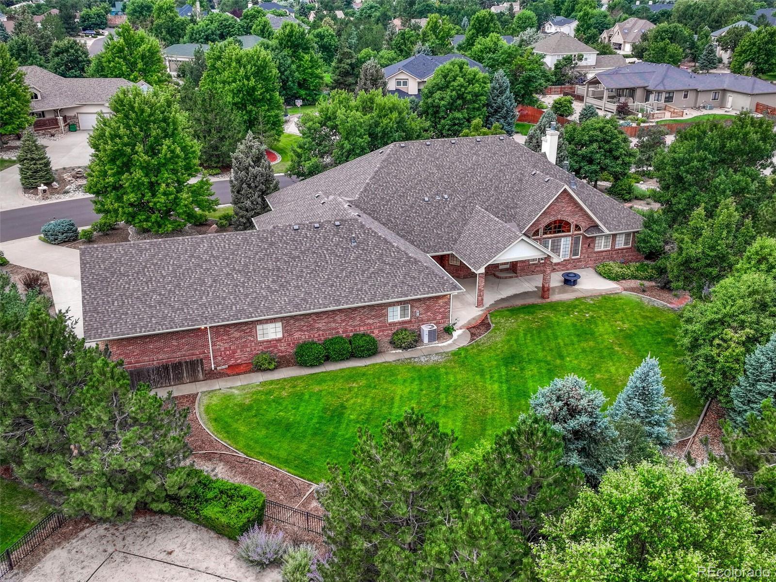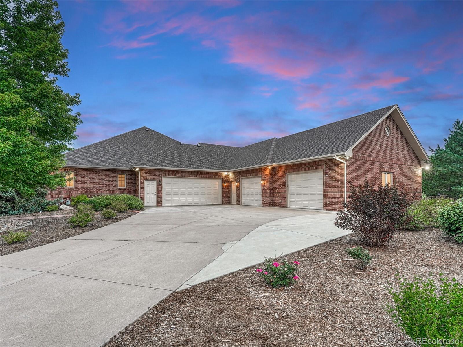 Tucked away in a quiet cul-de-sac, this all-brick ranch-style estate offers rare privacy, refined design, and impressive scale. Set on a beautifully landscaped three-quarter-acre lot, the home features 8,370 square feet of thoughtfully crafted living space—ideal for both entertaining and everyday comfort. Step inside to a light-filled, elegant interior where timeless finishes meet modern function. The expansive main level flows seamlessly from the living room to the gourmet kitchen, complete with granite countertops, a walk-in pantry, top-tier appliances and a grand center island. A cozy breakfast nook opens to the patio, blending indoor-outdoor living. The primary suite offers coved ceilings, a fireplace, sitting area or office, walk-in closet and spa-inspired bath with soaking tub, dual vanities and walk-in shower. Two additional bedrooms share a Jack-and-Jill bath. The main level also features a guest bath and spacious laundry room with built-ins. The finished basement is an entertainer’s dream, with a wet bar, media lounge, expansive game area, two additional bedrooms, full bath, two flexible bonus rooms, an oversized storage room and a dedicated workshop. Outside, enjoy a peaceful backyard retreat with a covered patio, professional landscaping, concrete edging and custom lighting. For car enthusiasts, hobbyists, or home-based business owners, this home offers a rare 2,600 square feet of garage space—including a two-car attached garage with an adjacent workshop, plus two oversized one-car garages with room for multiple vehicles and storage. Just steps from Meadow Hills Golf Course and minutes to Cherry Creek State Park, this home places outdoor recreation right at your doorstep. Located within the top-rated Cherry Creek School District, you’ll also enjoy easy access to shopping, dining, the Nine Mile Light Rail Station and major highways—making commutes to the Denver Tech Center or Downtown Denver a breeze.