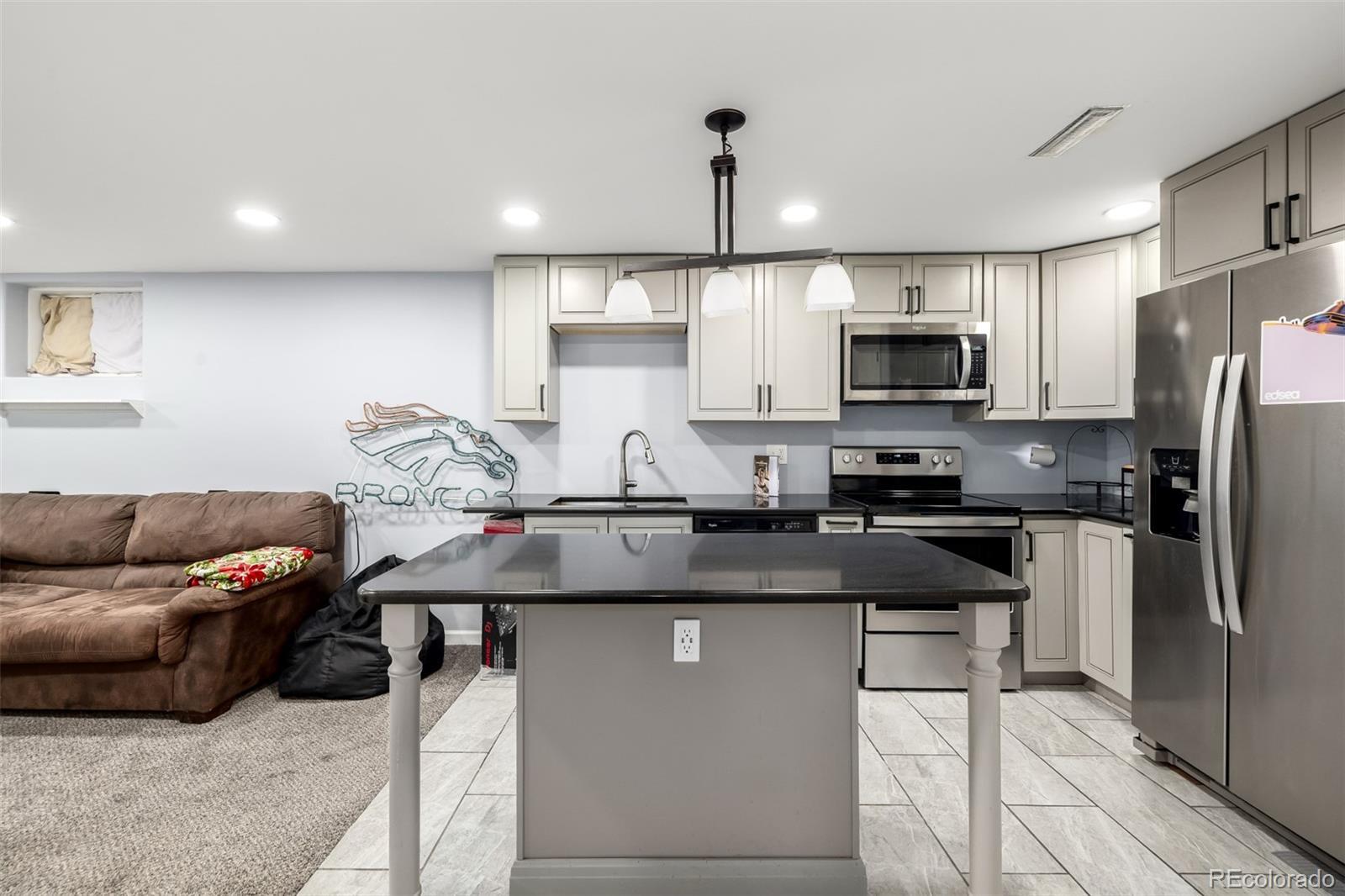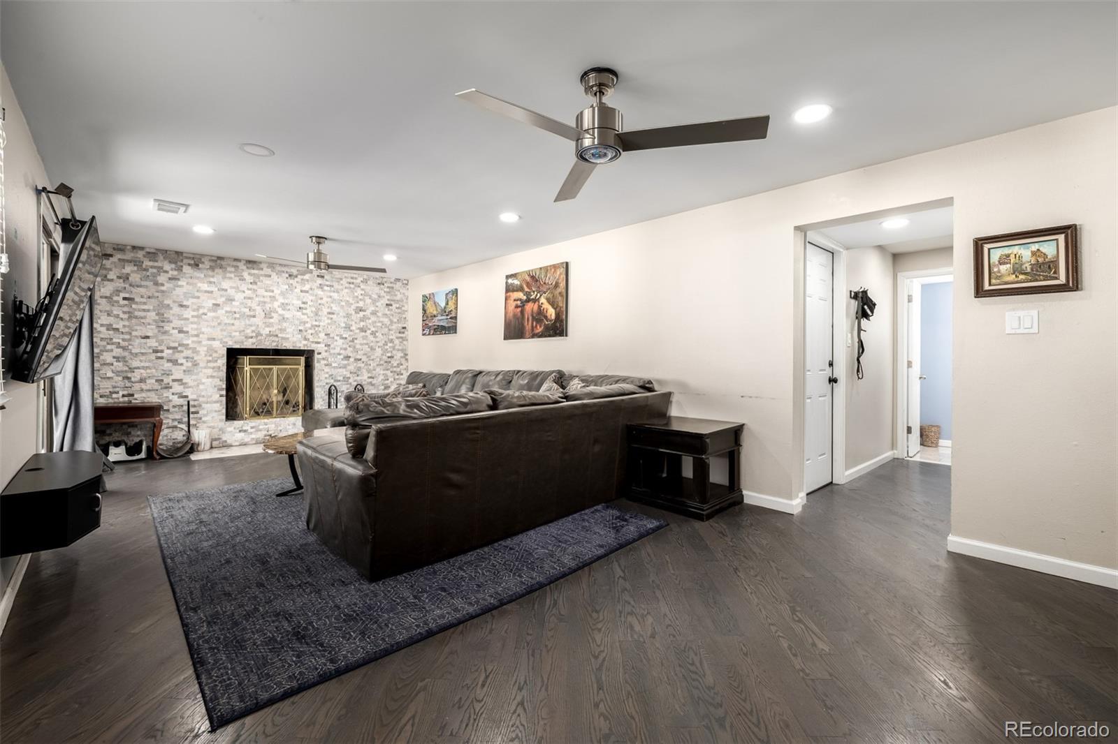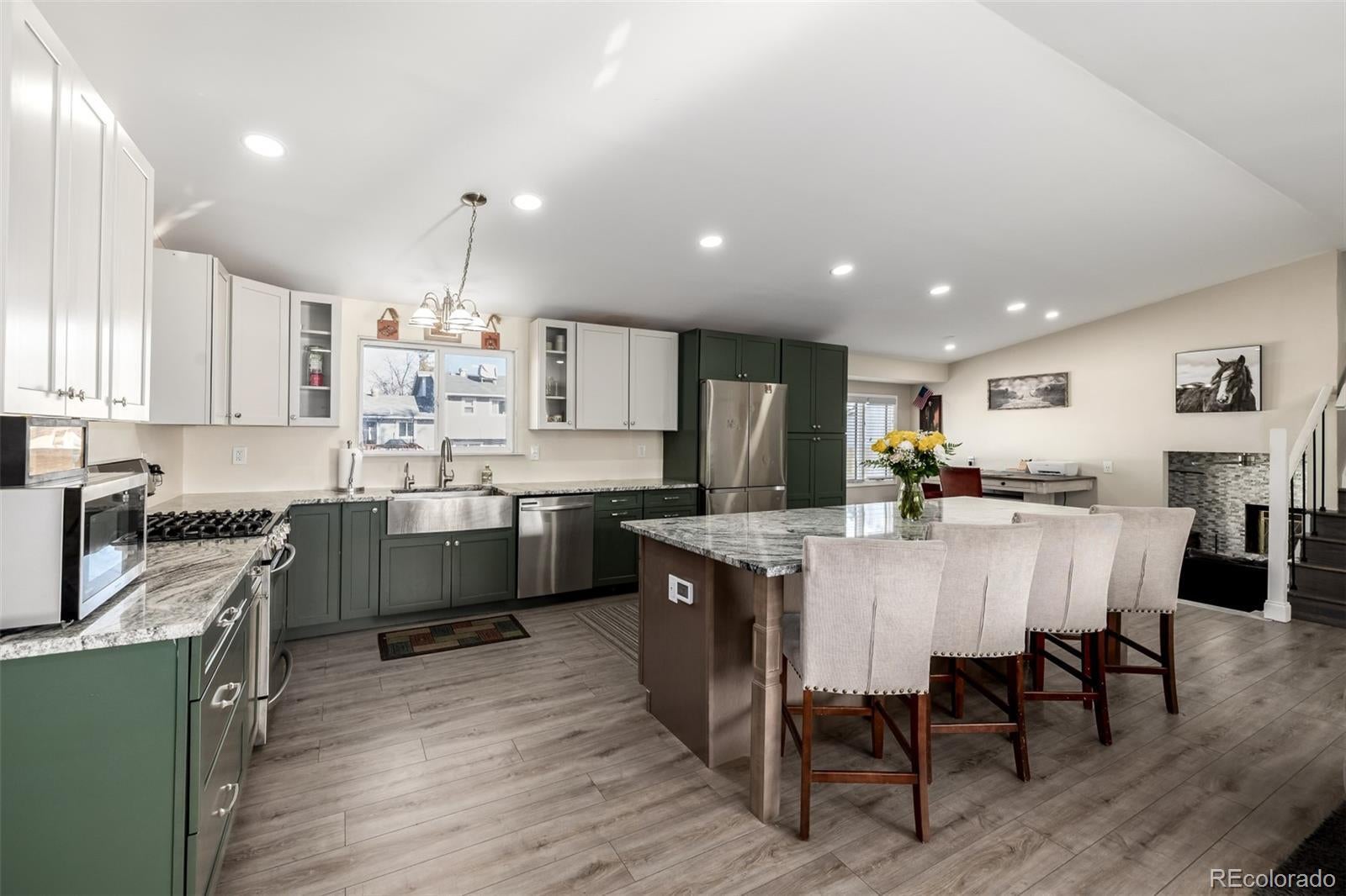 This stunning, completely updated property in highly sought-after Arvada seamlessly blends modern sophistication with functional design and an unbeatable location. Just an 8-minute drive from vibrant Old Town Arvada with its shops, restaurants, and breweries, you'll enjoy the perfect balance of peaceful residential living and urban convenience. Outdoor enthusiasts will love being only 3 minutes from Indian Tree Golf Club, 10 minutes from Standley Lake Regional Park and Wildlife Refuge for paddleboarding, running, biking, hiking, and birding, and just 15 minutes from Westminster Open Space's off-leash dog area. The showstopping 2025 kitchen renovation features elegant two-tone cabinetry with soft-close doors and drawers, a deep farmhouse sink, premium granite countertops, and a spacious center island perfect for entertaining. Brand-new stainless steel appliances include a gas range, built-in microwave, and refrigerator, all complemented by stylish lighting. Durable LVP flooring flows throughout the main level, while the open layout connects to the inviting family room featuring a striking white wood-burning fireplace as the focal point. Gorgeous 100% red oak hardwood floors grace both levels, adding warmth and timeless appeal. The completely remodeled 2023 bathroom showcases designer tile work, a custom dual-sink vanity with decorative cabinetry, and spa-like finishes. Modern comfort is ensured with a new 2025 HVAC system enhanced by a hospital-grade steam humidification system throughout for optimal air quality. The upgraded 200 AMP electrical panel with new recessed LED lighting supports all your modern power needs, while fresh exterior paint applied just 4 months ago enhances curb appeal. The fully fenced yard provides privacy and security, while generous parking easily accommodates trailers or RVs. The professionally completed lockout basement features a full kitchen, bathroom, and private entry for excellent rental income potential or flexible living.