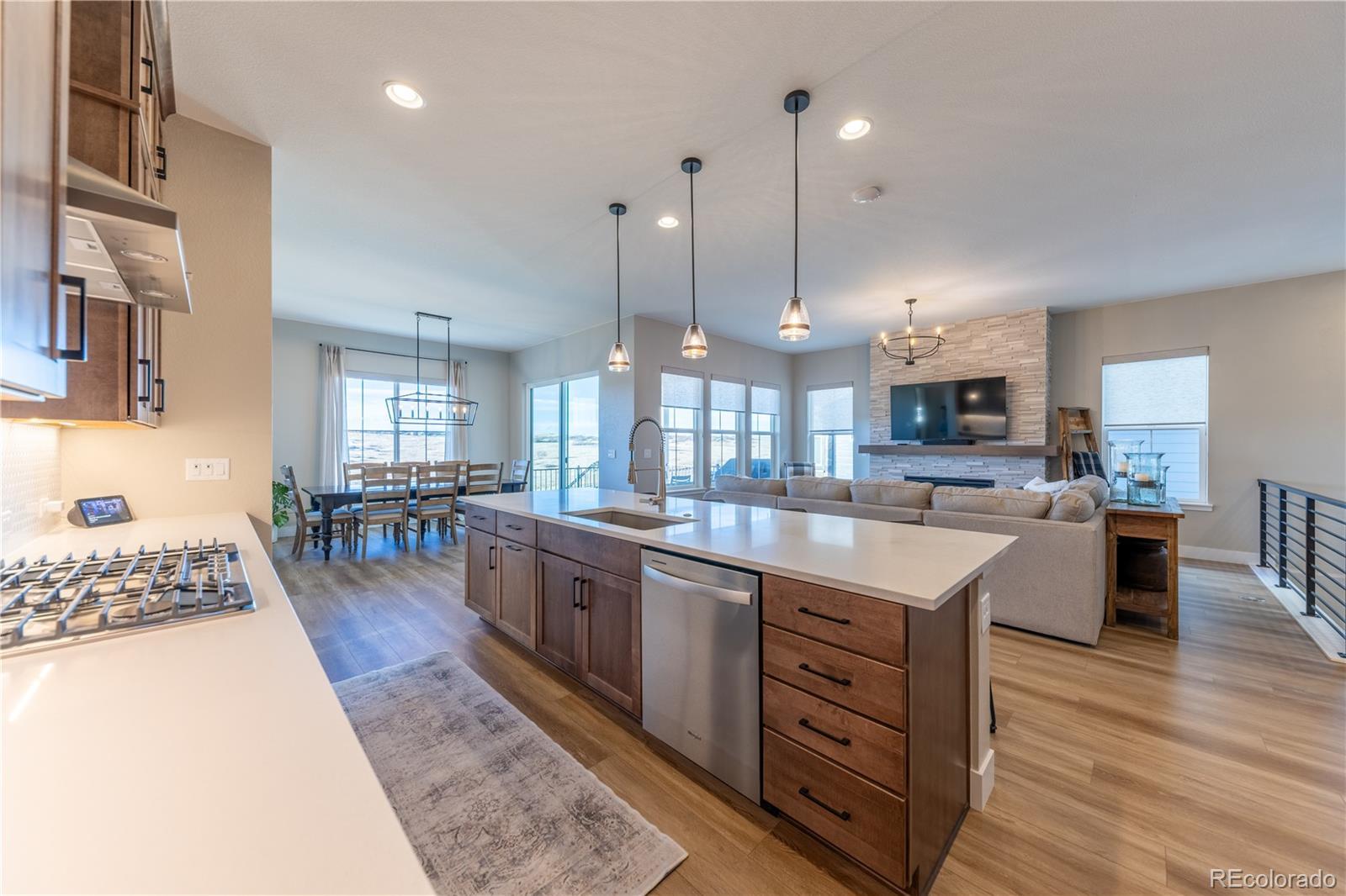 Exceptional Single-Story Home with Finished Walk-Out Basement Backing Open Space in The Canyons. Enjoy breathtaking sunsets and serene open-space views from both the covered back deck and expansive basement patio of this beautifully finished walk-out ranch, positioned on a premium lot. Numerous recent upgrades and high-quality finishes completed within the past few months make this home truly move-in ready—a must-see! Inside, elevated design shines throughout with soaring 10’ main-level ceilings and a stunning open gourmet kitchen featuring ceiling-height upper stacker cabinets, premium cabinetry, and an expansive layout ideal for both everyday living and entertaining. The enlarged laundry room offers extensive custom cabinetry for exceptional storage and convenience. Wide-plank LVP/laminate flooring flows seamlessly across the main level and down the stairs, complemented by a custom stair railing that enhances the home’s open, modern aesthetic. The serene primary suite is a true retreat, complete with a spa-inspired five-piece bath highlighted by a brand-new freestanding soaking tub. Custom plantation shutters grace the main-level bedrooms, while the great room and dining area are finished with elegant custom blinds. The newly completed walk-out basement significantly expands the home’s living space, offering a spacious media/bonus room, an impressive wet bar with beverage refrigerator, dishwasher, and disposal, a bright secondary great room, a generously sized bedroom with a large walk-in closet, and abundant, thoughtfully organized storage. Outdoor living is equally refined with professional landscaping, an expansive concrete patio, a 3’ concrete side walkway, and widened driveway pads for easy parking and garage access. Beautifully maintained and truly MOVE-IN READY. Residents enjoy resort-style amenities including scenic trails, pickleball courts, a pool, clubhouse, The Exchange coffee house, and the new Canyon House restaurant—all just moments from your door.