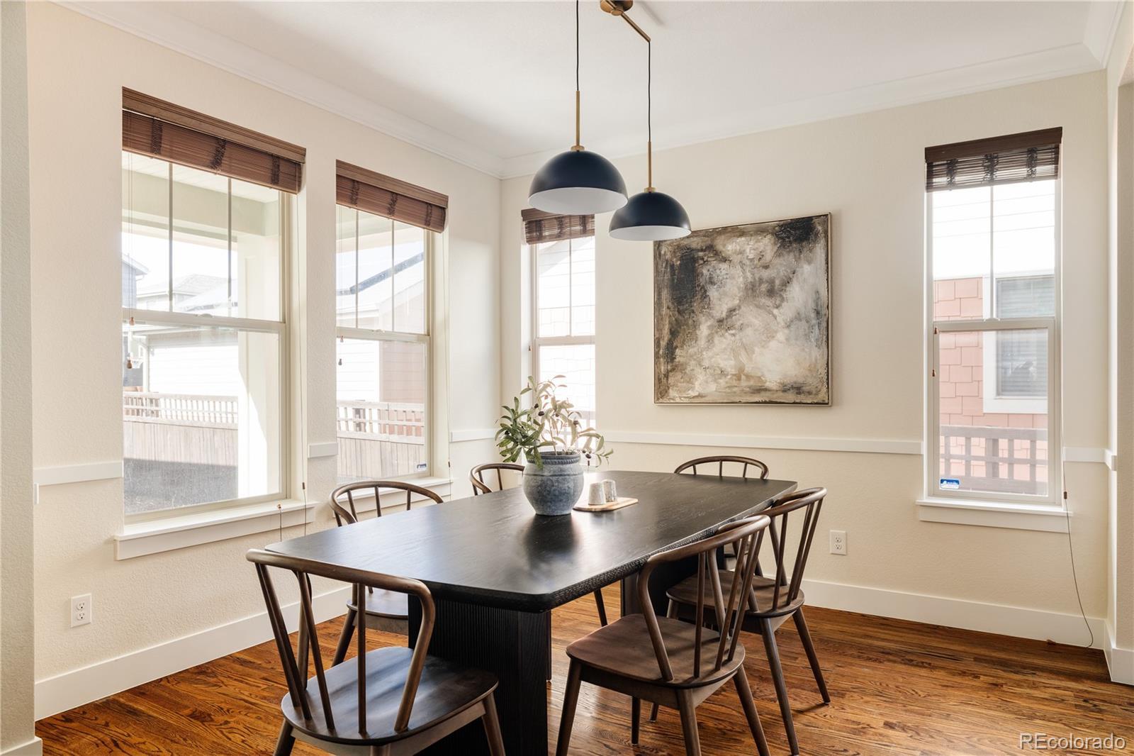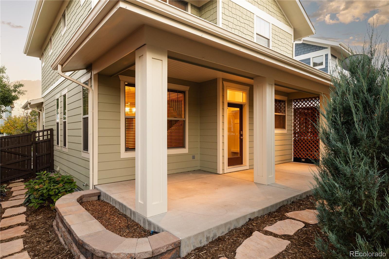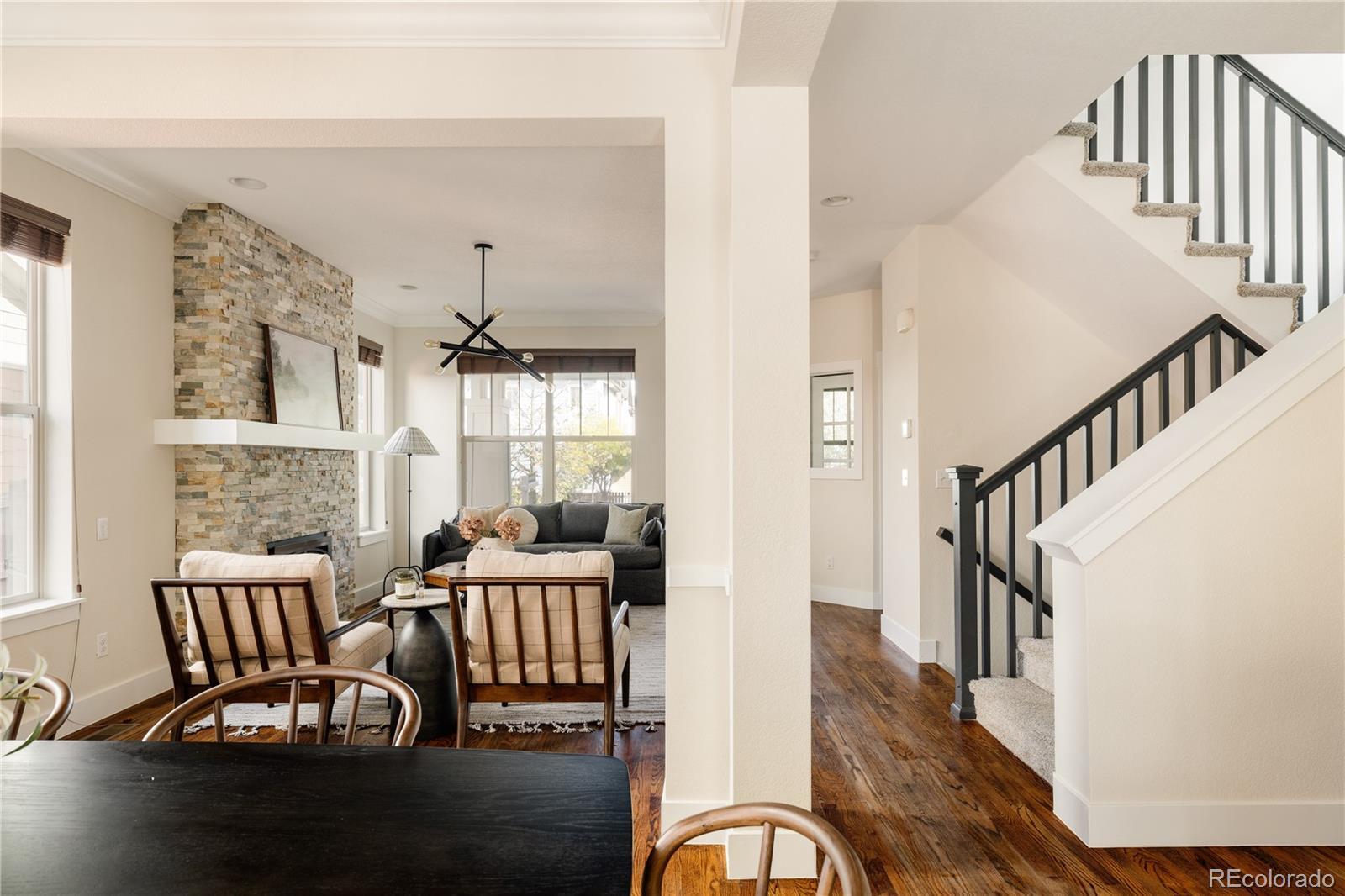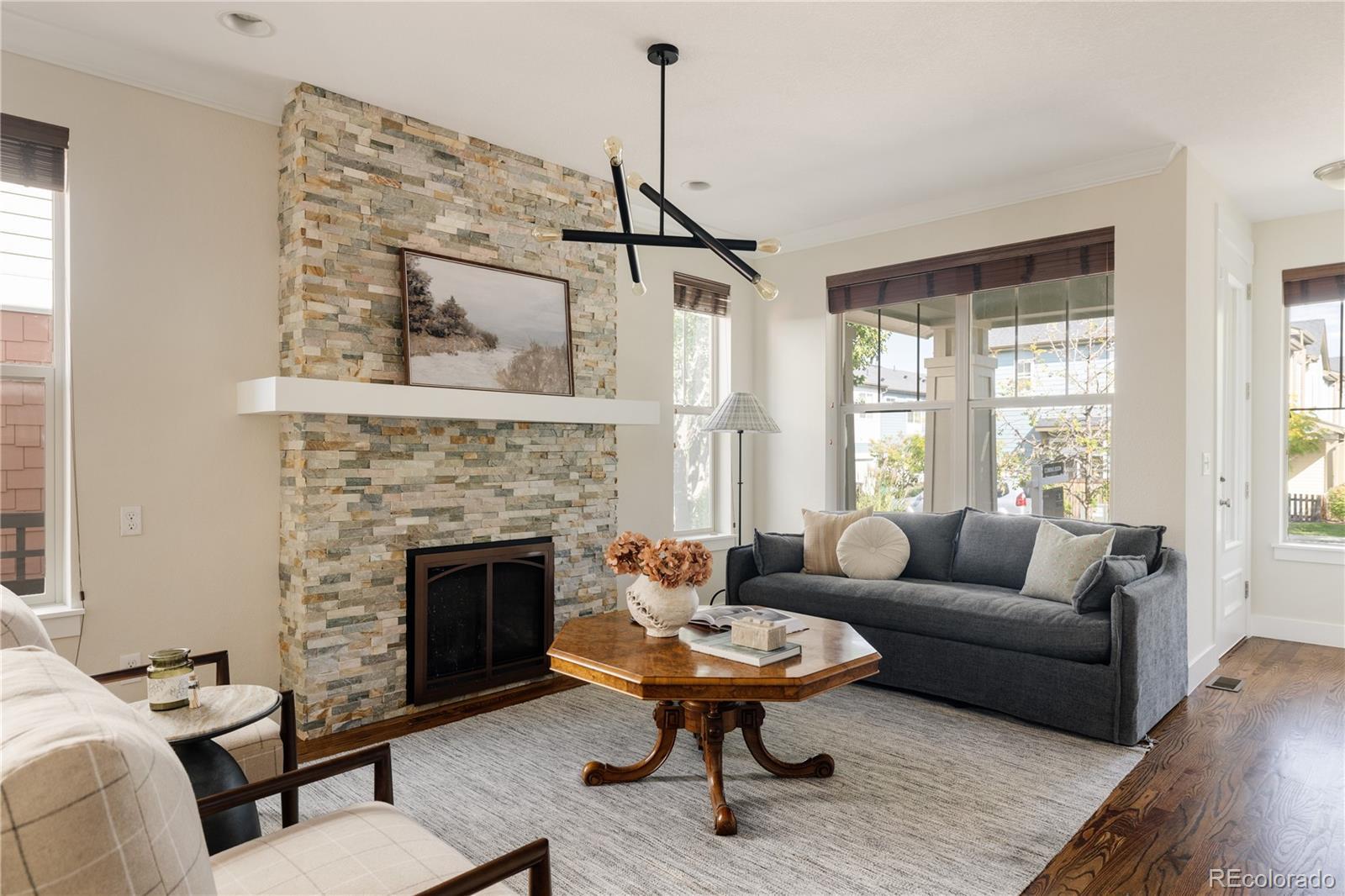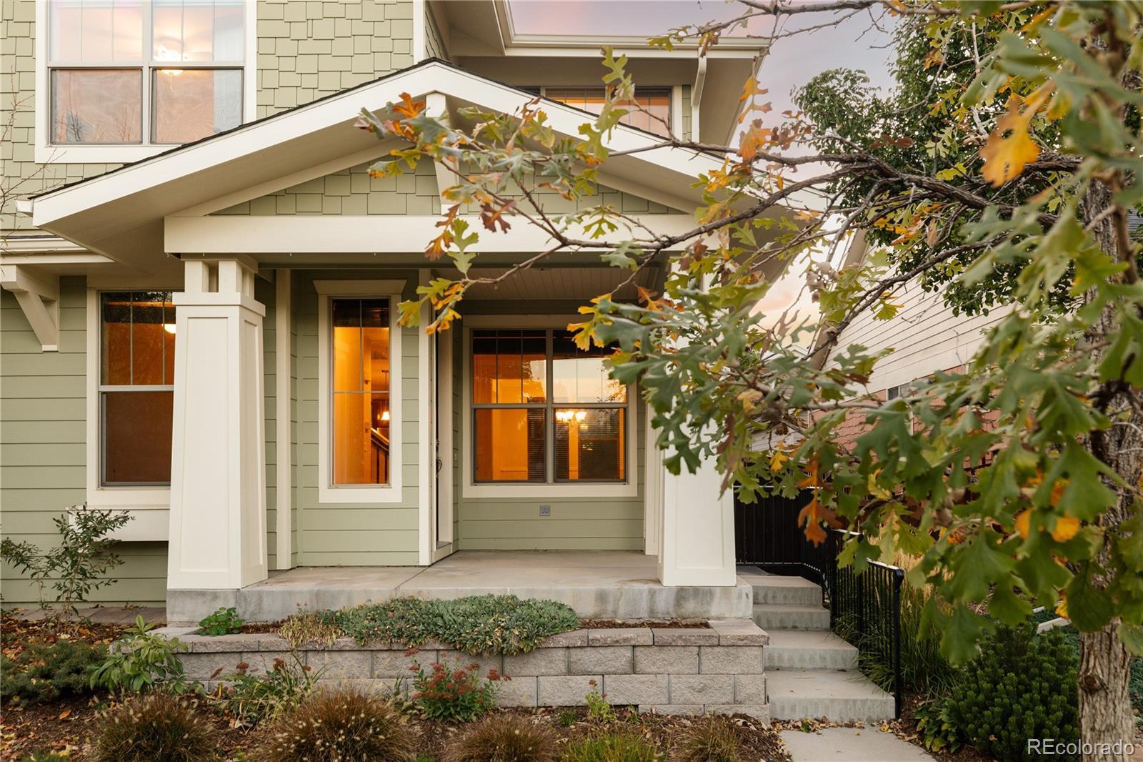 Beautifully upgraded 4-bed, 4-bath home in the heart of Central Park. The inviting front porch sets the tone, an ideal spot for morning coffee or evenings greeting neighbors. Inside discover a spacious open floor plan with gleaming hardwood floors & abundant natural light. Just off the entry is a dedicated private study, a perfect space tucked away from the main living areas. The main level flows effortlessly between the living, dining, & kitchen areas, making it an entertainer’s dream. The living room features a stunning stone wall with a gas fireplace, complete with a temperature-sensing remote. The chef’s kitchen boasts quartz countertops, 42” cabinets, stainless steel appliances including a newer fridge, dishwasher & microwave, under-cabinet lighting, & a gas range. An instant hot water tap & a large island with seating complete the space. Step out to the oversized covered back patio w/a stained fence, planter boxes, & low-maintenance landscaping, an outdoor retreat for entertaining & relaxation. Upstairs, the luxurious primary suite features a spa-inspired 5-piece bath & upgraded finishes, accompanied by two additional beds, a hall bath, & a convenient laundry room. Custom Hunter Douglas blinds elevate each room. The finished basement expands living space with 9-foot ceilings, luxury vinyl plank flooring, a large second living area, bedroom, full bathroom, & storage room—perfect for guests, hobbies, or movie nights. Additional upgrades include fresh interior paint, new carpet, a whole-house humidifier, high-efficiency furnace, newer water heater, recently painted exterior, oversized 2-car garage with extra storage, custom window blinds, programmable thermostat, & smart locks. Ideally situated on a low-traffic, non-through street, this home is just minutes from Central Park Rec Center, Aviator Pool, 29th Ave Town Center, Eastbridge Town Center, A-Line Light Rail, FlyteCo Tower, Stanley Marketplace, The Shops at Northfield, & miles of trails & green space.