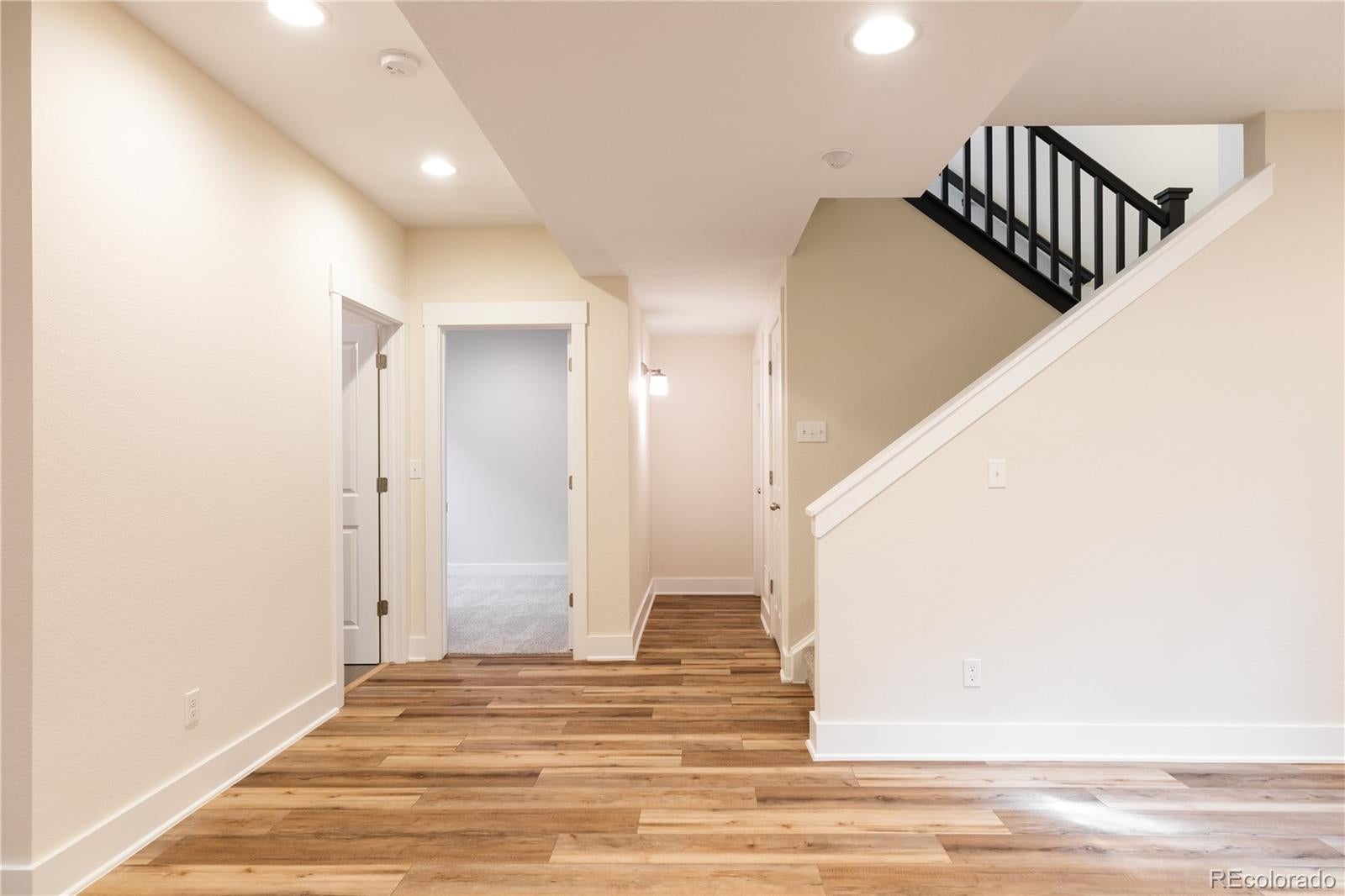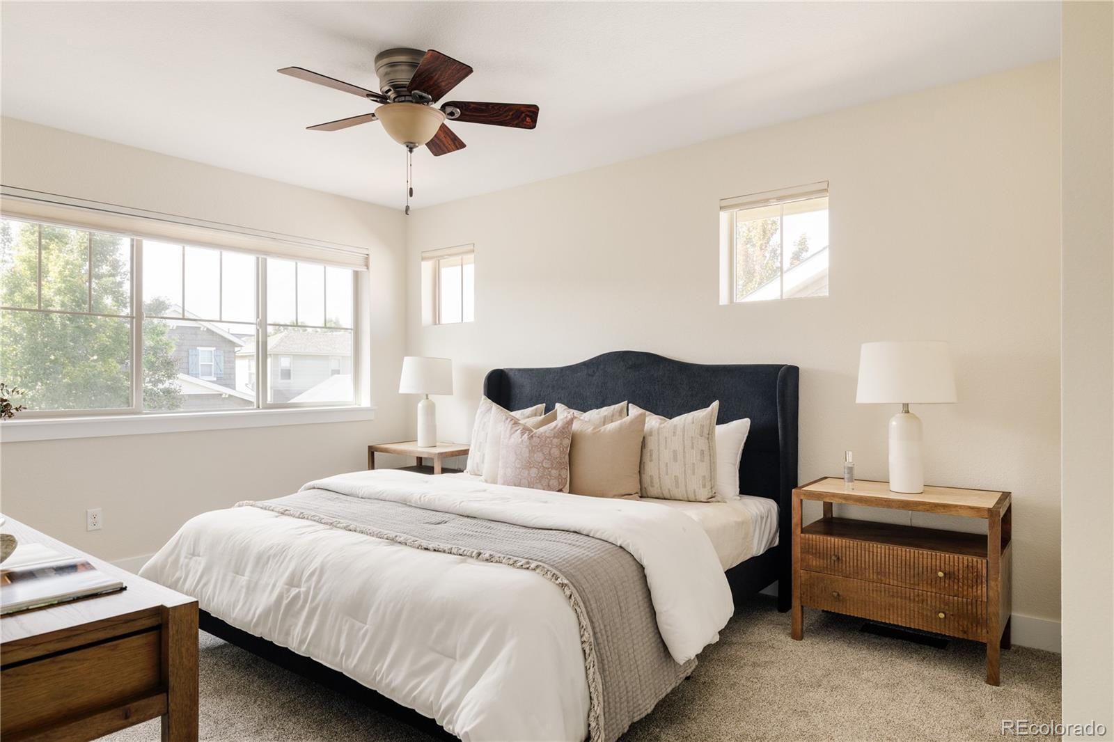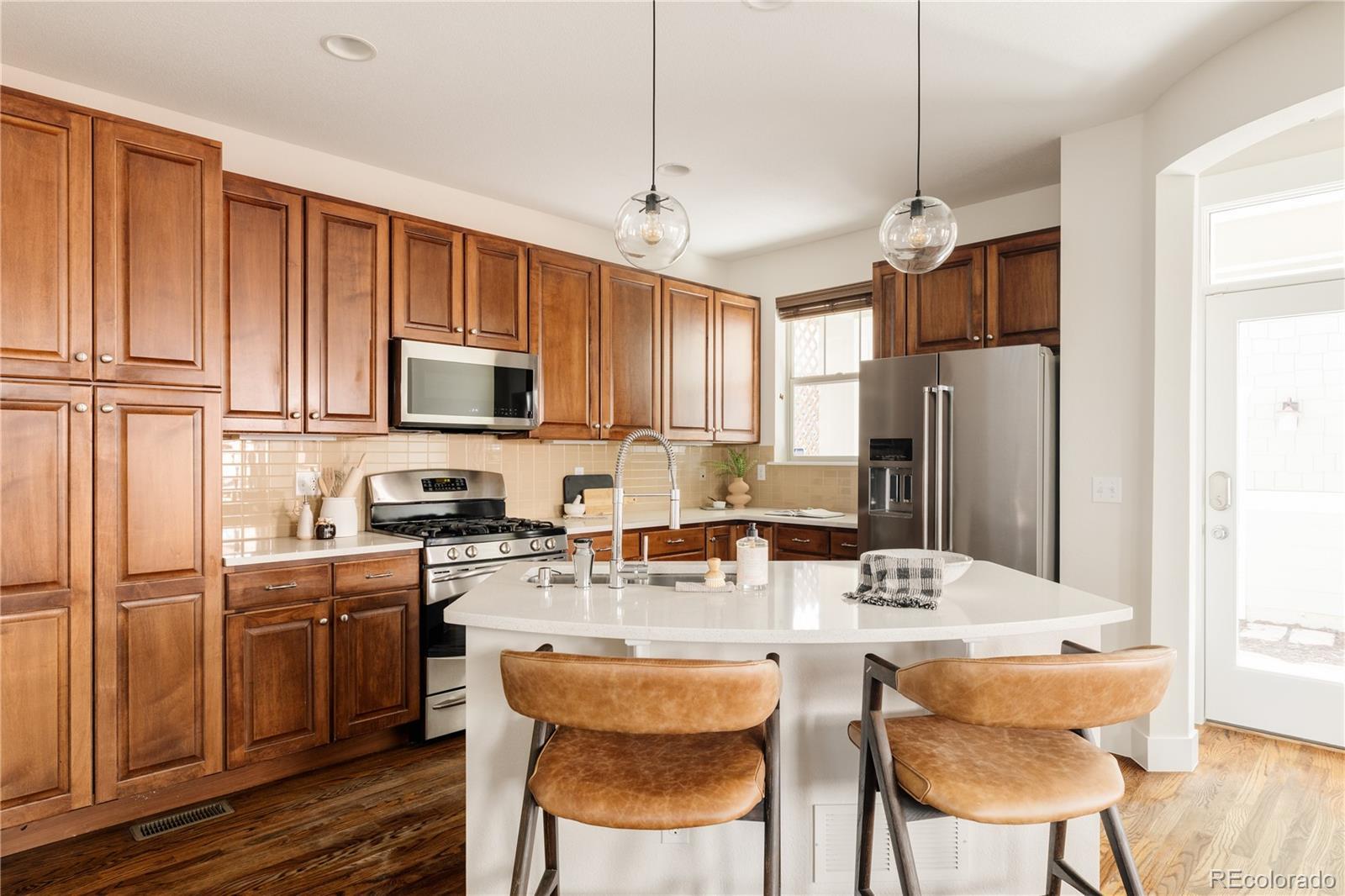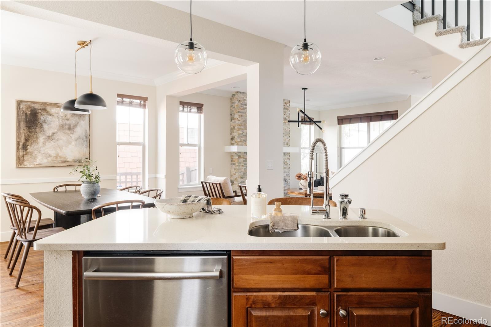 Beautifully upgraded 4-bed, 4-bath home in the heart of Central Park. The inviting front porch sets the tone, an ideal spot for morning coffee or evenings greeting neighbors. Inside discover a spacious open floor plan with gleaming hardwood floors & abundant natural light. Just off the entry is a dedicated private study, a perfect space tucked away from the main living areas. The main level flows effortlessly between the living, dining, & kitchen areas, making it an entertainer’s dream. The living room features a stunning stone wall with a gas fireplace, complete with a temperature-sensing remote. The chef’s kitchen boasts quartz countertops, 42” cabinets, stainless steel appliances including a newer fridge, dishwasher & microwave, under-cabinet lighting, & a gas range. An instant hot water tap & a large island with seating complete the space. Step out to the oversized covered back patio w/a stained fence, planter boxes, & low-maintenance landscaping, an outdoor retreat for entertaining & relaxation. Upstairs, the luxurious primary suite features a spa-inspired 5-piece bath & upgraded finishes, accompanied by two additional beds, a hall bath, & a convenient laundry room. Custom Hunter Douglas blinds elevate each room. The finished basement expands living space with 9-foot ceilings, luxury vinyl plank flooring, a large second living area, bedroom, full bathroom, & storage room—perfect for guests, hobbies, or movie nights. Additional upgrades include fresh interior paint, new carpet, a whole-house humidifier, high-efficiency furnace, newer water heater, recently painted exterior, oversized 2-car garage with extra storage, custom window blinds, programmable thermostat, & smart locks. Ideally situated on a low-traffic, non-through street, this home is just minutes from Central Park Rec Center, Aviator Pool, 29th Ave Town Center, Eastbridge Town Center, A-Line Light Rail, FlyteCo Tower, Stanley Marketplace, The Shops at Northfield, & miles of trails & green space.