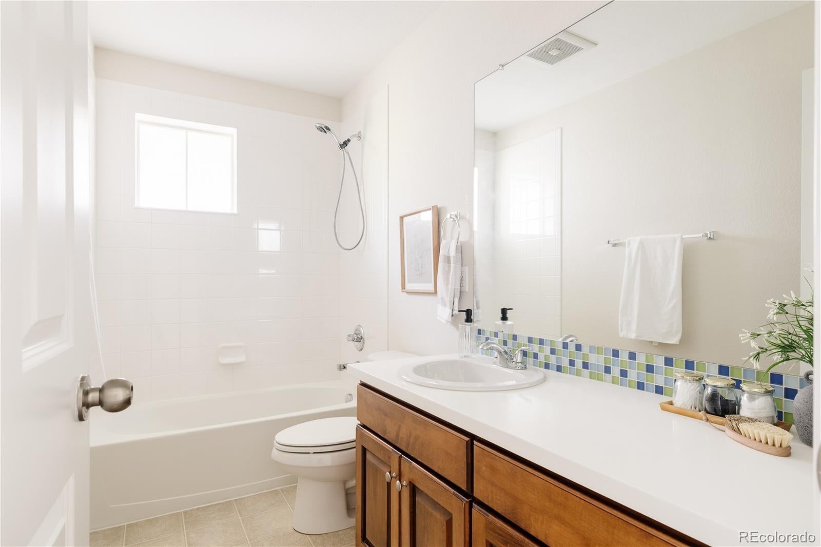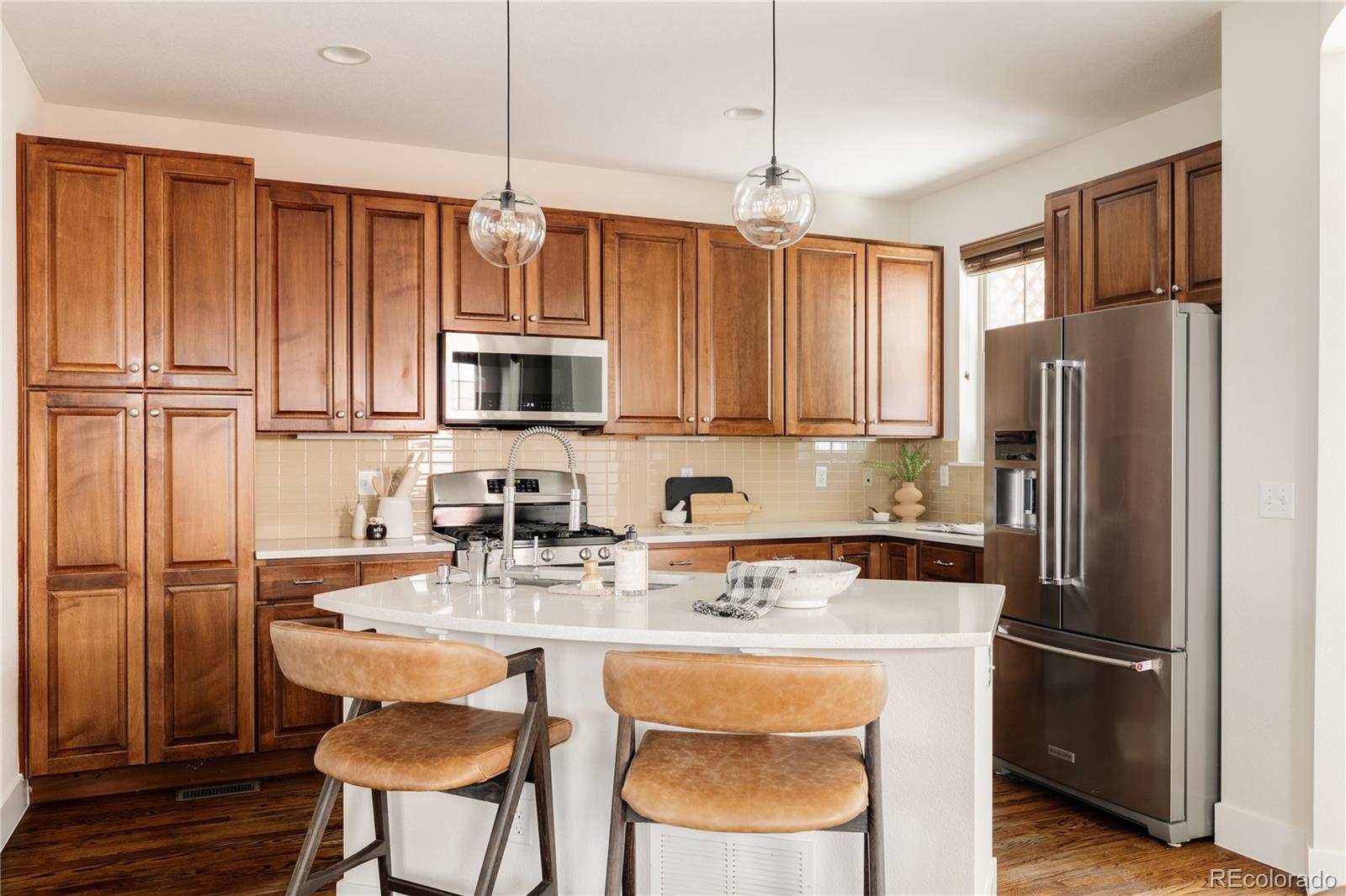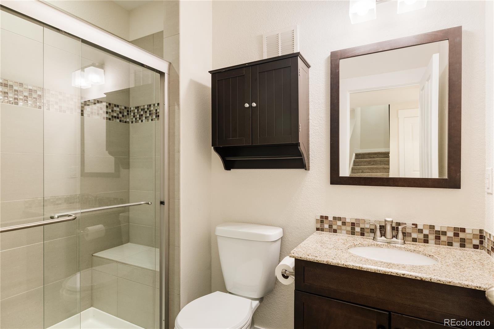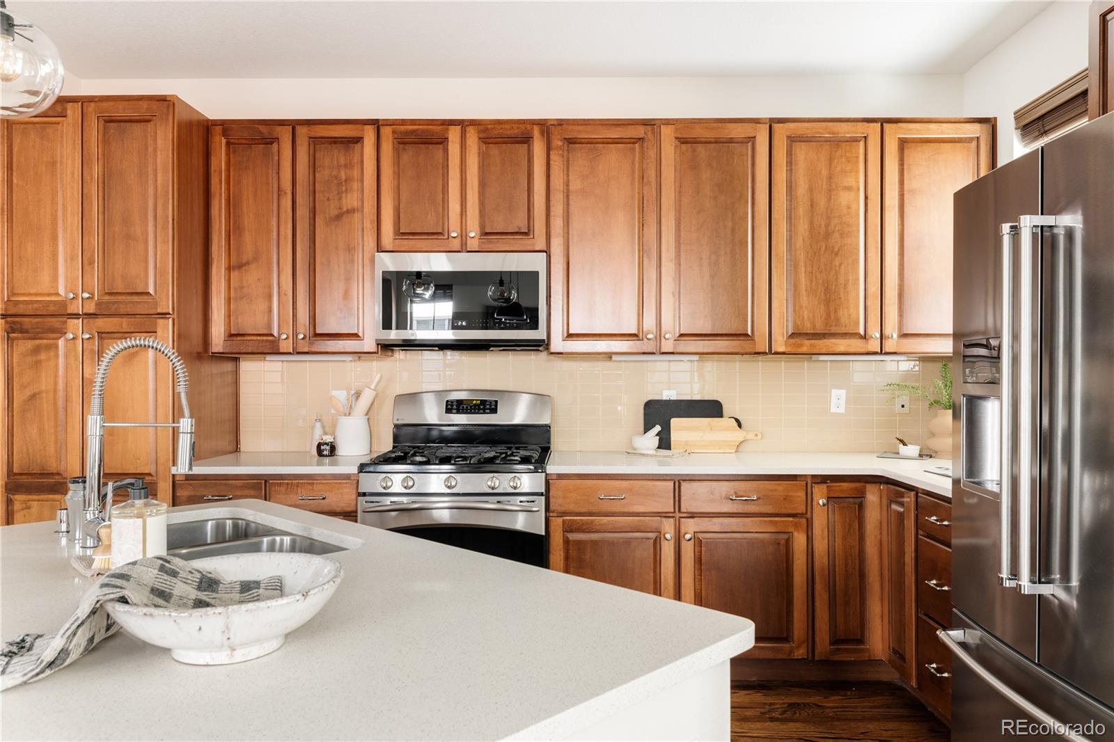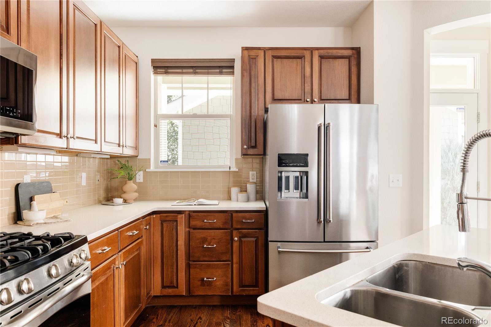 Beautifully upgraded 4-bed, 4-bath home in the heart of Central Park. The inviting front porch sets the tone, an ideal spot for morning coffee or evenings greeting neighbors. Inside discover a spacious open floor plan with gleaming hardwood floors & abundant natural light. Just off the entry is a dedicated private study, a perfect space tucked away from the main living areas. The main level flows effortlessly between the living, dining, & kitchen areas, making it an entertainer’s dream. The living room features a stunning stone wall with a gas fireplace, complete with a temperature-sensing remote. The chef’s kitchen boasts quartz countertops, 42” cabinets, stainless steel appliances including a newer fridge, dishwasher & microwave, under-cabinet lighting, & a gas range. An instant hot water tap & a large island with seating complete the space. Step out to the oversized covered back patio w/a stained fence, planter boxes, & low-maintenance landscaping, an outdoor retreat for entertaining & relaxation. Upstairs, the luxurious primary suite features a spa-inspired 5-piece bath & upgraded finishes, accompanied by two additional beds, a hall bath, & a convenient laundry room. Custom Hunter Douglas blinds elevate each room. The finished basement expands living space with 9-foot ceilings, luxury vinyl plank flooring, a large second living area, bedroom, full bathroom, & storage room—perfect for guests, hobbies, or movie nights. Additional upgrades include fresh interior paint, new carpet, a whole-house humidifier, high-efficiency furnace, newer water heater, recently painted exterior, oversized 2-car garage with extra storage, custom window blinds, programmable thermostat, & smart locks. Ideally situated on a low-traffic, non-through street, this home is just minutes from Central Park Rec Center, Aviator Pool, 29th Ave Town Center, Eastbridge Town Center, A-Line Light Rail, FlyteCo Tower, Stanley Marketplace, The Shops at Northfield, & miles of trails & green space.