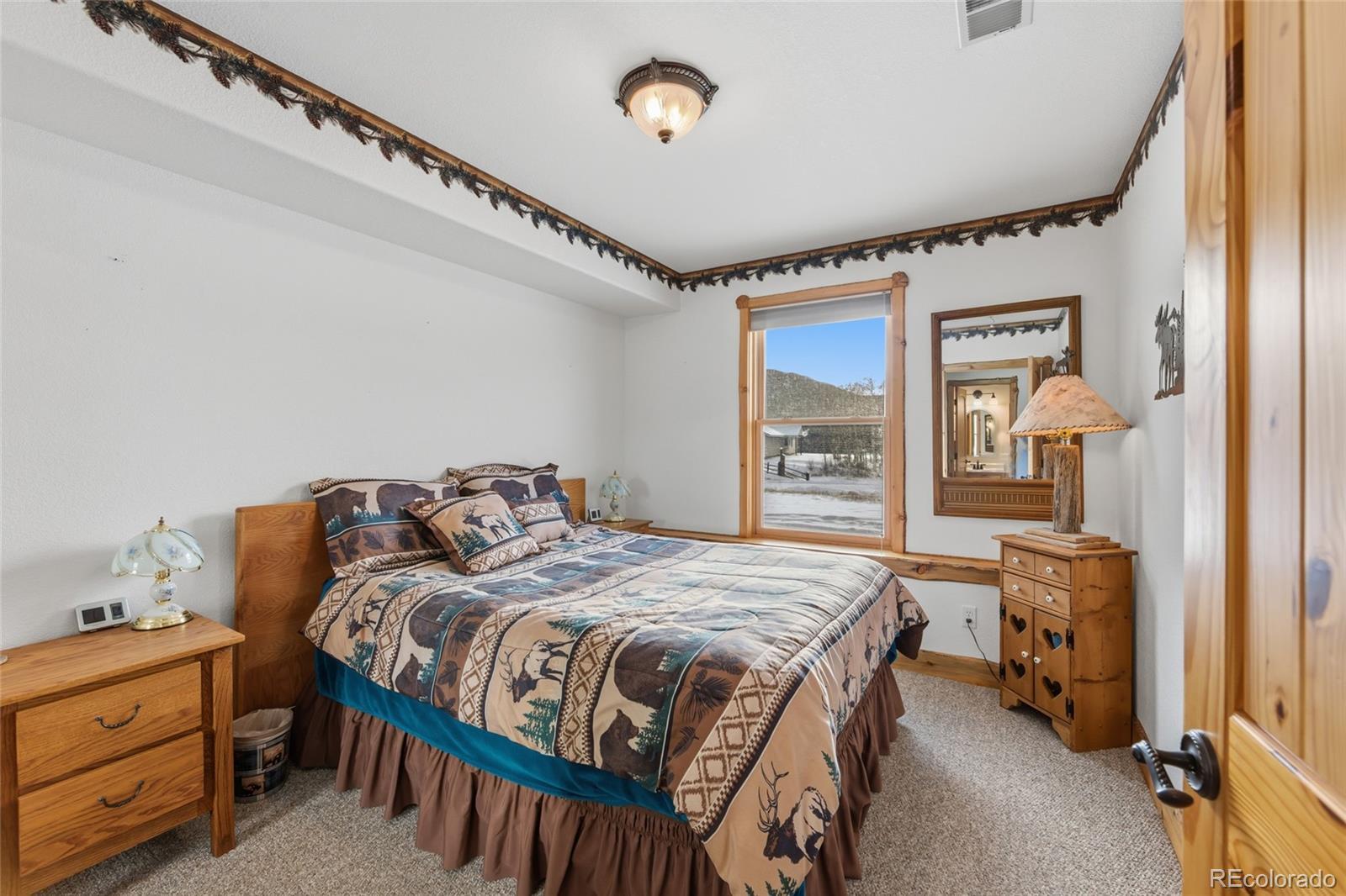 This exceptional 5 bedroom, 4 bath home sits on over 5 acres with sweeping mountain views and a beautiful mix of mature trees. The open-concept kitchen, dining, and living area creates a warm and inviting atmosphere, centered around a cozy woodstove. The spacious primary suite is a true sanctuary, featuring a large ensuite bath with a relaxing jetted tub. The finished basement adds even more living space with a generous recreation room and upgraded storage/utility room including 2 hot water heaters. Outside, functionality meets flexibility. The attached 1500 sqft garage includes a pull through bay and built-in dog kennel. An additional utility shed and greenhouse provide excellent options for storage, gardening, or small-scale homesteading. Zoned for horses and NO HOA! The stunning custom log staircase is crafted from natural timber, featuring thick solid-wood treads, rustic log railings, and a sculpted newel post that makes it a true architectural centerpiece with warm, lodge-style charm. Hand carved, live edge wood trim adds to the beauty.