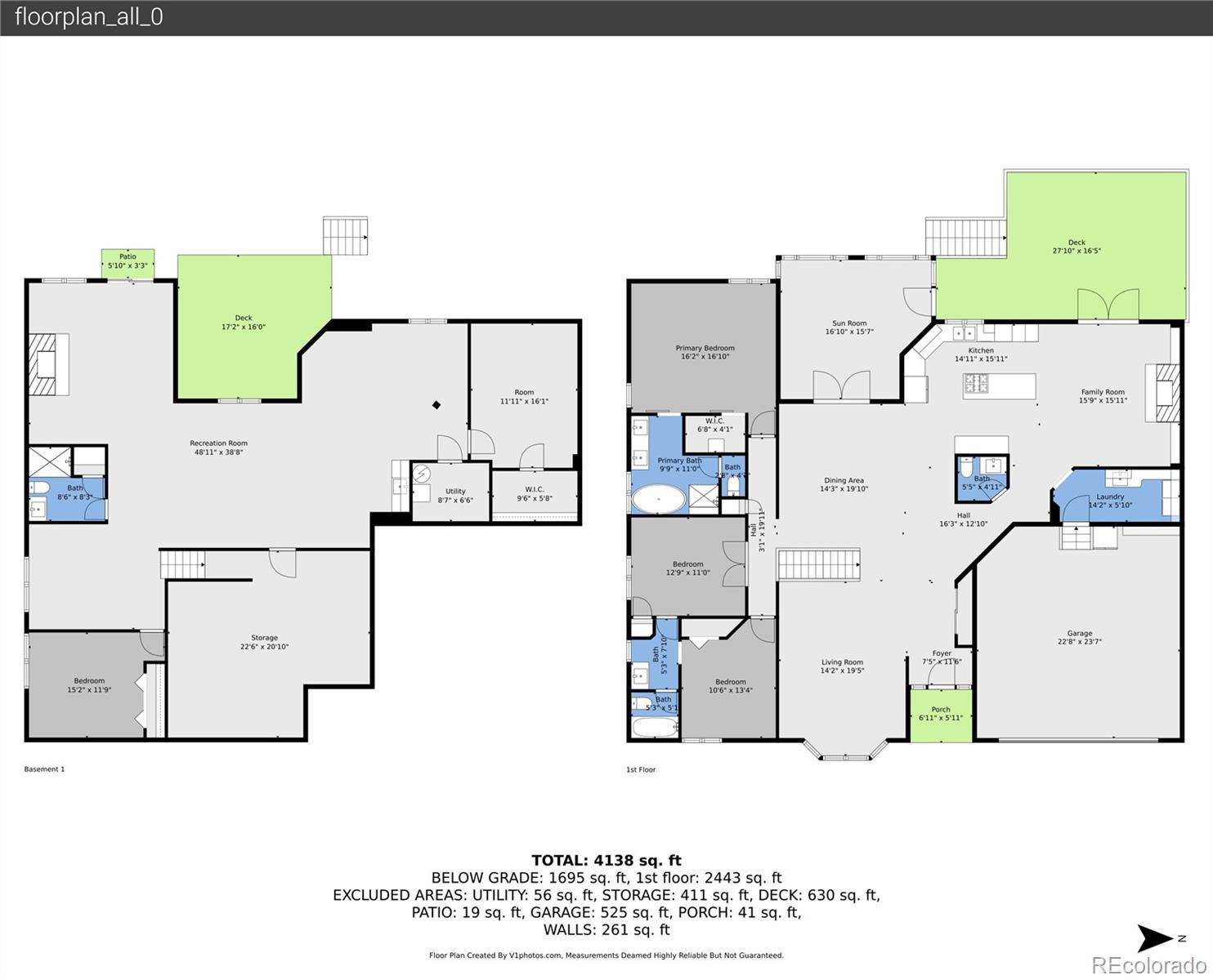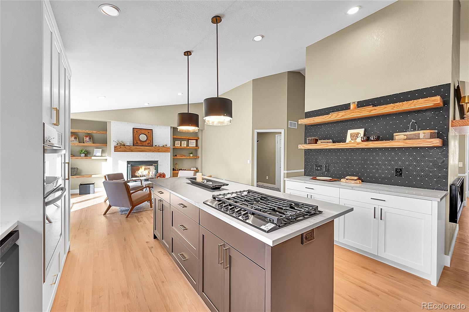Welcome to this charming remodeled home situated in the Sundown Ridge community of Littleton. This ranch-style home boasts over 4,600 total square feet and features 5 bedrooms, 4 bathrooms, making it an ideal fit for a variety of living arrangements. Upon entering, you are welcomed by a grand foyer adorned with light-stained oak wood flooring with a beautiful wrought iron and wood staircase. The open-concept layout integrates the living room, dining area—which features an electric fireplace for added warmth and charm & a bright sunroom that showcases a beautiful knotty alder ceiling paired with striking black and white luxury vinyl tile flooring. The sunroom is bathed in natural light from its large windows, equipped with sun screens to ensure comfort during sunny days, truly the perfect spot for relaxation. The kitchen has custom white cabinetry, a spacious island, double ovens equipped with a microwave and air fryer, and a breakfast bar w/ stylish shelving above w/ under-cab lighting for a warm touch. Adjacent to the kitchen, the family room is anchored by a wood-burning fireplace & showcases a panoramic stacking door that opens up to west-facing views, enhancing the home’s connection to the outdoors. The walk-out basement adds versatility to the home, featuring two additional bedrooms—one is non-conforming room with a walk-in closet. This expansive basement includes multiple seating areas and boasts a wet bar with butcher block counters and a beverage center, creating an ideal space for entertaining or activities like pool or game nights. The main floor laundry room conveniently located off of the garage entrance features ample shelving, & butcher block counters. This charming home offers easy access to parks, the Highline Canal, Littleton Public Schools—truly a wonderful place to call home.