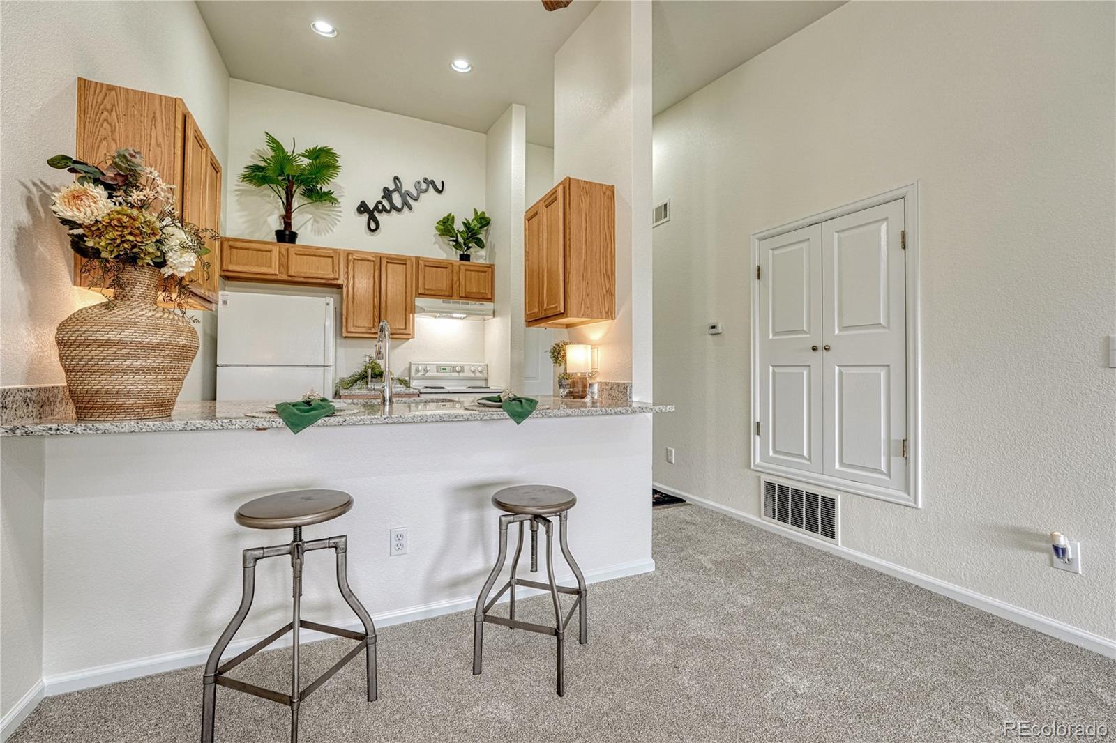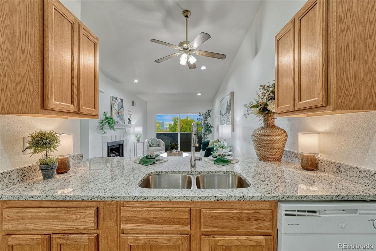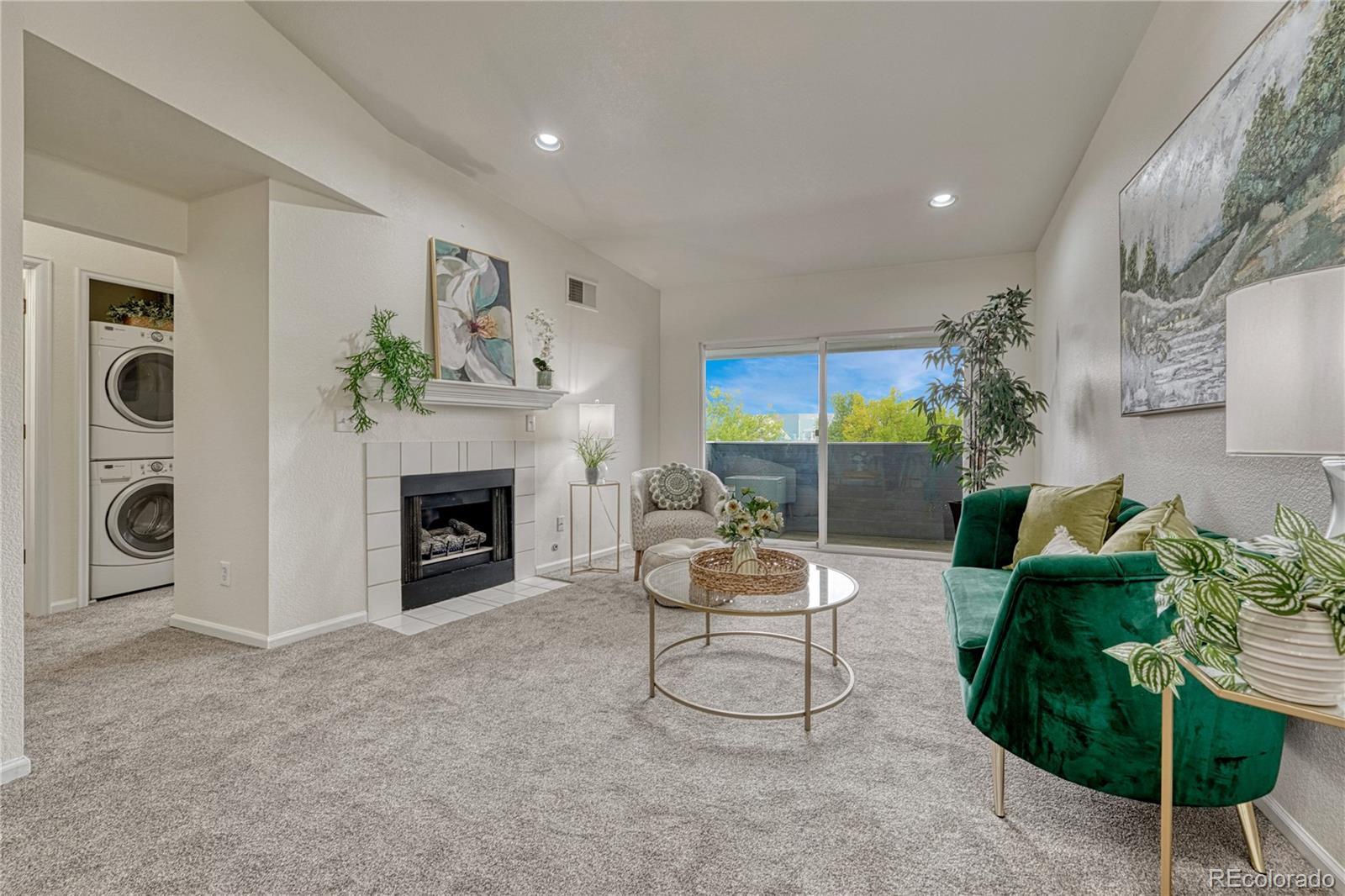 Welcome to this beautifully updated 2 bed, 1 bath condo that blends modern upgrades with unbeatable location! Step inside to find vaulted ceilings that make the living space feel bright and open. You’ll love the fresh interior paint (2025), new carpet (2025), and the sleek new granite counters (2025), new kitchen sink and faucet (2025). The kitchen shines with a new stove (2024) and all appliances included — yes, even the washer and dryer! The family room is right off the kitchen, making entertaining a breeze. Cozy up on the cold Colorado nights with your own gas fireplace. Large bedrooms, both with walk in closets. Major updates already done for you: new exterior paint, windows and roof (2025), plus a new hot water heater (2020). Relax with peaceful greenbelt views, then take advantage of quick access to Buckley Air Force Base, the new Sprouts Market Center, and commuting made easy via I-225 & E-470. This unit has been rented for $2,250 a month so it would make an excellent investment property. This is truly a move-in-ready gem in Americana II — updated, stylish, and close to everything!
