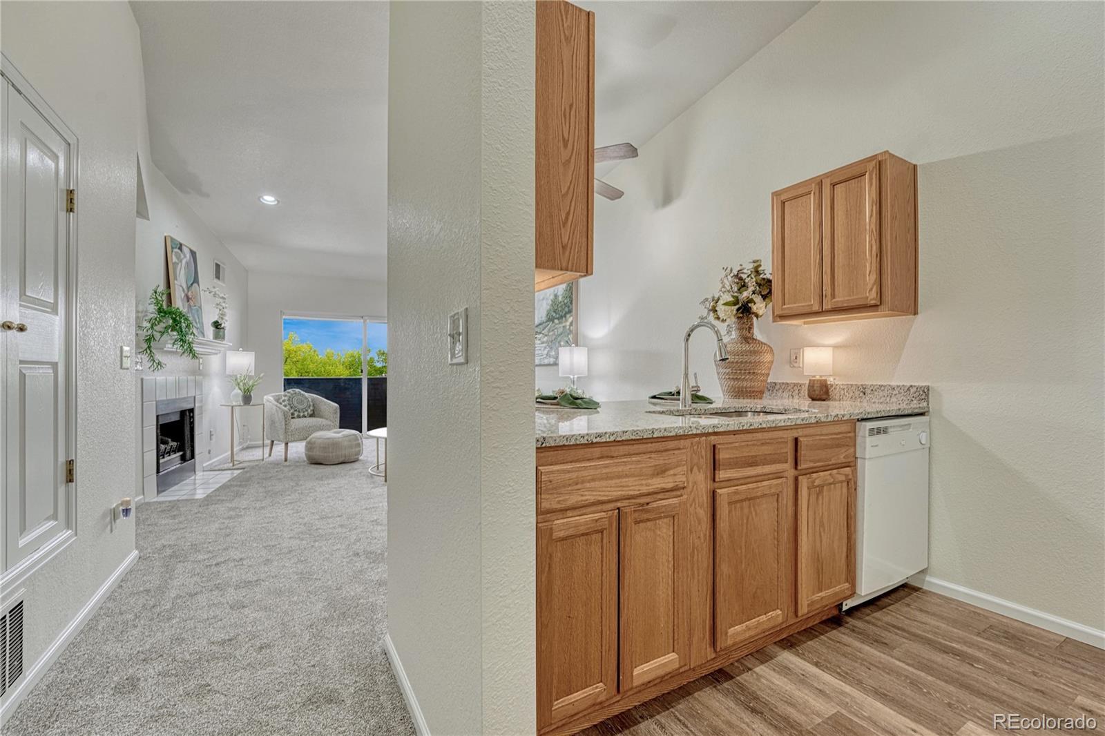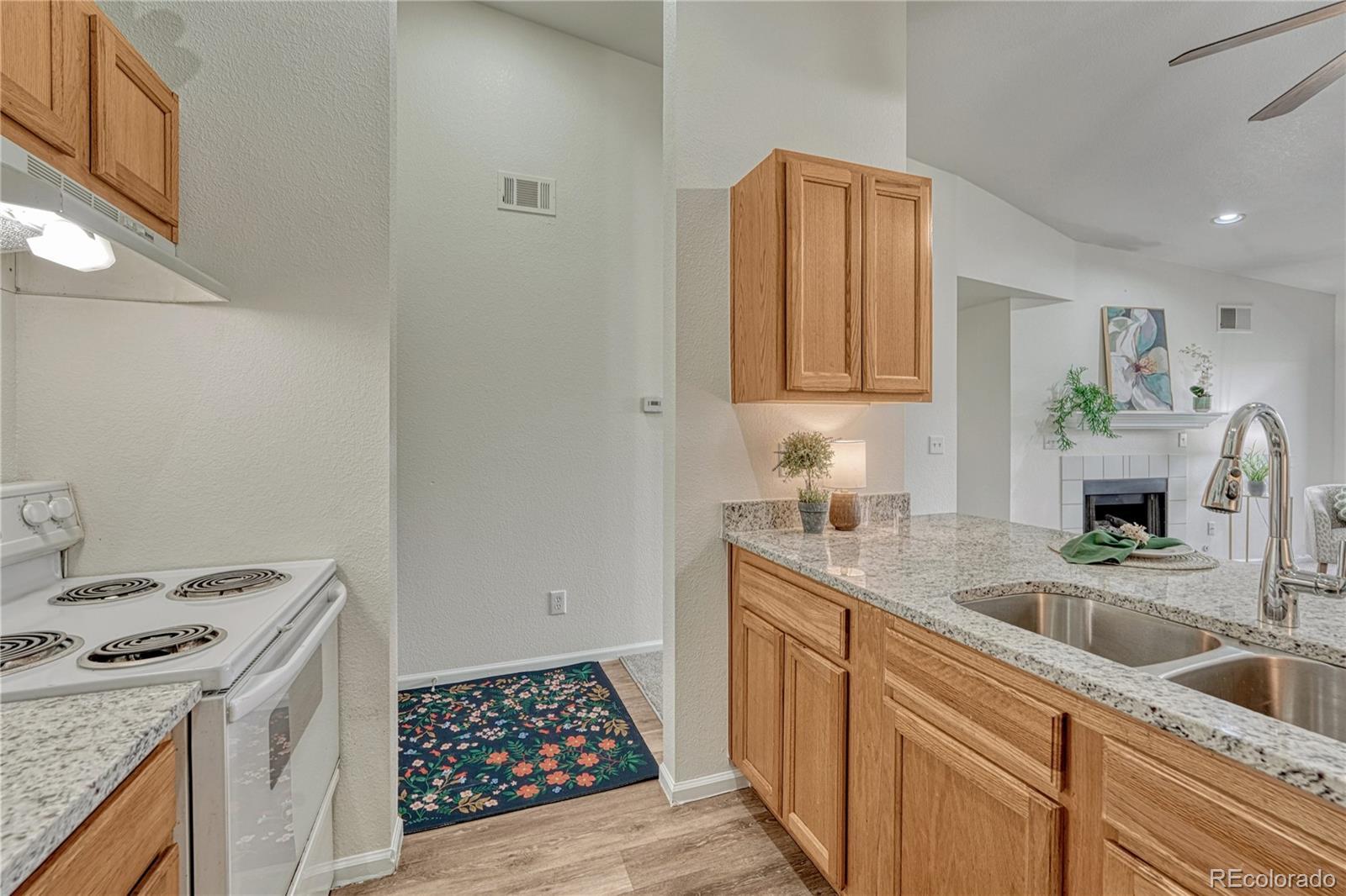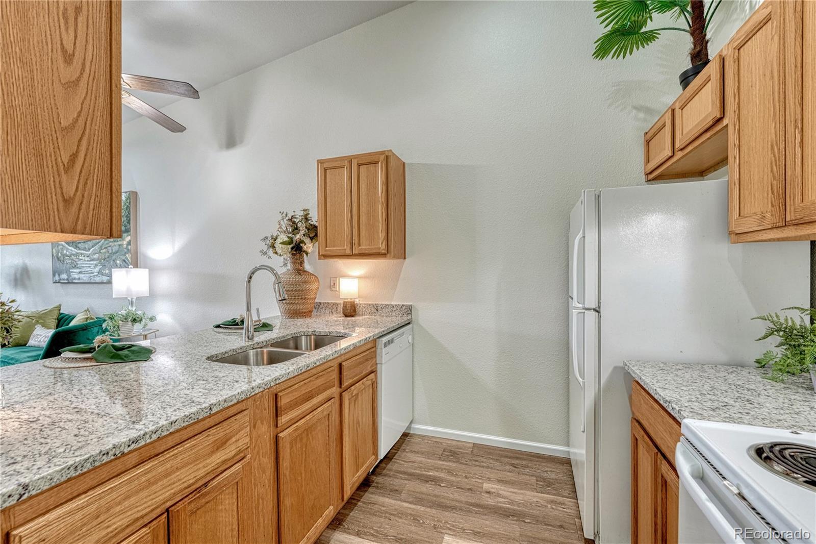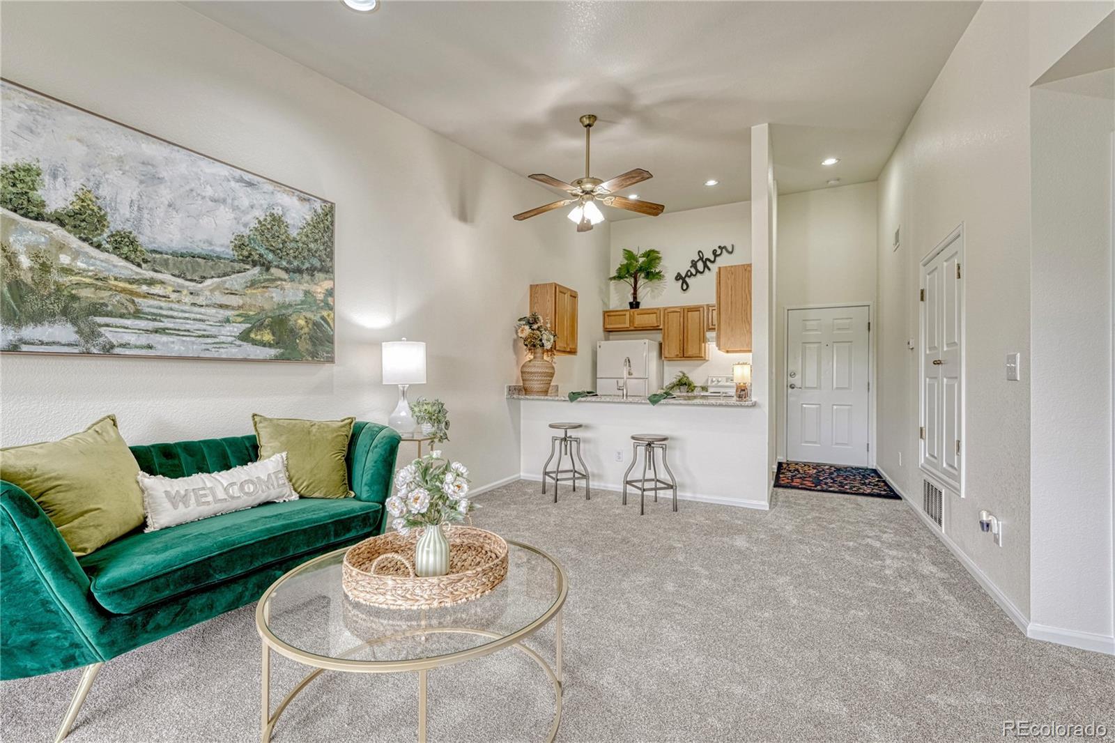 Welcome to this beautifully updated 2 bed, 1 bath condo that blends modern upgrades with unbeatable location! Step inside to find vaulted ceilings that make the living space feel bright and open. You’ll love the fresh interior paint (2025), new carpet (2025), and the sleek new granite counters (2025), new kitchen sink and faucet (2025). The kitchen shines with a new stove (2024) and all appliances included — yes, even the washer and dryer! The family room is right off the kitchen, making entertaining a breeze. Cozy up on the cold Colorado nights with your own gas fireplace. Large bedrooms, both with walk in closets. Major updates already done for you: new exterior paint, windows and roof (2025), plus a new hot water heater (2020). Relax with peaceful greenbelt views, then take advantage of quick access to Buckley Air Force Base, the new Sprouts Market Center, and commuting made easy via I-225 & E-470. This unit has been rented for $2,250 a month so it would make an excellent investment property. This is truly a move-in-ready gem in Americana II — updated, stylish, and close to everything!