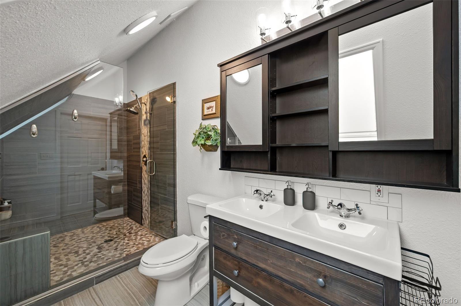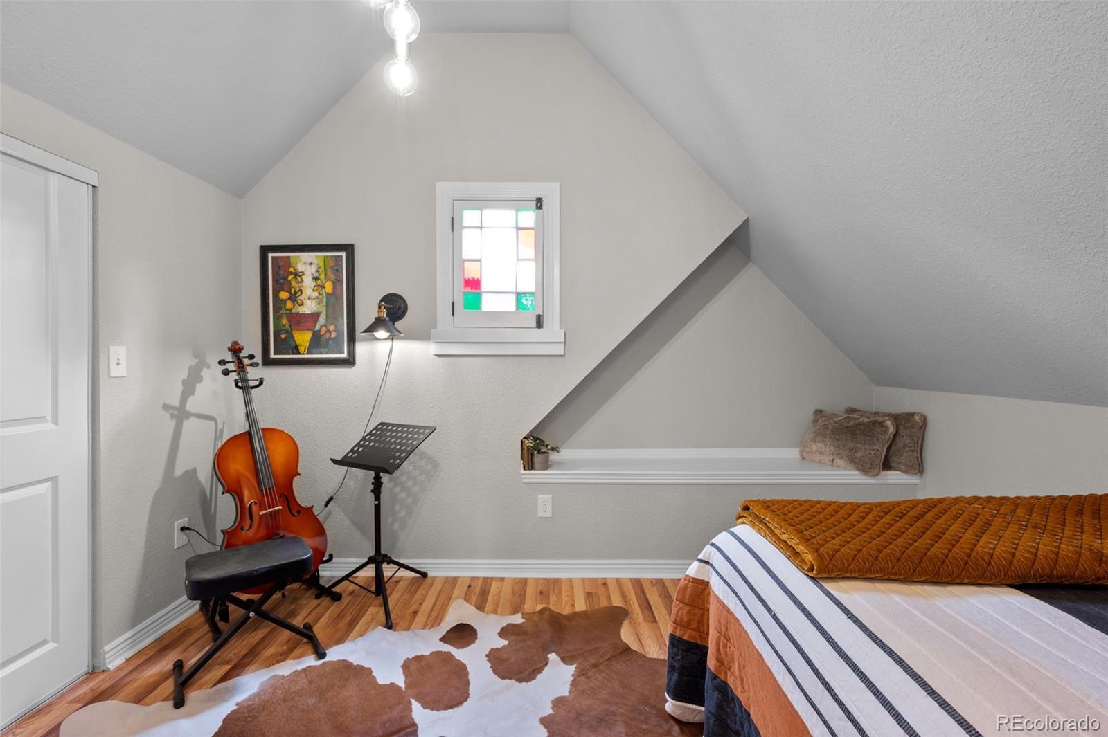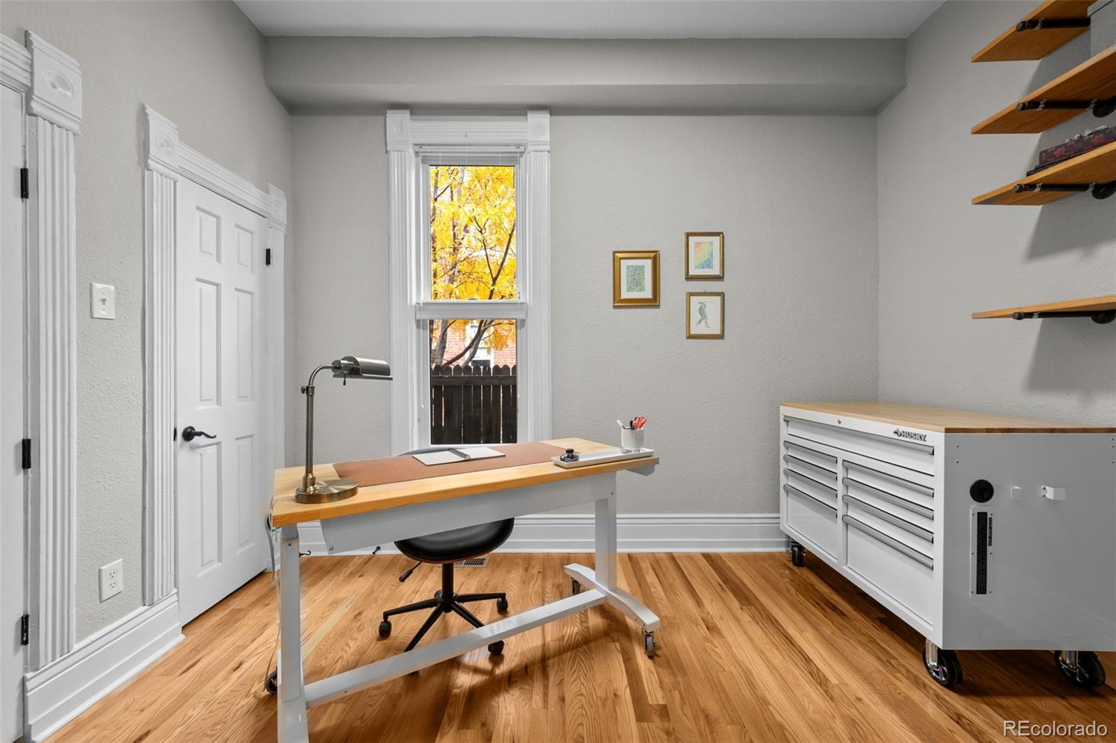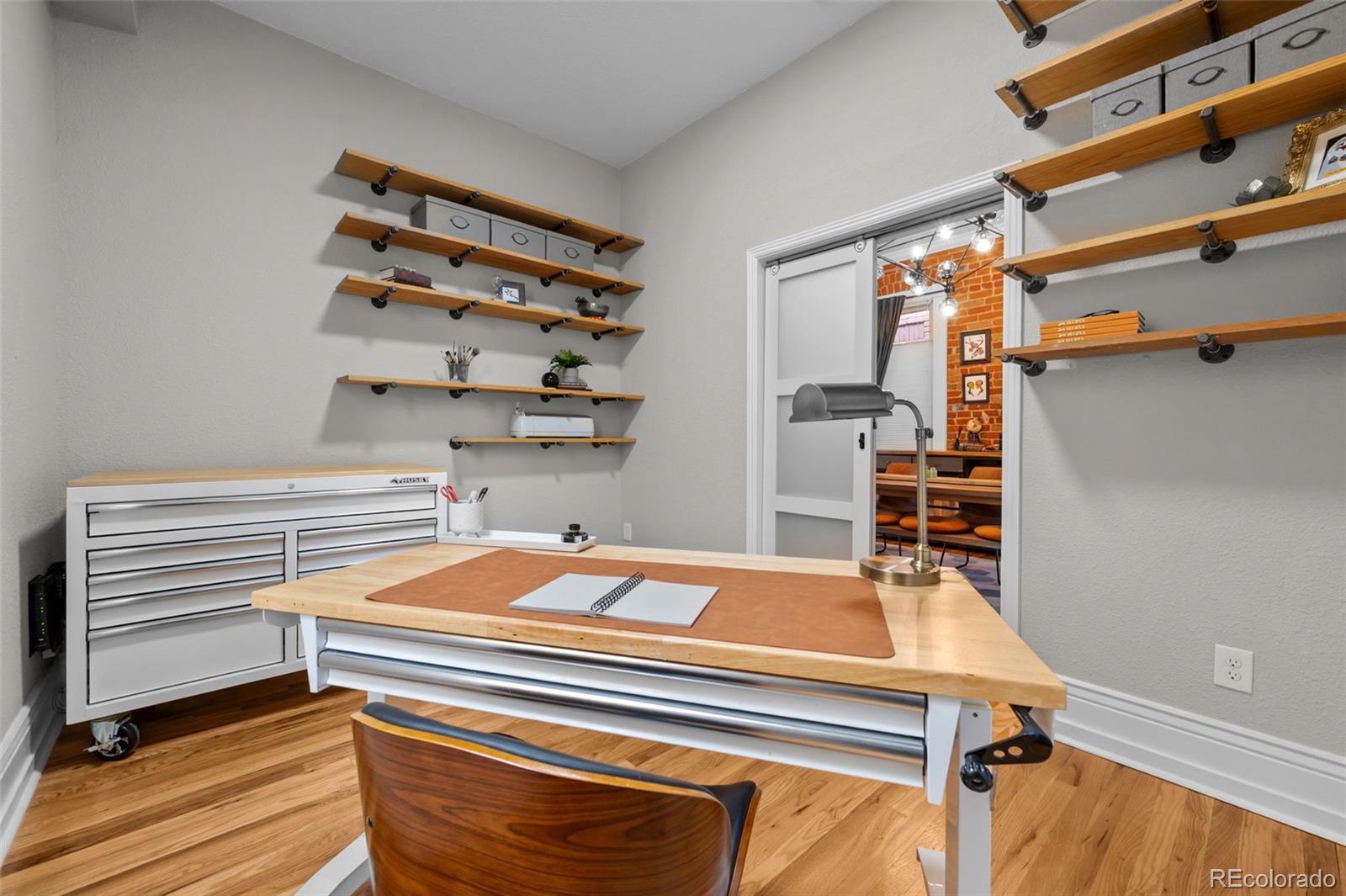 Step into this beautifully upgraded three-bedroom, two-bathroom home that radiates charm and warmth from the moment you enter. Perfect for entertaining, the living room features French doors that open to a private patio, seamlessly connecting to a formal dining area in an inviting open floor plan. As you explore the main level, you’ll appreciate the stunning exposed brick, rich hardwood flooring, and soaring high ceilings that create a spacious ambiance. The renovated kitchen features open shelving and new stainless-steel appliances, including a five-burner gas range. New ¾ bathroom and a guest bedroom or office round out the main floor. Venture upstairs to find two bright and airy bedrooms with new luxury vinyl plank flooring, including a spacious primary suite that boasts large closets and a luxurious spa-like bathroom. This exquisite bath features modern upgrades, including a double vanity with ample storage. Enjoy peace of mind with numerous recent updates, newer solid-wood exterior doors, new ductwork, and a new heat pump furnace, energy-efficient windows, new AC splits, a water heater, smart thermostat, gas insert for the fireplace, electronic door locks, a comprehensive Ring security system with additional cameras, and front and backyard irrigation. Step outside to your backyard oasis, complete with a new deck, planter boxes, flatwork, and multiple entertaining areas that are perfect for outdoor gatherings. You’ll also appreciate the convenience of a newer two-car garage with an electric-car charger and additional storage for all your Colorado adventures. Located within walking distance to local restaurants, coffee shops, and parks, this home offers excellent access to major roadways. Don’t miss your chance to experience the perfect blend of style, comfort, and location!