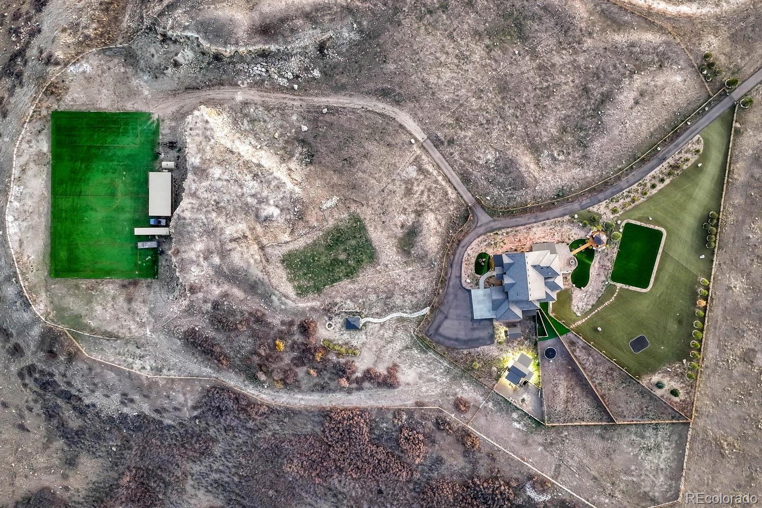 One of the best views in all of Douglas County from a private gated community & gated property w/security. On top of a mesa, 10 minutes from downtown Castle Rock, this luxury home & horse property has 35 acres with amazing 360 degree views of the front range from Ft. Collins to CO Springs, & city lights. Stunning finishes include a gourmet kitchen with a sub zero refrigerator, 4 ovens, 7 burner gas range, 2 beverage cooling drawers, 2 dishwashers, large slab granite kitchen island, walk-in pantry, 8' doors. Great room includes a beautiful stone fireplace surround, 25' ceiling, glass wall for picturesque views, auto remote windows coverings, and walks out to a covered patio, 2nd kitchen w/pizza oven. Main level primary suite is equally impressive with 13' ceilings, large picture windows, fireplace, 5 piece bathroom, multiple shower heads, exceptionally large walk-in closet w/built-ins & locking jewelry drawers. Upper level has 2 bedrooms w/en suite full bathrooms & loft. Basement includes an open game room, media area, wet bar w/wine cooler, exercise room, 2 bedrooms w/en suite bathrooms, geo thermal heat/cooling system, multiple unit water filtration system, tankless water heater, whole home fire suppression & radon mitigation systems. NO MAINTENANCE YARD-Grass is artificial turf, professional size soccer field, security gates and cameras, fully fenced, 2 gazebos-one with a hot tub, one with a stone fire pit, heated & fenced chicken coops & dog houses, 2 auxiliary garages w/electric for off road vehicles, covered outdoor kitchen, beautiful stone patio, putting green, 15x20 built-in yoga mat, steel storage container, diesel fuel tank, & awe inspiring rock formations. Equine amenities include: Livestock water permit, 3rd security gate, 1,200 sq ft barn, tack room, fenced pasture areas, water storage tank, 4.8KWH Solar Power System (2024). This property is amazing with its views, privacy & security, amenities and location to downtown Castle Rock