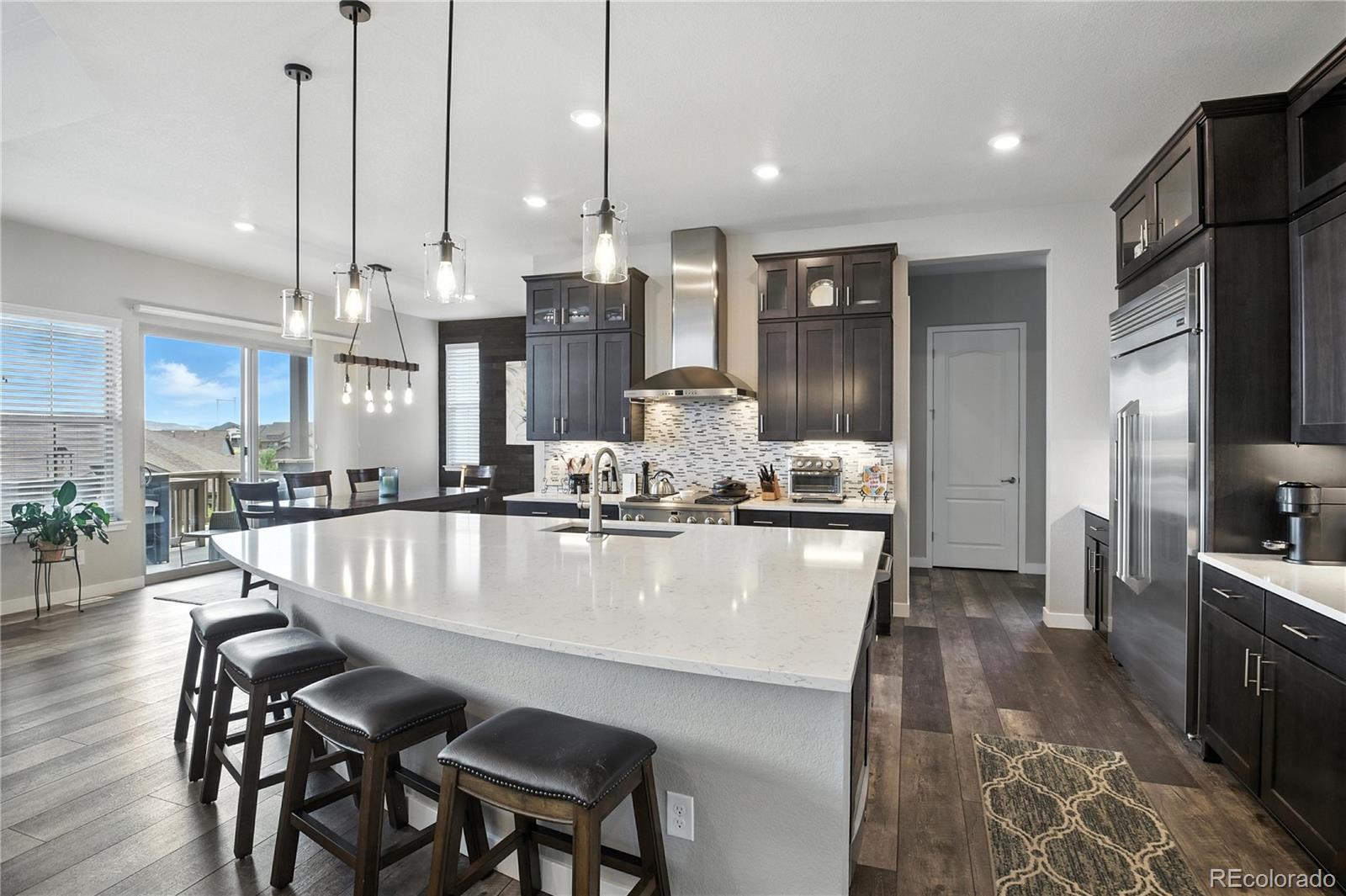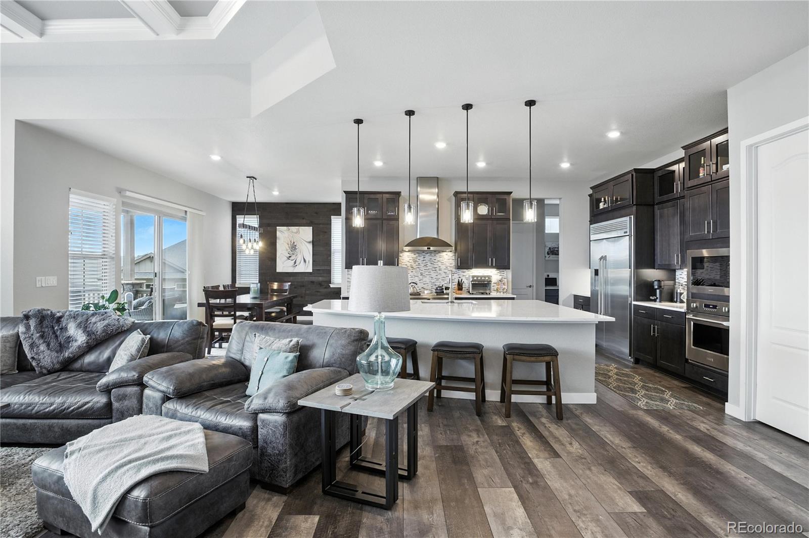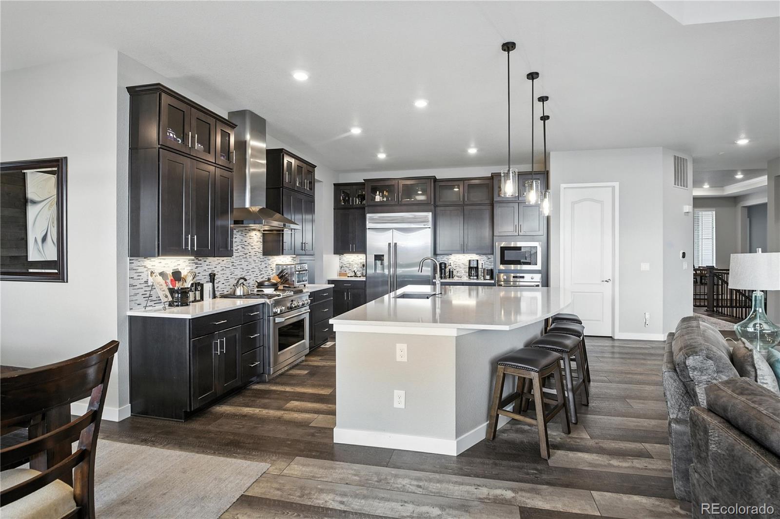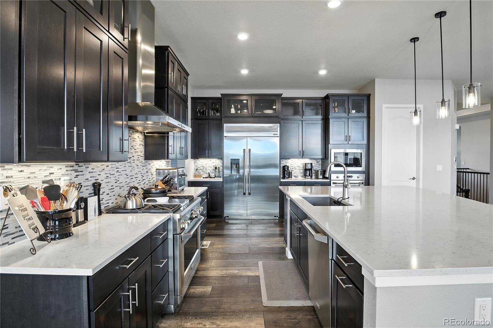 Luxury living at its finest in the heart of Sterling Ranch with this stunning Cabrillo ranch floor plan. Boasting over 5,600 sq ft, this home offers thoughtful design and top-tier finishes, including a full walkout basement and 12-ft custom ceilings in the great room. A perfect layout for a multi-gen home. The cozy fireplace sets the perfect ambiance for gatherings, while the chef-inspired kitchen shines with 42" cabinets, glass accents, a quartz island, and premium Monogram stainless steel appliances with dual dishwashers. Throughout the home, you’ll find 8-ft doors, coffered ceilings, quartz countertops, and extended upgraded hardwood flooring that exude elegance. Step out onto the back deck and take in the breathtaking, unobstructed views—the perfect backdrop for morning coffee, offering breathtaking sunrises. Imagine nights by the custom fire pit, sharing stories and s’mores under the stars. Take advantage of the park across the street. The smart home system gives you full control of appliances, sprinklers, and lighting right from your phone. A spacious 3-car garage provides ample space for your vehicles and storage. This thriving community offers exceptional amenities, including a coffee shop, a brewery, a clubhouse, a community pool, and scenic walking trails. Plus, you're just minutes from Chatfield Reservoir, Roxborough Park, and top-rated golf. This is more than a home—it’s your lifestyle upgrade. Schedule your showing today!