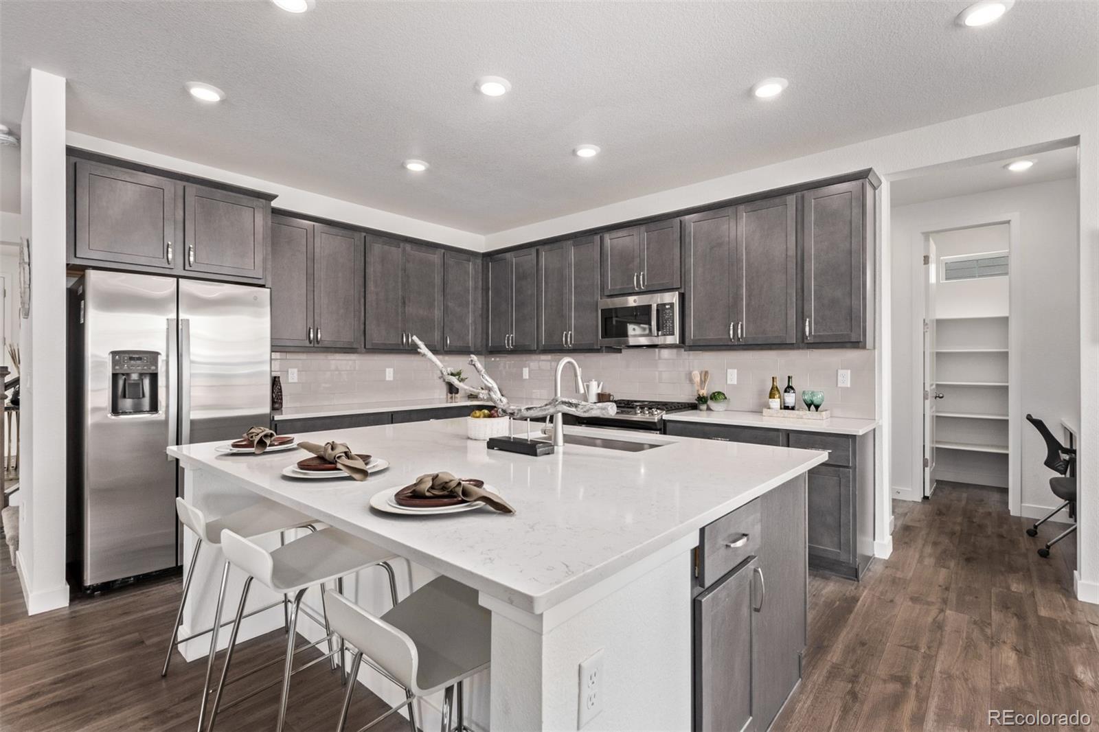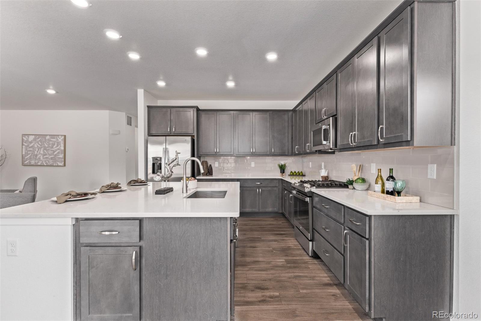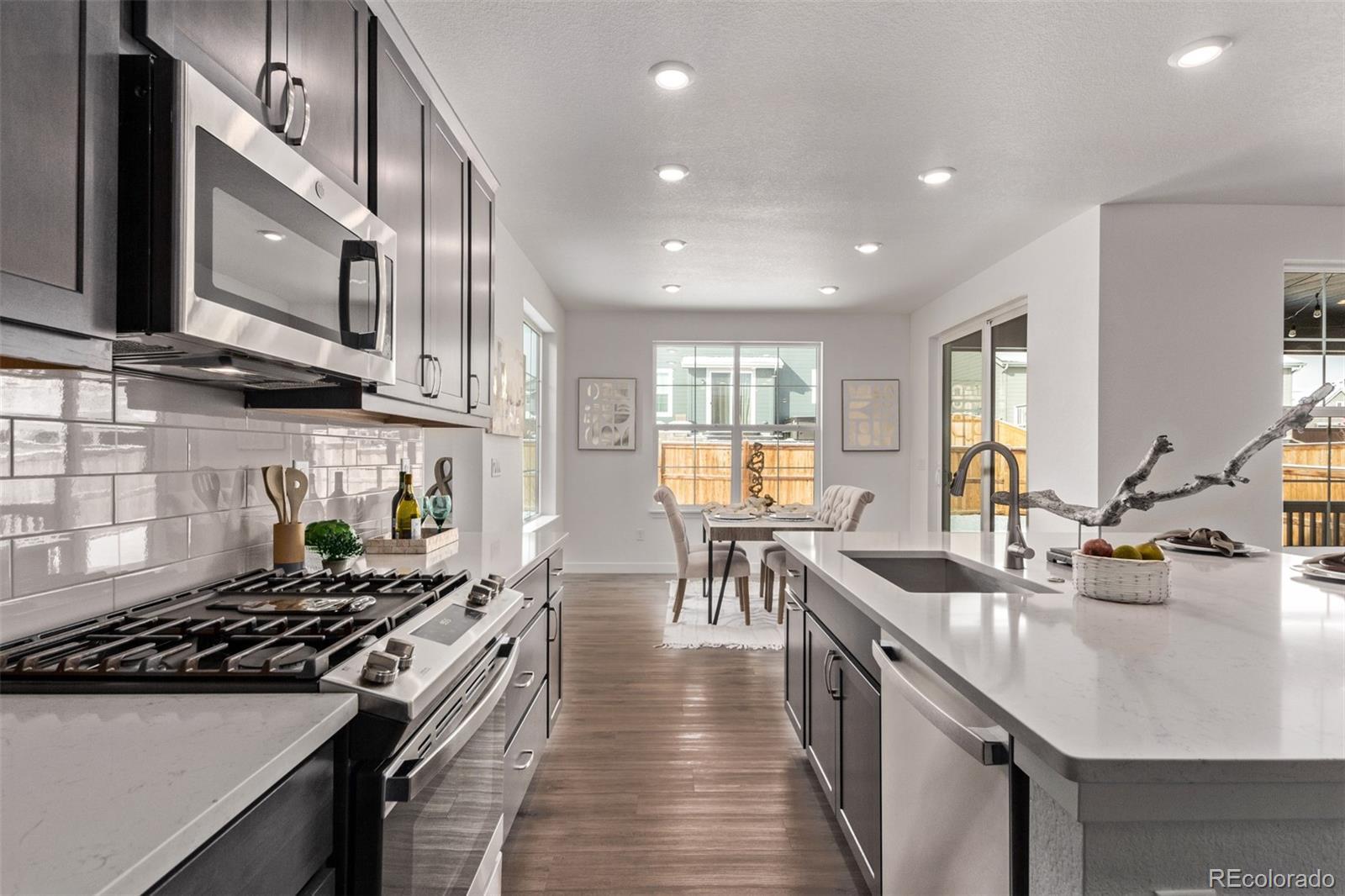This home is LIKE NEW! Built in 2023 located on a premium homesite with mountain views. This stunning home will impress with all of the upgraded finishes! The gourmet kitchen is a chef's dream boasting high-end cabinets, quartz countertops, double ovens, five burner gas range, butler's pantry and large island that opens to the spacious and vaulted family room. The primary bedroom will not disappoint with custom touches, mountain views, a walk-in closet, luxurious bathroom with dual vanities and a spa-like shower with lots of room. As if this was not enough, wide planked luxury vinyl floor, two furnaces and A/C unit for maximum efficiency and so much more. The exterior is equally impressive and features both a covered front and back porch. The large covered back porch provides the perfect space to relax or entertain with tranquil mountain views. Located in the Willow Bend community in North Thornton, this home is close to a park, walking paths, a new STEM school, and offers quick access to E-470 and I-25. Just a 20-minute drive to DIA, Thornton offers numerous amenities, including 3 rec centers, a dog park, frisbee park, shopping, restaurants, Costco, Home Depot, Top Golf, and golf courses. This home is part of School District 27J with newer schools,. Welcome HomeThis is a must see home that will impress!