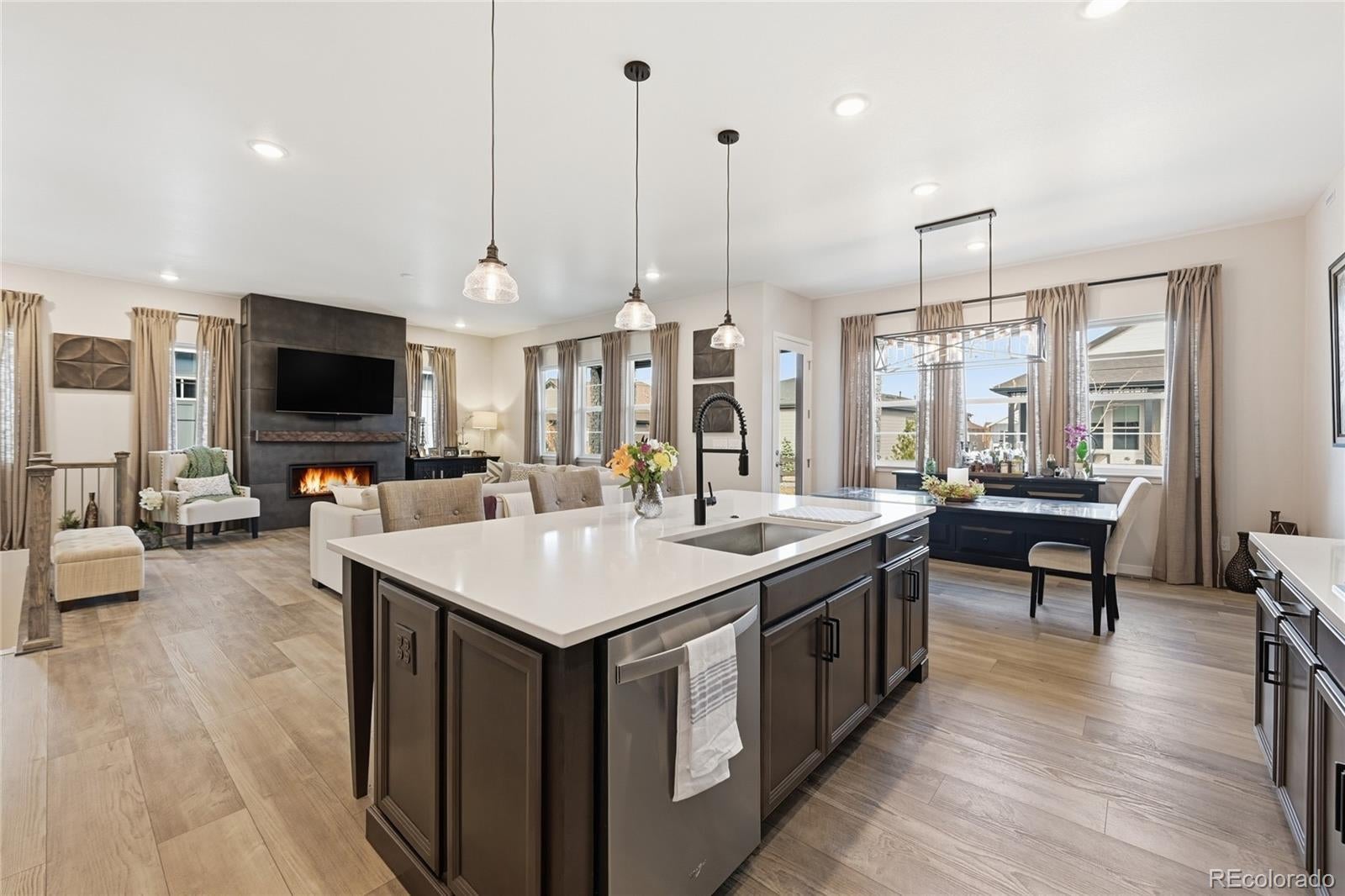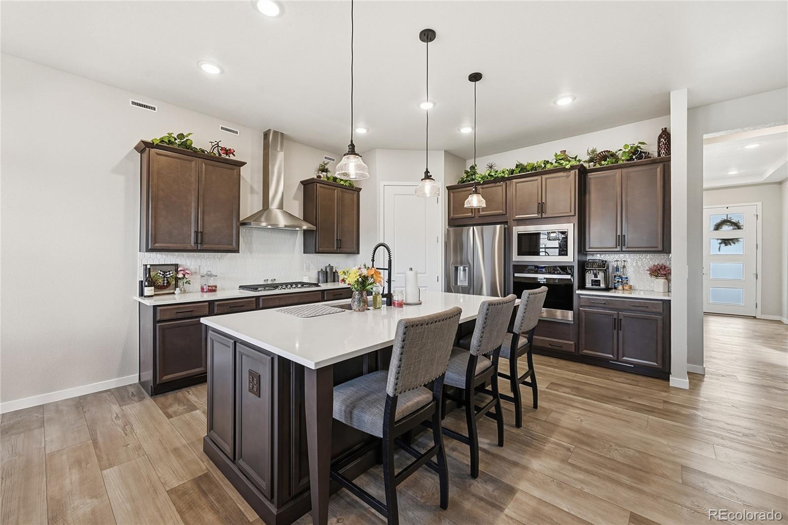 Welcome to refined, elevated living in a premier new 55+ community, Hilltop @ Inspiration! This award winning community is ideally situated along the border of Douglas County and Arapahoe County in breathtaking Colorado. This exceptional residence offers an unparalleled blend of sophistication, comfort, and vibrant community lifestyle — all framed by sweeping mountain views that grace the neighborhood throughout. Designed for both elegance and ease, this expansive home offers 4,376 total square feet with three beautifully appointed bedrooms and two luxurious baths. The open-concept layout creates a seamless flow between living, dining, and entertaining spaces, enhanced by abundant natural light and thoughtfully curated finishes. At the heart of the home, the gourmet kitchen impresses with quartz countertops, premium appliances, and designer details that elevate everyday living into a culinary experience. Custom tile work in the bathrooms adds a bespoke touch of artistry and refinement, reflecting quality craftsmanship at every turn. Beyond the home itself, residents enjoy scenic community trails, beautifully maintained parks, and the Hilltop Club complete with pickleball and tennis courts, bocce ball, swimming pool, weight room, and community areas for game nights, clubs, activities & even outdoor concerts! All amenities contributing to an active, connected, and resort-inspired lifestyle. This is more than a home; it is an invitation to experience elevated luxury in a community designed for both comfort and distinction! Seven minutes to Costco, Whole Foods, Trader Joe’s, King Soopers, Parker Adventist Hospital, Southlands Mall, Parker Arts, Culture & Events Center, charming downtown Parker, incredible dining, breweries & Poulette Bakeshop! 30 Minutes to DIA!