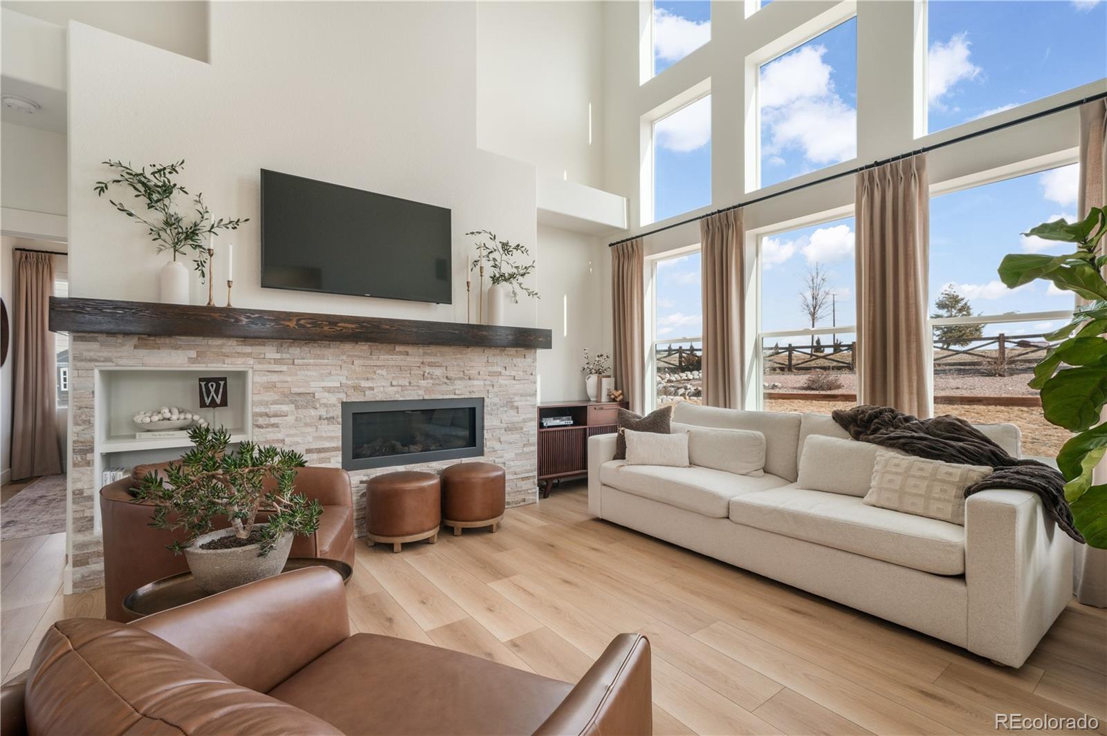 Stunning, highly upgraded two-story home in desirable Banning Lewis Ranch, perfectly situated on a quiet street with open space both in front and behind the home. Set on nearly 1/3 of an acre, this beautifully designed home offers 6 beds, 4 baths, and exceptional finishes throughout. A covered front porch welcomes you inside to soaring ceilings, laminate flooring, custom lighting, and an office to the right with double French doors. The beautiful staircase creates an elegant focal point, while the hidden and thoughtfully designed mudroom off the 3 car garage features impressive built-ins that truly set this home apart. The kitchen is the showstopper, complete with Z Line appliances, gas stove, farm sink, granite countertops, tile backsplash, and large walk-in pantry. The attached dining area walks out to a covered patio and an expansive, fully fenced backyard with stunning landscaping. The living room's stone fireplace and abundant windows that flood the space with natural light are perfect for entertaining. The main-level primary suite offers motorized blinds and a luxurious bath with tile flooring, dual vanities, custom closet, and large walk-in shower with bench and beautiful tile work. Upstairs, a spacious loft overlooks the living room below and leads to 3 generously sized bedrooms, a full bath and upstairs laundry add convenience. The finished basement features 2 additional bedrooms, a recreation room with built-in dry bar and refrigerator, custom cabinetry with granite countertops, a versatile flex room ideal for an office or gym, a beautifully upgraded 3/4 bath, and a large mechanical/storage room with potential to finish as an additional bedroom. Located within walking distance to schools and the community park, Banning Lewis Ranch offers pool, parks, workout facility, walking trails, and more. With easy access to military bases, shopping, dining, and medical facilities, this exceptional home truly has it all. Schedule your showing today.