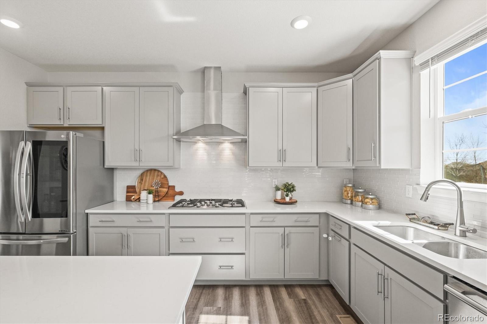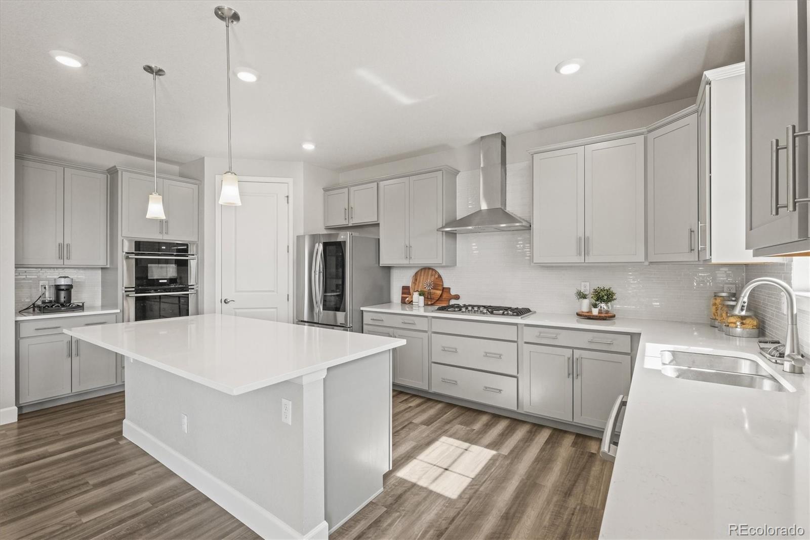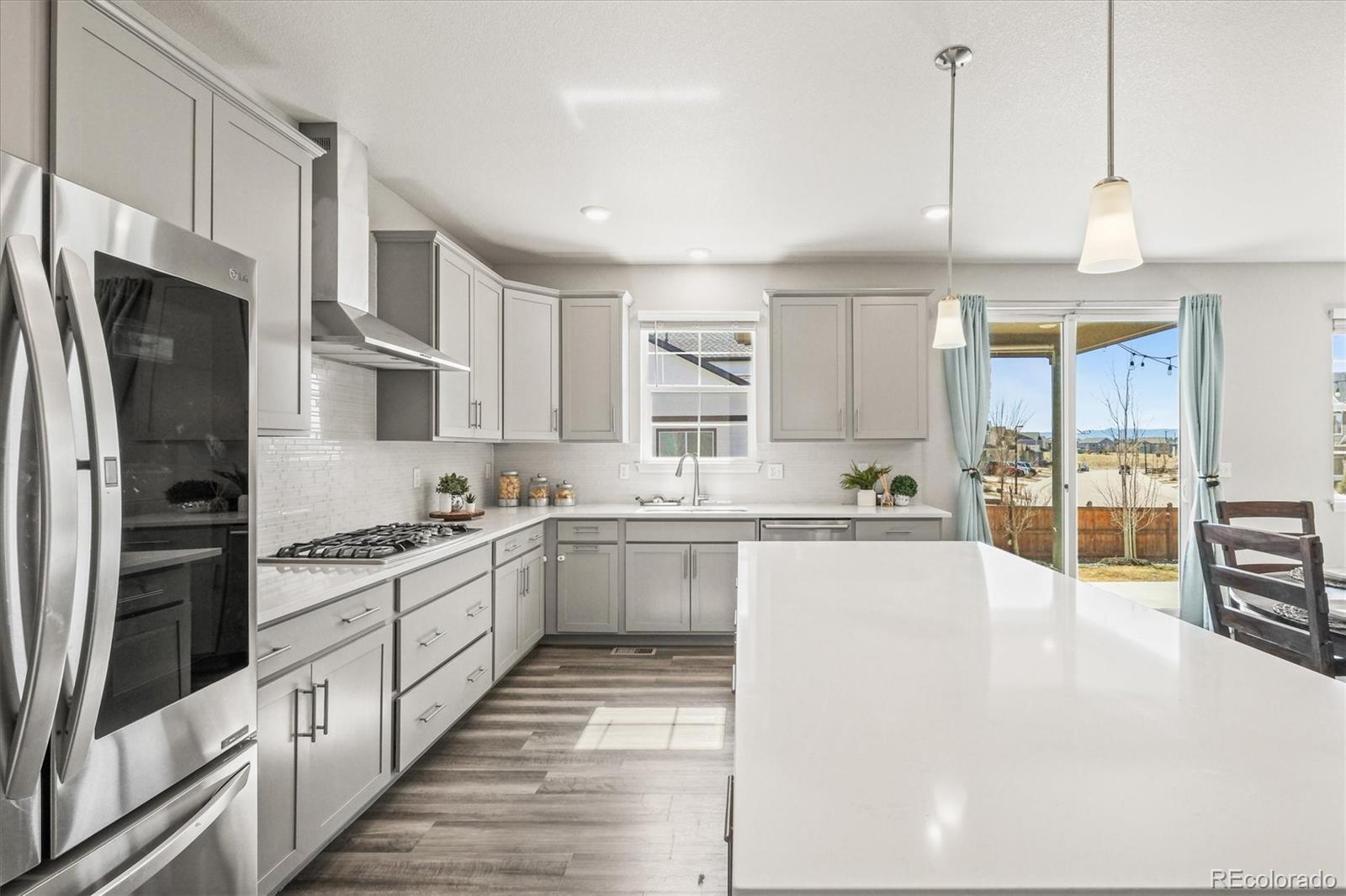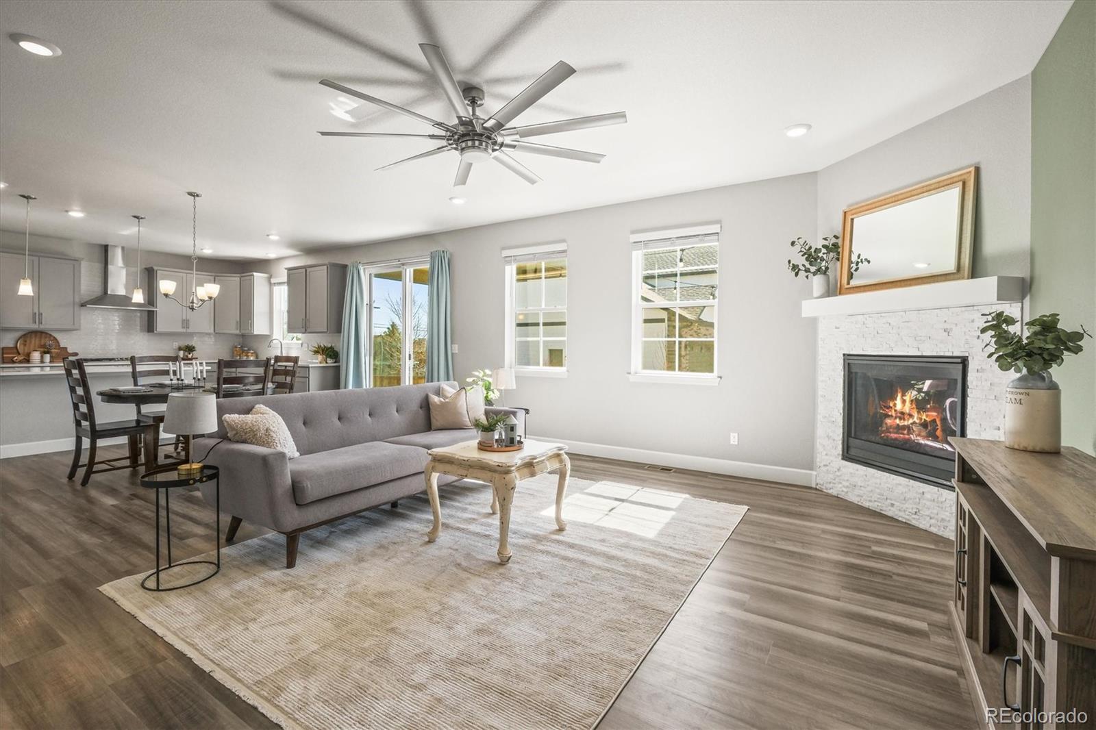 Best Price in Terrain!! Lowest price/sq ft finished in Terrain! Amazing 6 bedroom, 5 full bathroom home with finished basement and oversized 3 car garage. The main floor features luxury plank flooring, 8 foot doors, an office with barn doors, spacious bedroom, full bathroom, great room with gas fireplace, dining area, gourmet kitchen, pantry, large closet, and mud room/drop zone. The gourmet kitchen has quartz counters, stainless appliances, large island. Step and enjoy your yard with the covered, expanded concrete patio, professional landscaping, garden boxes, and fully fenced yard. There are 4 bedrooms, 3 bathrooms upstairs, and a laundry room. You will love the large loft/family room, primary suite with office/flex space and bedroom, 5 piece bathroom, and large walk-in closet. There is an ensuite bedroom and full bathroom, 2 additional bedrooms and a divided full bathroom. The finished basement has a bathroom, bedroom, large family room with cabinets and refrigerator, luxury plank flooring, and 2 storage rooms. This floorplan is perfect for guests and/or multigenerational living. Terrain is a highly desirable neighborhood with a clubhouse, 2 pools, dog park, playground, and trails. You are minutes from downtown Castle Rock, shopping, dining, and entertainment. This home has it all! Don’t miss the opportunity to make this your new home!