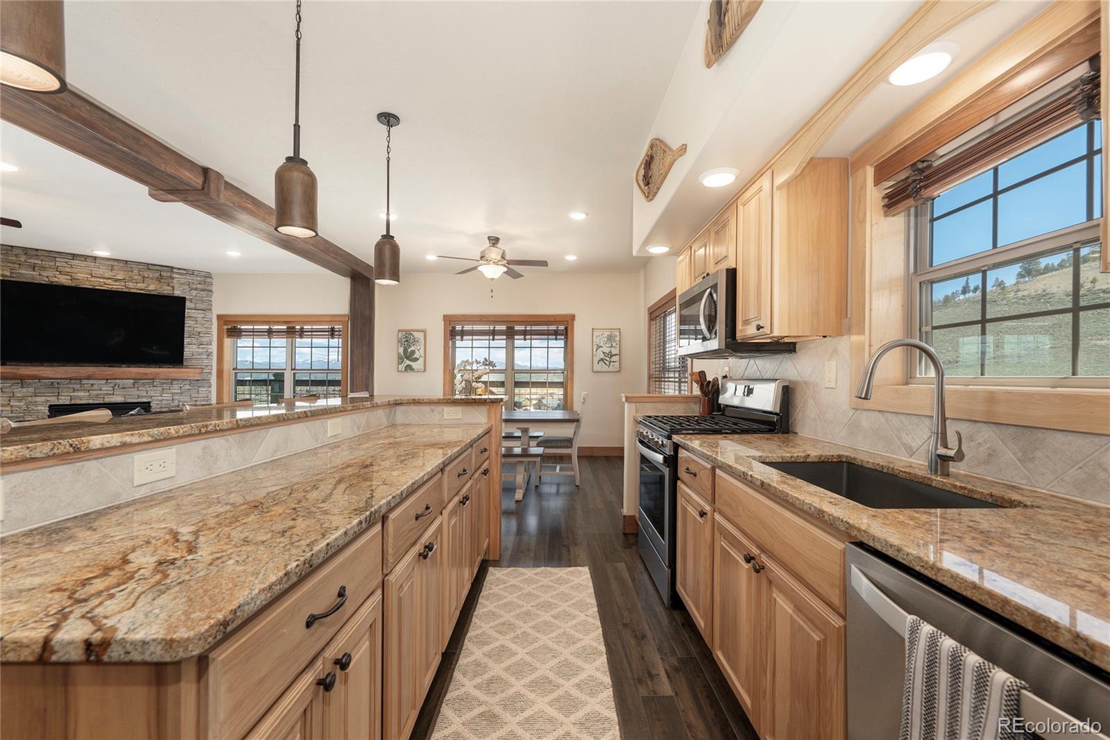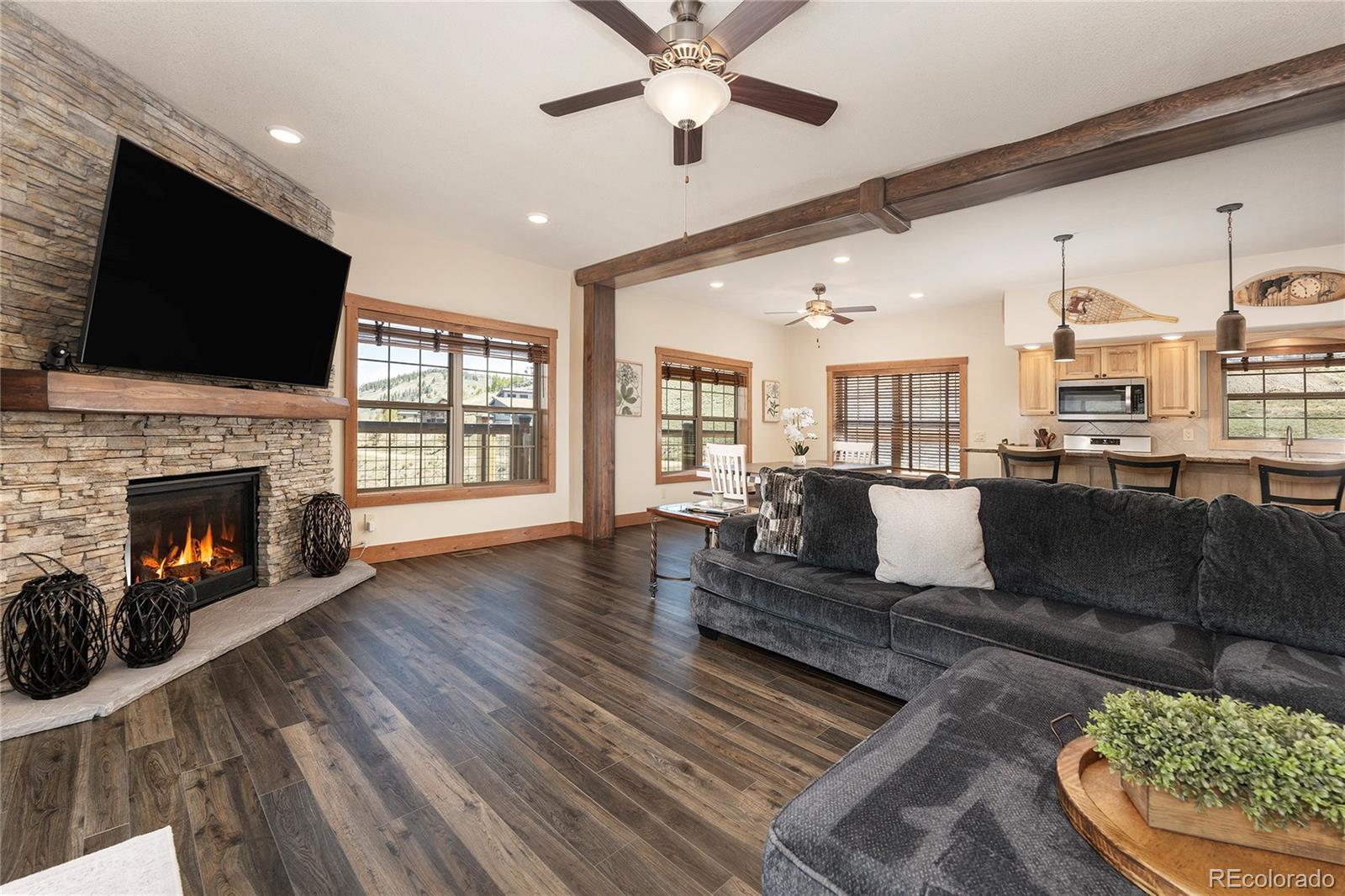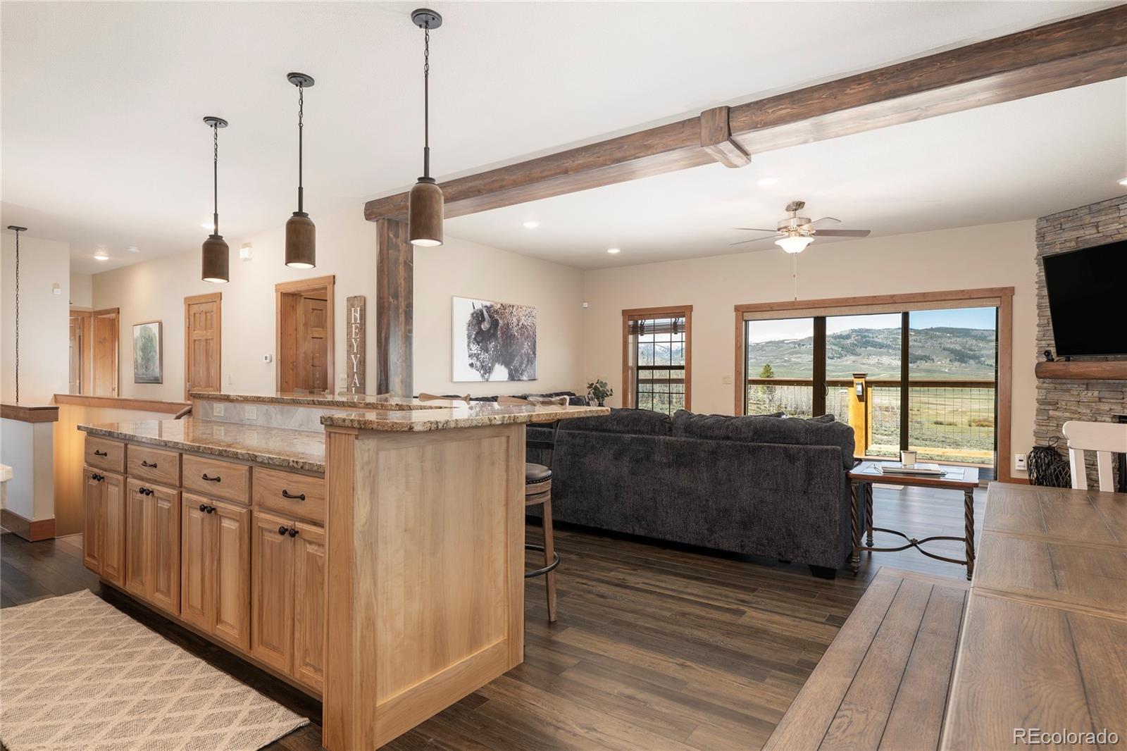 Stunning Mountain Retreat in Innsbruck Experience breathtaking mountain vistas from this meticulously maintained 3-bedroom, 3-bathroom home, nestled on a spacious half-acre lot in the coveted Innsbruck neighborhood of Granby. Constructed in 2019, this residence seamlessly blends modern amenities with the tranquility of mountain living. Open-concept living area featuring a stacked stone gas fireplace, seamlessly connecting the kitchen and dining spaces. Gourmet kitchen equipped with slab granite countertops, a generous 9-foot eat-in bar ideal for entertaining, stainless steel appliances, elegant cabinetry, and under-cabinet lighting.Two distinct living areas provide ample space for relaxation and gatherings. The exterior of the home has durable LP Smart Siding enhancing the home's exterior appeal and was painted in 2024. An expansive wrap-around Trex deck offers the perfect vantage point for enjoying sunsets, mountain views, and local fireworks displays. Beautifully landscaped grounds adorned with aspen trees, vibrant flowers, and asphalt driveway recently sealed.Oversized heated garage with abundant storage, luxury polyaspartic flooring leading to a covered back patio that showcases serene views of the surrounding mountains and ranch lands. This property exemplifies the ideal mountain lifestyle, combining comfort, style, and natural beauty. Don't miss the opportunity to make this exceptional home your own.