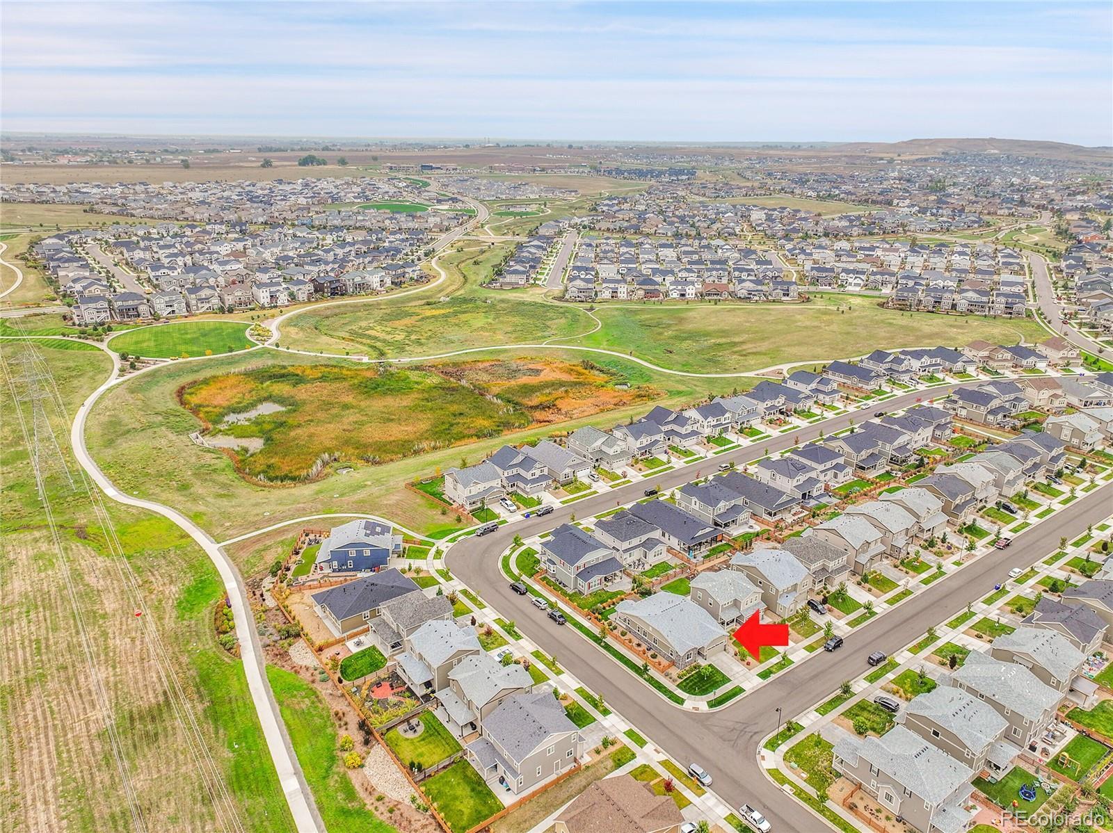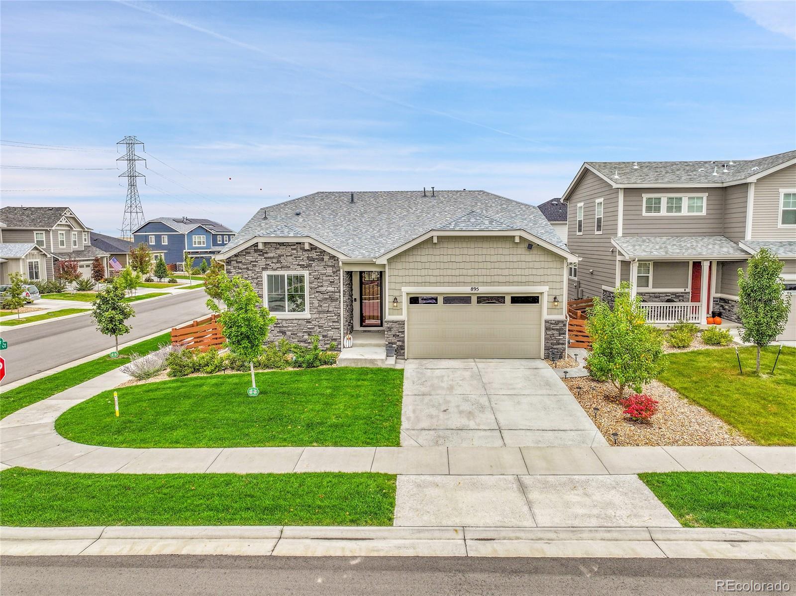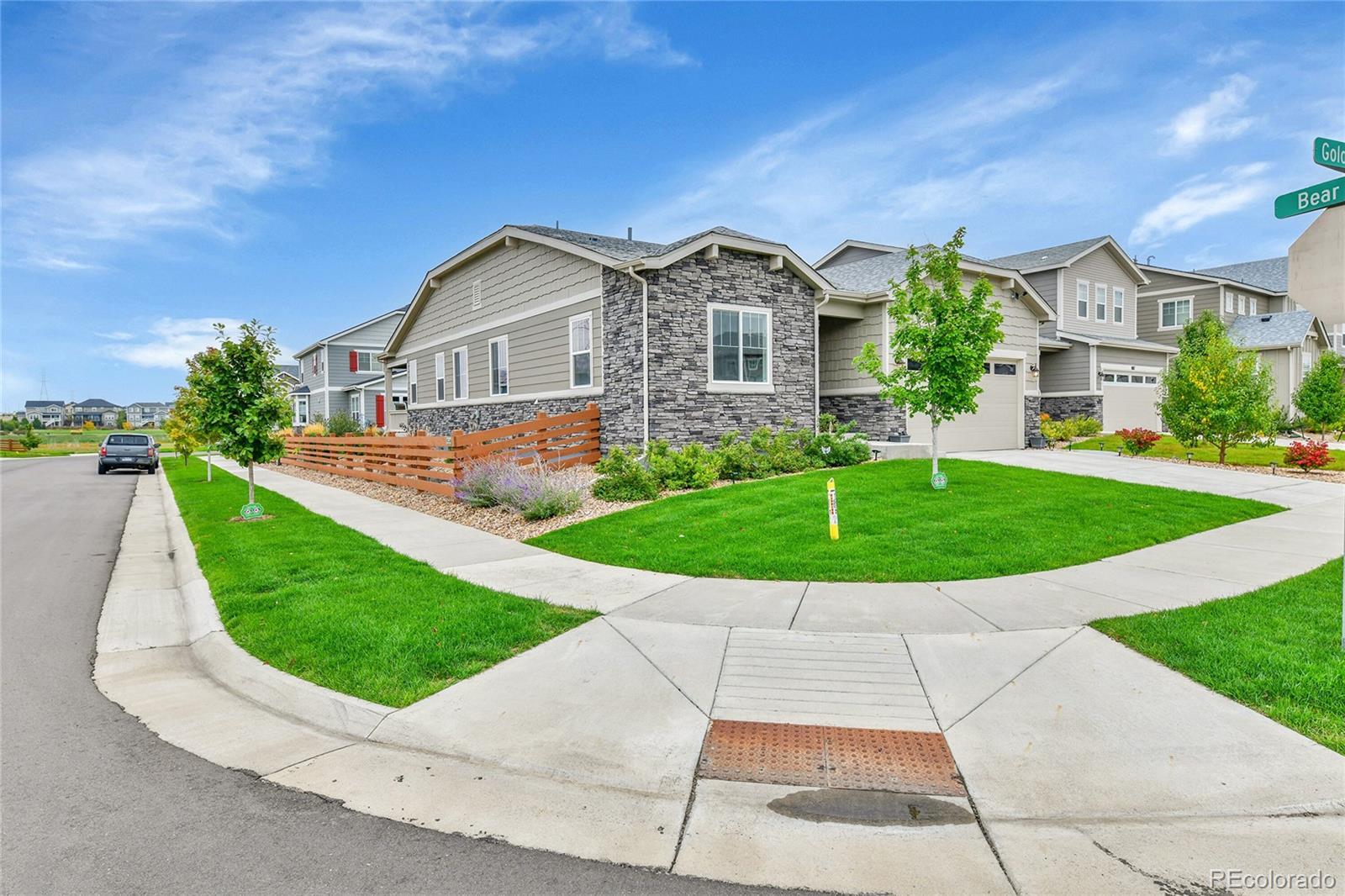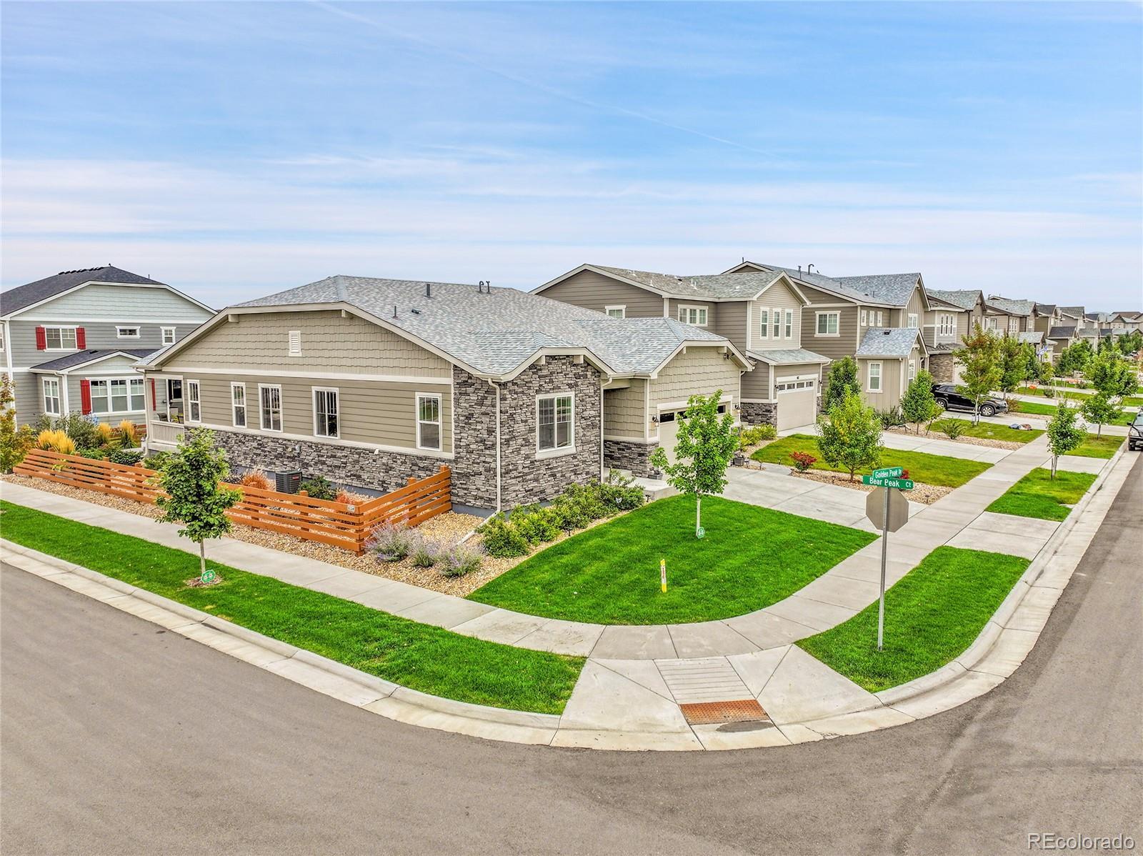 Welcome home to this beautiful ranch-style home - loaded with builder upgrades! Located in Colliers Hill, one Erie's most desirable neighborhoods, this home offers the perfect blend of quality, comfort, low-maintenance living, and neighborhood amenities. As you walk up to the home, you will be welcomed by a corner lot with beautiful landscaping and enter through a covered front porch. As you step inside, take note of the high ceilings, beautiful flooring, and expansive windows that fill the open-concept living spaces with natural light. The open floorplan creates an easy flow between the kitchen, living, dining, and outdoor areas, making it perfect for entertaining or relaxing at home. Don't miss the front office space as you walk through, which is perfect for those which work from home, or convert to an additional bedroom. At the heart of the home is a stunning kitchen featuring quartz countertops, stainless steel appliances, beautiful herringbone tile backsplash, and an oversized island. The spacious primary suite feels like a private retreat, with a spa-inspired bathroom, dual sinks, walk-in shower, and huge closet. Two additional bedrooms and an additional full bath provide privacy for guests. Enjoy the convenience of smart home technology, a covered back patio with ceiling fan, built-in speakers, and beautiful landscaping - perfect for entertaining guests or relaxing with loved ones. Take note of the drywalled/insulated extended 2-car garage for additional storage space! Colliers Hill offers resort-style amenities including miles of paved walking trails, a clubhouse, multiple swimming pools, and vast open spaces—perfect for staying active or simply unwinding outdoors. Thoughtfully upgraded and beautifully maintained, this home is a rare opportunity for those seeking modern comfort and timeless style. For additional info regarding home features, please see MLS supplements.