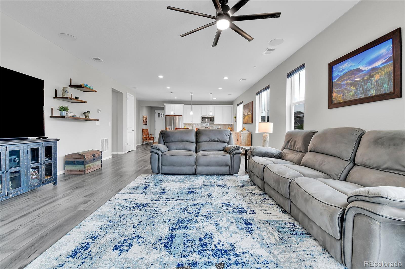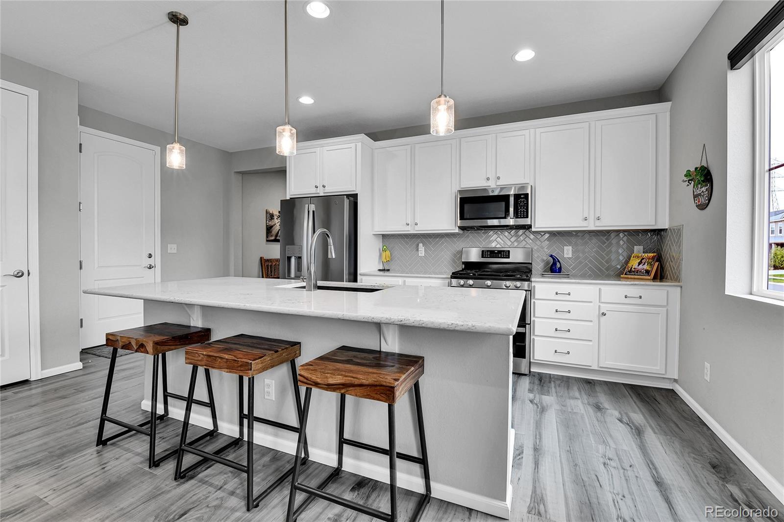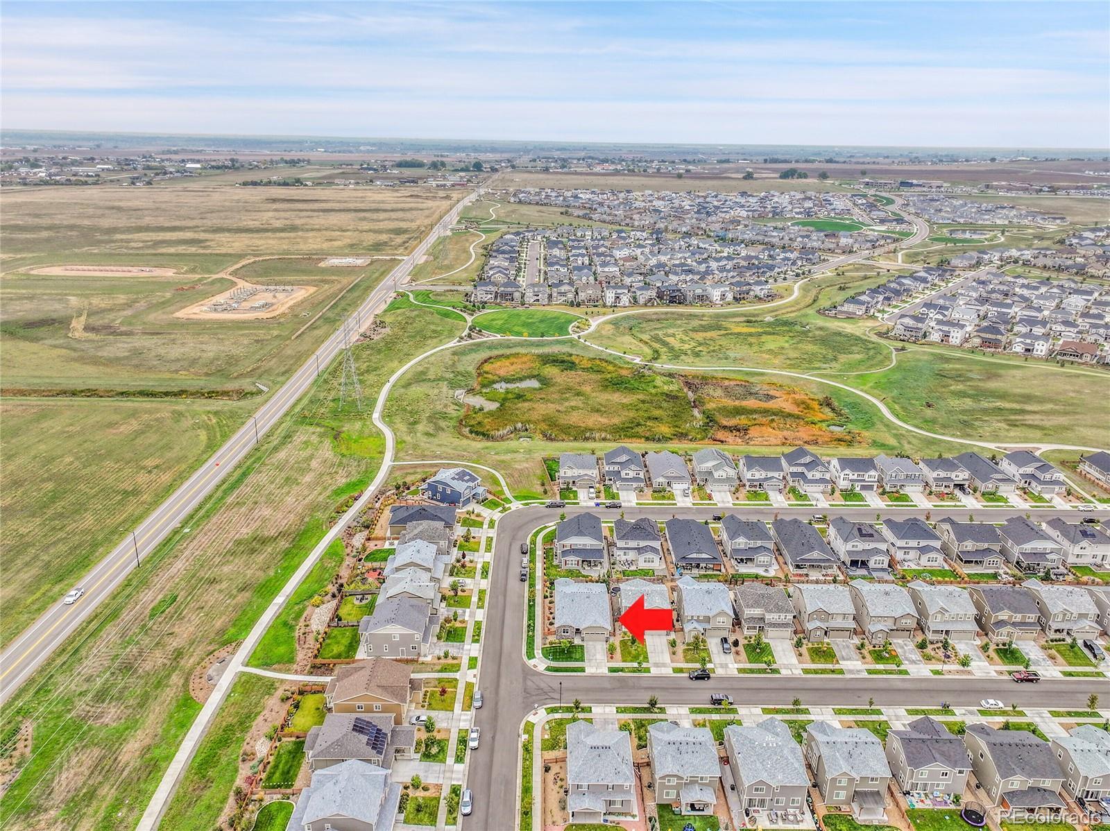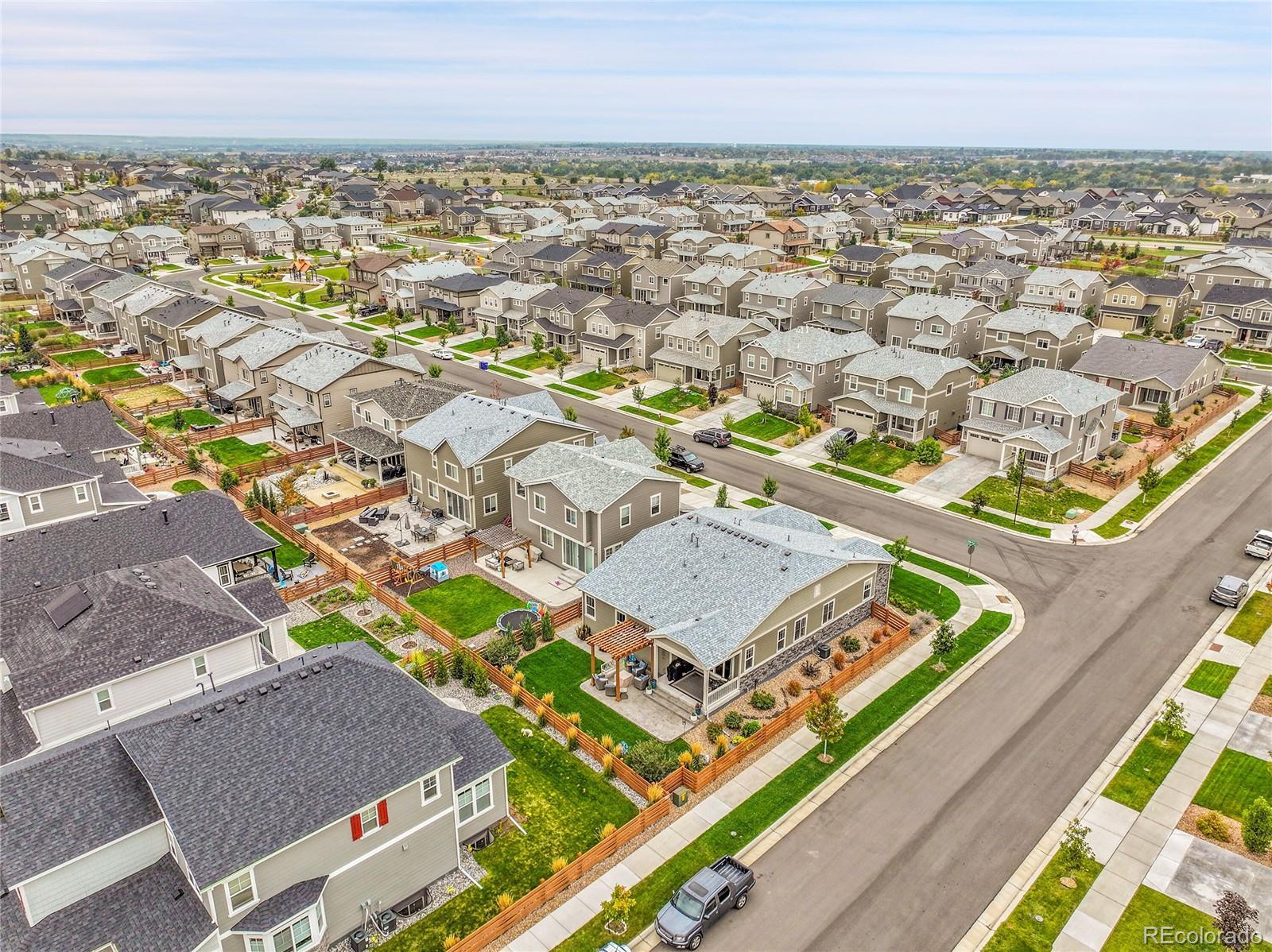 Welcome home to this beautiful ranch-style home - loaded with builder upgrades! Located in Colliers Hill, one Erie's most desirable neighborhoods, this home offers the perfect blend of quality, comfort, low-maintenance living, and neighborhood amenities. As you walk up to the home, you will be welcomed by a corner lot with beautiful landscaping and enter through a covered front porch. As you step inside, take note of the high ceilings, beautiful flooring, and expansive windows that fill the open-concept living spaces with natural light. The open floorplan creates an easy flow between the kitchen, living, dining, and outdoor areas, making it perfect for entertaining or relaxing at home. Don't miss the front office space as you walk through, which is perfect for those which work from home, or convert to an additional bedroom. At the heart of the home is a stunning kitchen featuring quartz countertops, stainless steel appliances, beautiful herringbone tile backsplash, and an oversized island. The spacious primary suite feels like a private retreat, with a spa-inspired bathroom, dual sinks, walk-in shower, and huge closet. Two additional bedrooms and an additional full bath provide privacy for guests. Enjoy the convenience of smart home technology, a covered back patio with ceiling fan, built-in speakers, and beautiful landscaping - perfect for entertaining guests or relaxing with loved ones. Take note of the drywalled/insulated extended 2-car garage for additional storage space! Colliers Hill offers resort-style amenities including miles of paved walking trails, a clubhouse, multiple swimming pools, and vast open spaces—perfect for staying active or simply unwinding outdoors. Thoughtfully upgraded and beautifully maintained, this home is a rare opportunity for those seeking modern comfort and timeless style. For additional info regarding home features, please see MLS supplements.