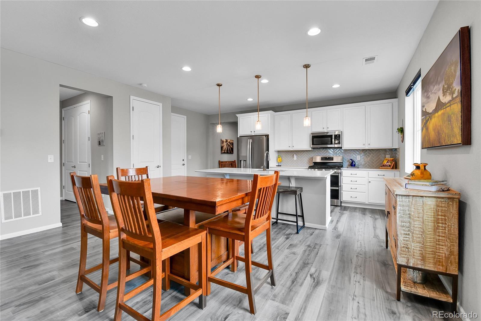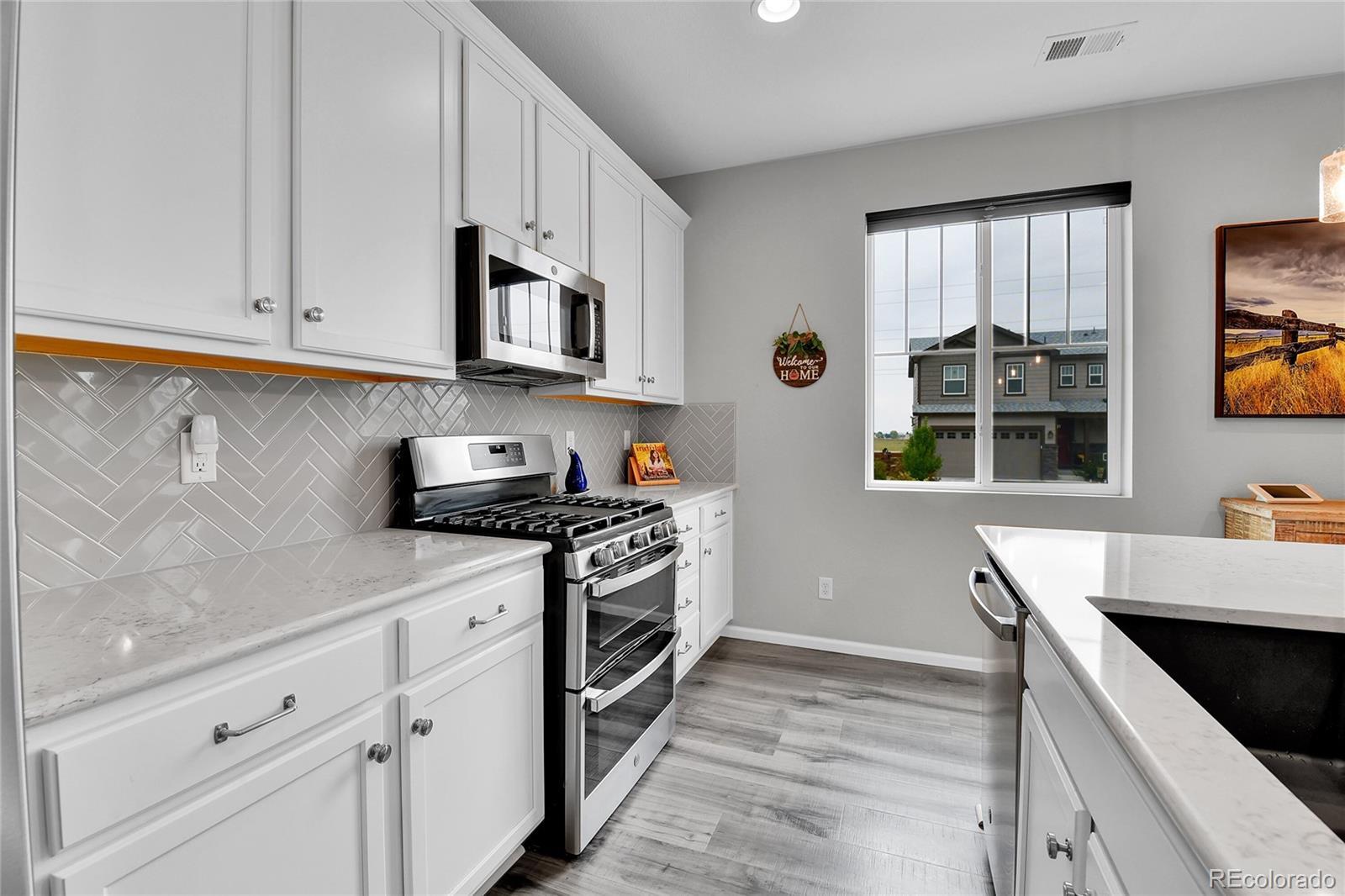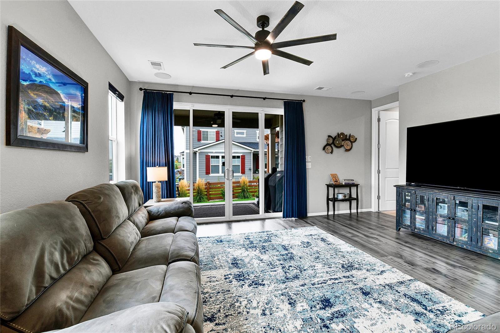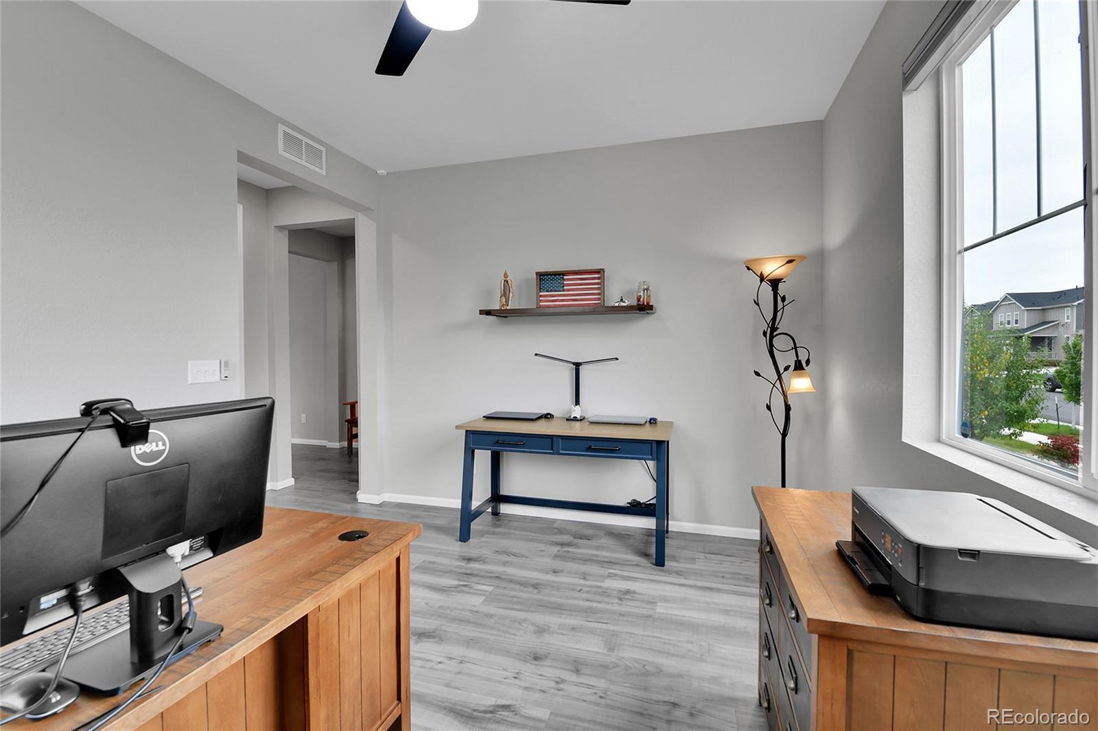 Welcome home to this beautiful ranch-style home - loaded with builder upgrades! Located in Colliers Hill, one Erie's most desirable neighborhoods, this home offers the perfect blend of quality, comfort, low-maintenance living, and neighborhood amenities. As you walk up to the home, you will be welcomed by a corner lot with beautiful landscaping and enter through a covered front porch. As you step inside, take note of the high ceilings, beautiful flooring, and expansive windows that fill the open-concept living spaces with natural light. The open floorplan creates an easy flow between the kitchen, living, dining, and outdoor areas, making it perfect for entertaining or relaxing at home. Don't miss the front office space as you walk through, which is perfect for those which work from home, or convert to an additional bedroom. At the heart of the home is a stunning kitchen featuring quartz countertops, stainless steel appliances, beautiful herringbone tile backsplash, and an oversized island. The spacious primary suite feels like a private retreat, with a spa-inspired bathroom, dual sinks, walk-in shower, and huge closet. Two additional bedrooms and an additional full bath provide privacy for guests. Enjoy the convenience of smart home technology, a covered back patio with ceiling fan, built-in speakers, and beautiful landscaping - perfect for entertaining guests or relaxing with loved ones. Take note of the drywalled/insulated extended 2-car garage for additional storage space! Colliers Hill offers resort-style amenities including miles of paved walking trails, a clubhouse, multiple swimming pools, and vast open spaces—perfect for staying active or simply unwinding outdoors. Thoughtfully upgraded and beautifully maintained, this home is a rare opportunity for those seeking modern comfort and timeless style. For additional info regarding home features, please see MLS supplements.