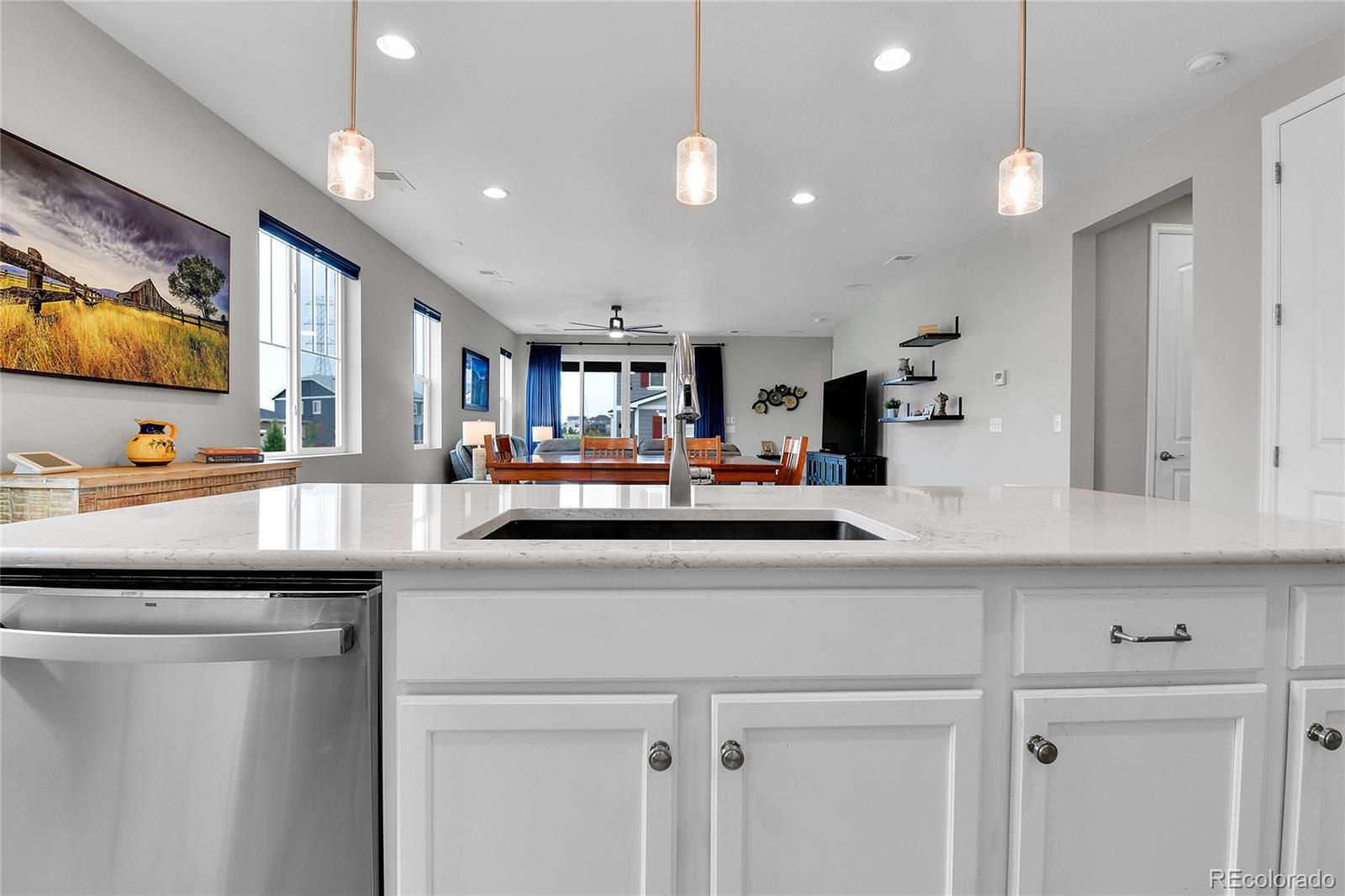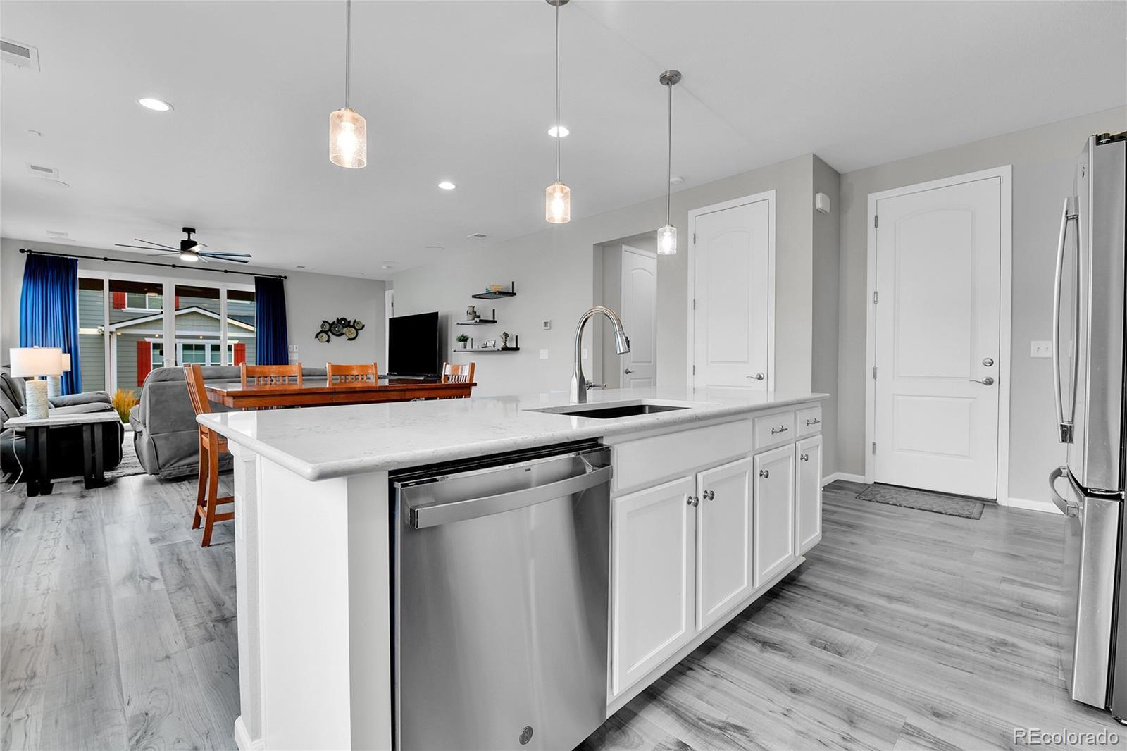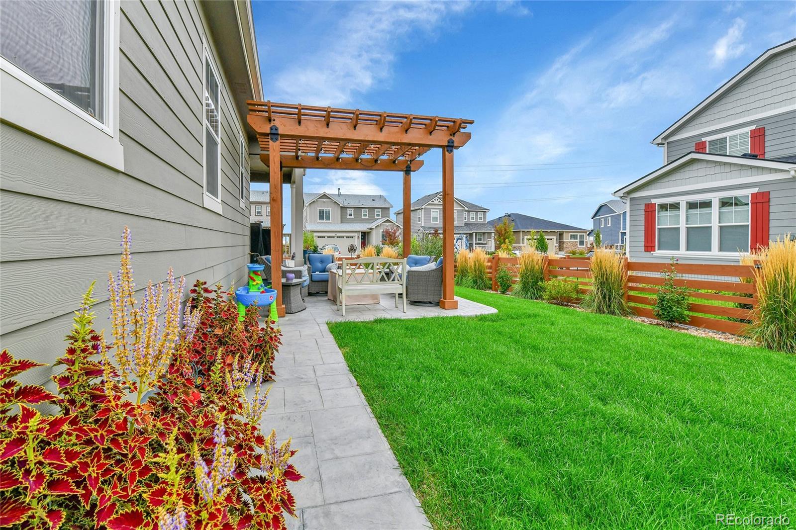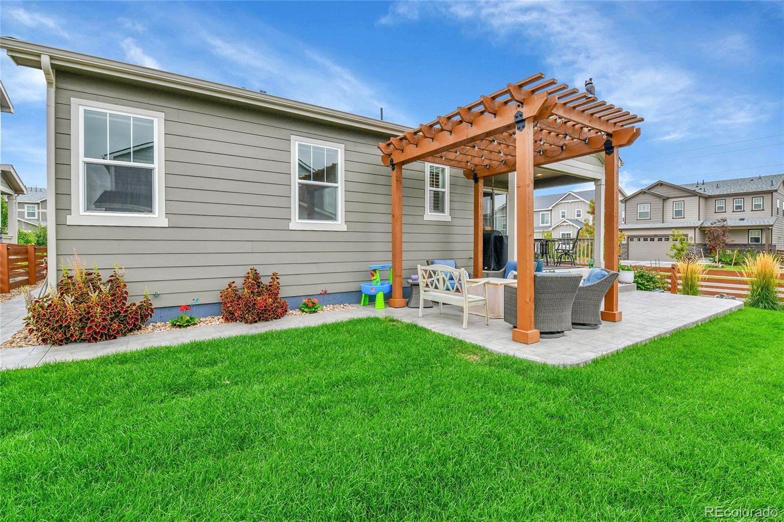 Welcome home to this beautiful ranch-style home - loaded with builder upgrades! Located in Colliers Hill, one Erie's most desirable neighborhoods, this home offers the perfect blend of quality, comfort, low-maintenance living, and neighborhood amenities. As you walk up to the home, you will be welcomed by a corner lot with beautiful landscaping and enter through a covered front porch. As you step inside, take note of the high ceilings, beautiful flooring, and expansive windows that fill the open-concept living spaces with natural light. The open floorplan creates an easy flow between the kitchen, living, dining, and outdoor areas, making it perfect for entertaining or relaxing at home. Don't miss the front office space as you walk through, which is perfect for those which work from home, or convert to an additional bedroom. At the heart of the home is a stunning kitchen featuring quartz countertops, stainless steel appliances, beautiful herringbone tile backsplash, and an oversized island. The spacious primary suite feels like a private retreat, with a spa-inspired bathroom, dual sinks, walk-in shower, and huge closet. Two additional bedrooms and an additional full bath provide privacy for guests. Enjoy the convenience of smart home technology, a covered back patio with ceiling fan, built-in speakers, and beautiful landscaping - perfect for entertaining guests or relaxing with loved ones. Take note of the drywalled/insulated extended 2-car garage for additional storage space! Colliers Hill offers resort-style amenities including miles of paved walking trails, a clubhouse, multiple swimming pools, and vast open spaces—perfect for staying active or simply unwinding outdoors. Thoughtfully upgraded and beautifully maintained, this home is a rare opportunity for those seeking modern comfort and timeless style. For additional info regarding home features, please see MLS supplements.