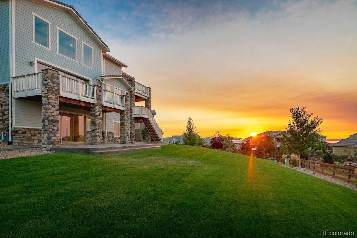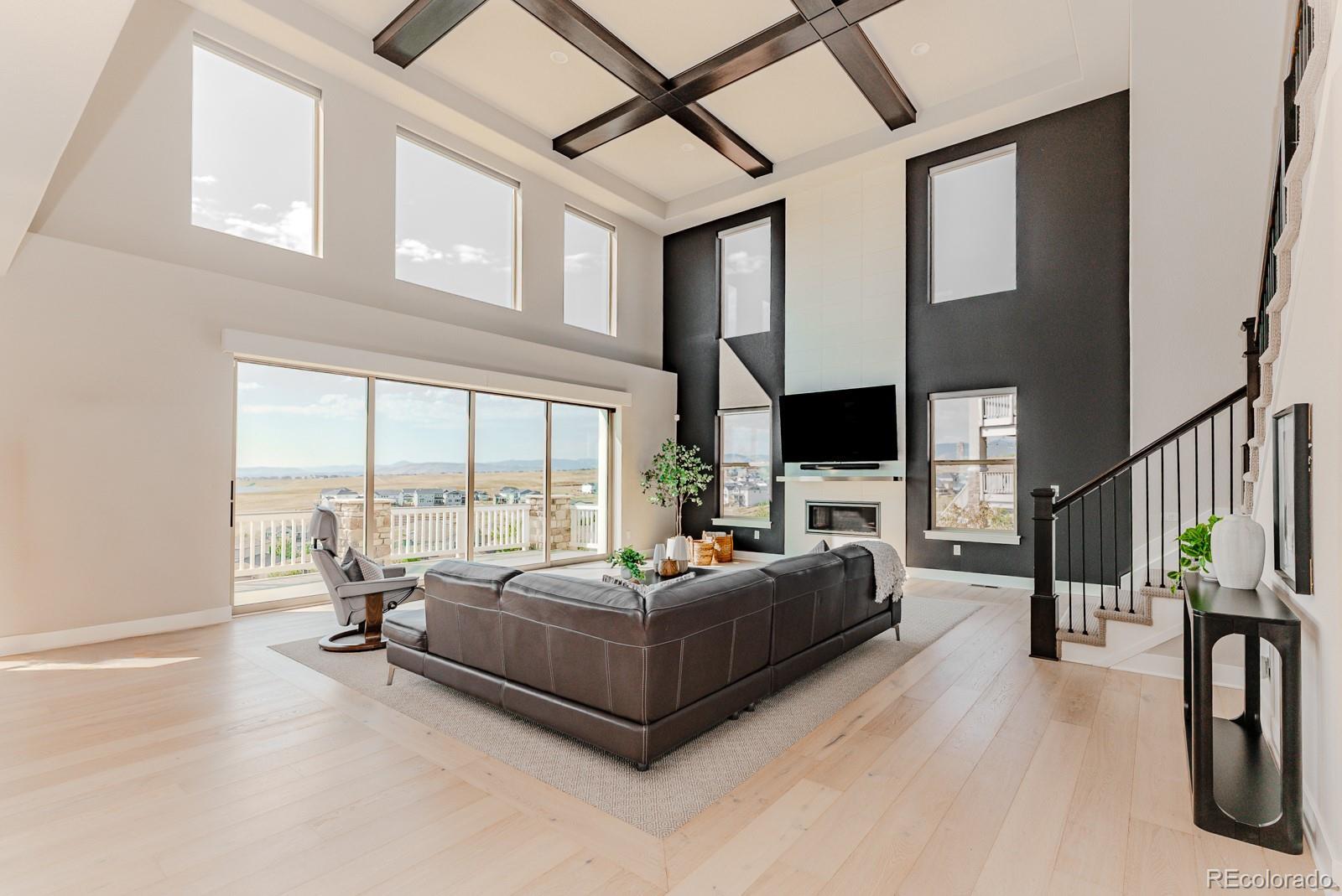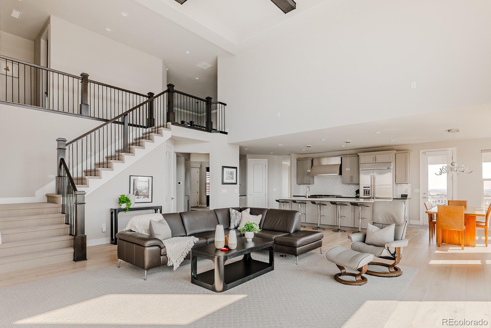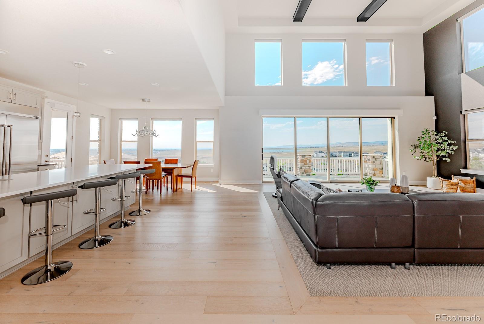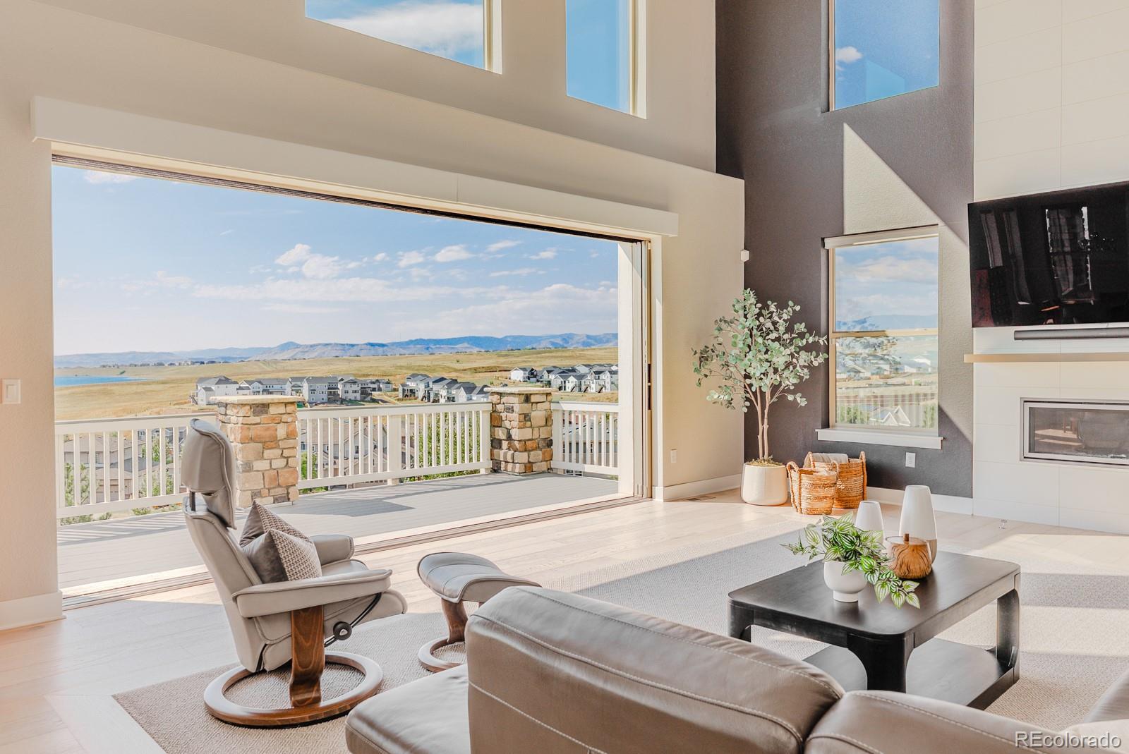 Where architecture meets the horizon, this extraordinary Candelas estate rises high above the neighborhood to frame Colorado’s most breathtaking views unveiling sweeping mountains, shimmering lakes and Downtown Denver’s twinkling lights. Claiming one of the area’s most coveted lots, this 5-bed, 7-bath residence spans over 6,500 sqft and enjoys rare privacy with open space at both the front and back. Nearly half an acre of grounds becomes an extension of daily life, with cascading decks and covered outdoor retreats designed to capture the signature sunsets painted across boundless skies. Inside, the great room opens with the sculptural presence of 20ft ceilings, intersecting beams and clerestory windows that flood the south facing space with ever-shifting light. A dramatic 16ft glass door disappears into the wall erasing the boundaries between indoors and out while a two story linear fireplace brings both texture and warmth setting the tone for gatherings both grand and intimate. At the heart of the home, the chef’s kitchen is both culinary stage and design statement. Elegant cabinetry and a broad quartz island create visual balance, while the professional JennAir appliance suite- defined by a commanding 48-inch six-burner range, three ovens, built-in refrigerator and stainless farm sink- delivers performance worthy of the most ambitious cook. Open sightlines connect seamlessly to formal and informal dining ensuring every meal is set against a backdrop of horizon views. The palatial primary suite becomes a private haven lifted high above the landscape, with walls of windows and a private balcony. The spa-inspired bath pairs marble, glass and light in a curated composition, uniting a freestanding tub with dual showers in a luminous wet room. Two additional ensuite bedrooms complete the upstairs while the finished walk-out basement extends the living experience with a full wet bar, media and game spaces, fitness area and a guest suite—all opening to the expansive yard.