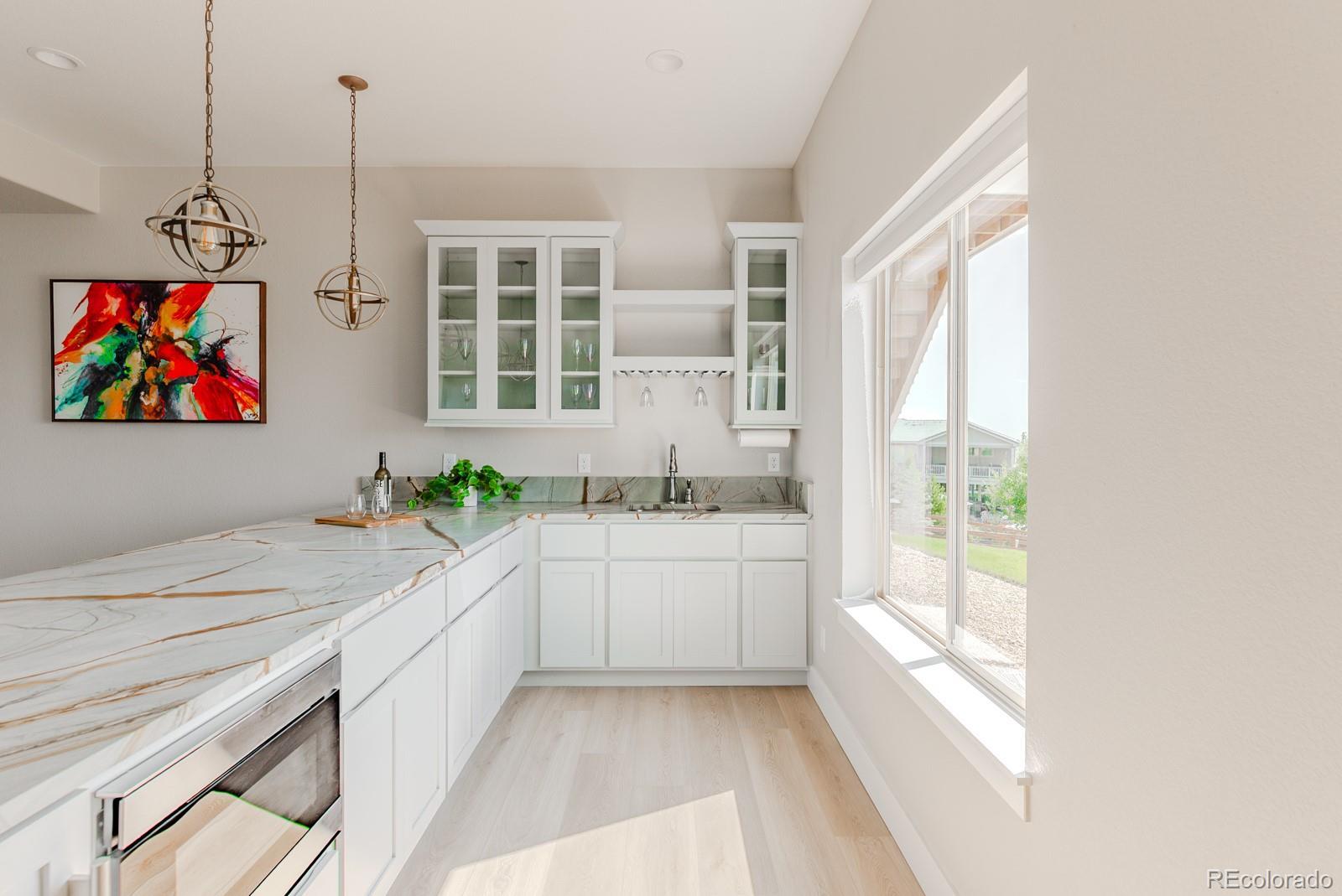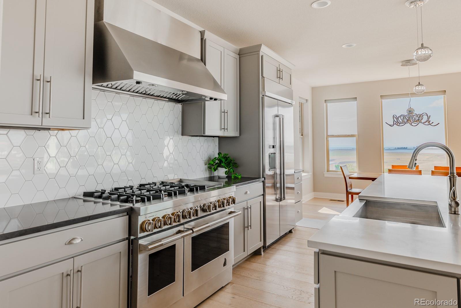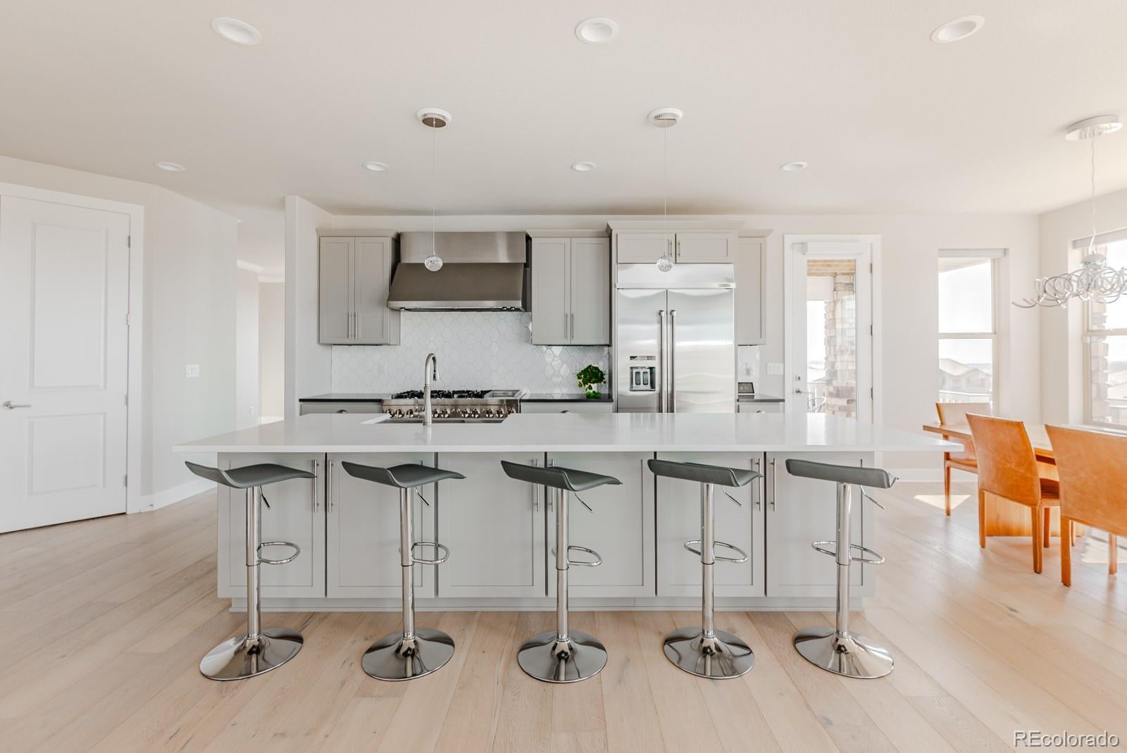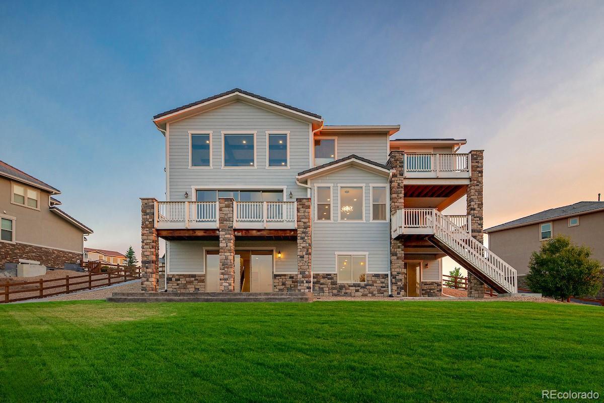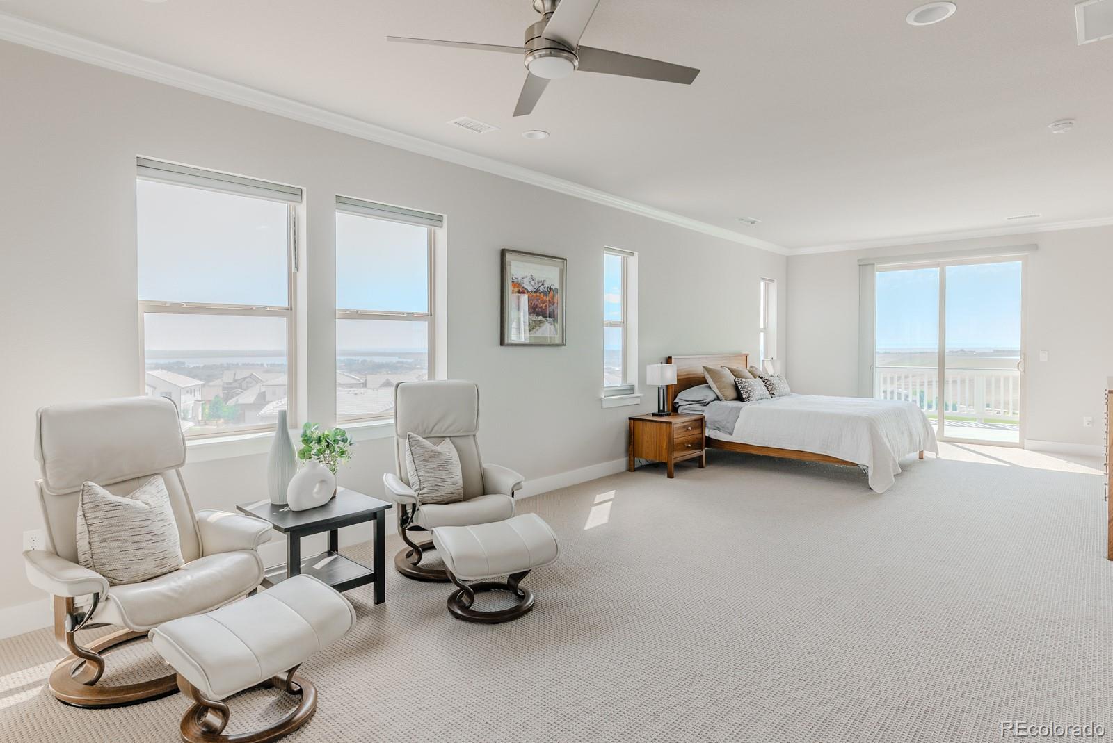 Where architecture meets the horizon, this extraordinary Candelas estate rises high above the neighborhood to frame Colorado’s most breathtaking views unveiling sweeping mountains, shimmering lakes and Downtown Denver’s twinkling lights. Claiming one of the area’s most coveted lots, this 5-bed, 7-bath residence spans over 6,500 sqft and enjoys rare privacy with open space at both the front and back. Nearly half an acre of grounds becomes an extension of daily life, with cascading decks and covered outdoor retreats designed to capture the signature sunsets painted across boundless skies. Inside, the great room opens with the sculptural presence of 20ft ceilings, intersecting beams and clerestory windows that flood the south facing space with ever-shifting light. A dramatic 16ft glass door disappears into the wall erasing the boundaries between indoors and out while a two story linear fireplace brings both texture and warmth setting the tone for gatherings both grand and intimate. At the heart of the home, the chef’s kitchen is both culinary stage and design statement. Elegant cabinetry and a broad quartz island create visual balance, while the professional JennAir appliance suite- defined by a commanding 48-inch six-burner range, three ovens, built-in refrigerator and stainless farm sink- delivers performance worthy of the most ambitious cook. Open sightlines connect seamlessly to formal and informal dining ensuring every meal is set against a backdrop of horizon views. The palatial primary suite becomes a private haven lifted high above the landscape, with walls of windows and a private balcony. The spa-inspired bath pairs marble, glass and light in a curated composition, uniting a freestanding tub with dual showers in a luminous wet room. Two additional ensuite bedrooms complete the upstairs while the finished walk-out basement extends the living experience with a full wet bar, media and game spaces, fitness area and a guest suite—all opening to the expansive yard.