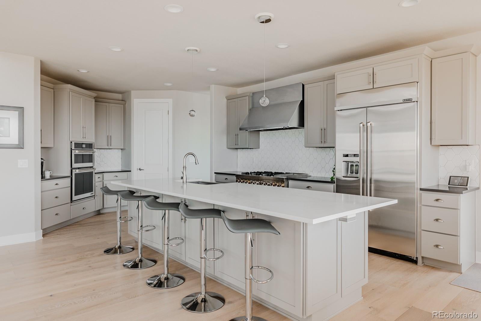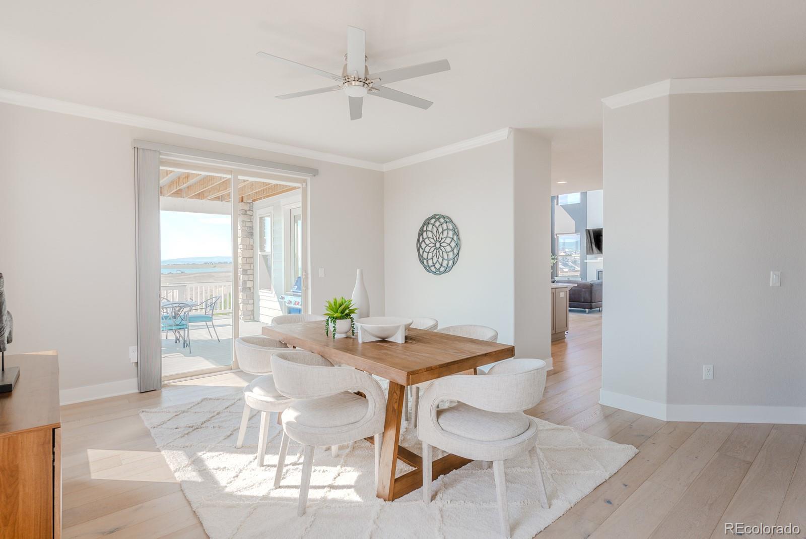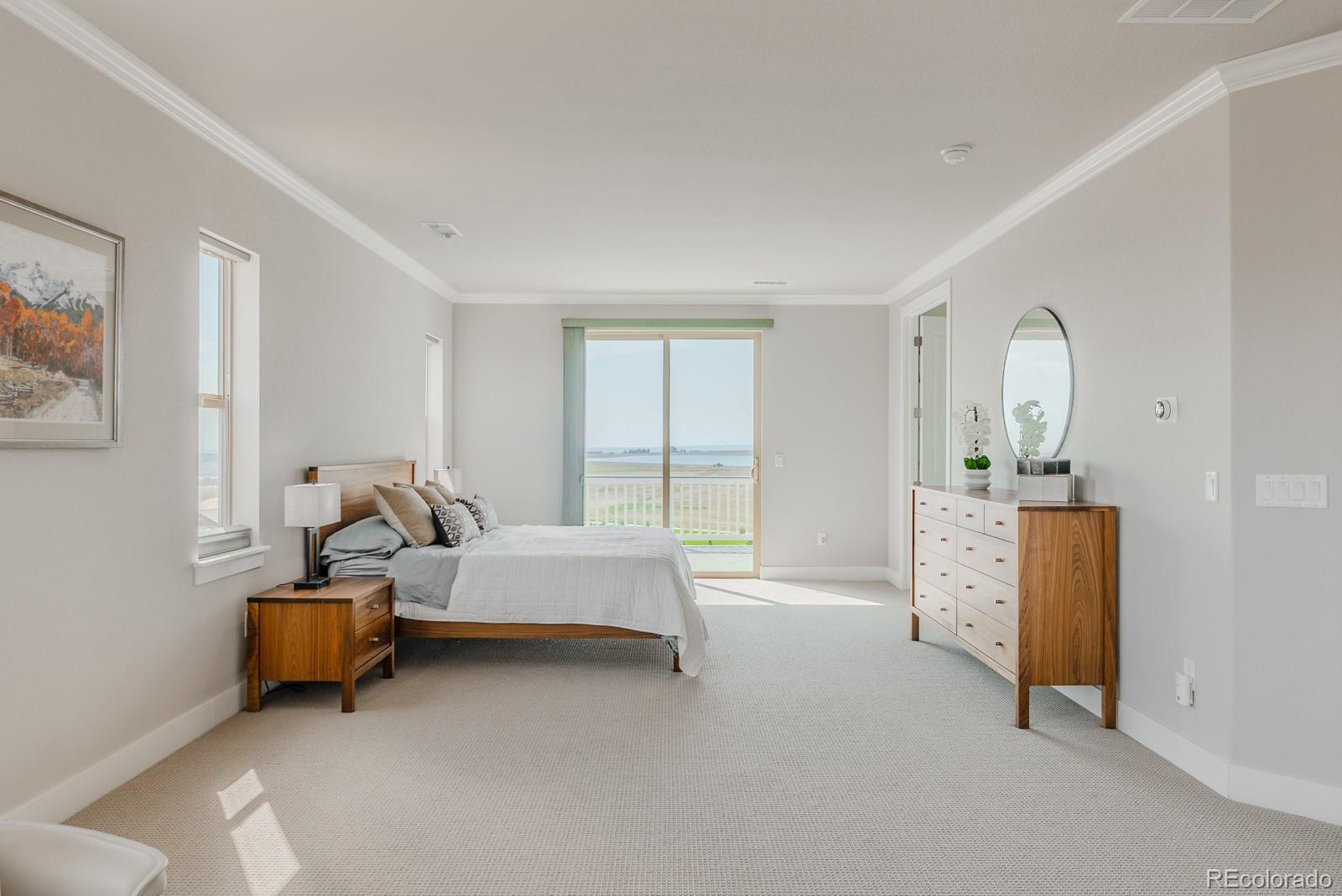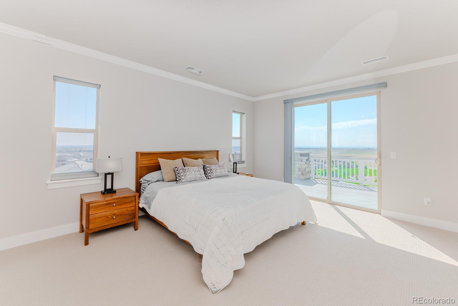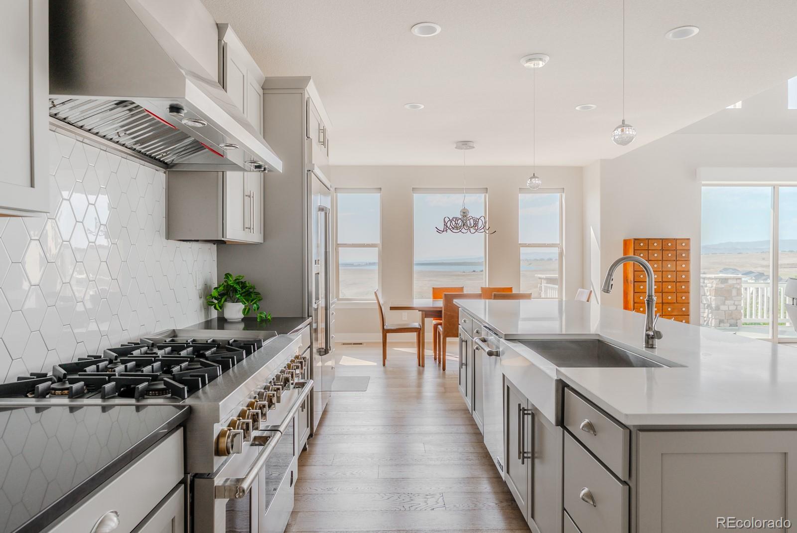 Where architecture meets the horizon, this extraordinary Candelas estate rises high above the neighborhood to frame Colorado’s most breathtaking views unveiling sweeping mountains, shimmering lakes and Downtown Denver’s twinkling lights. Claiming one of the area’s most coveted lots, this 5-bed, 7-bath residence spans over 6,500 sqft and enjoys rare privacy with open space at both the front and back. Nearly half an acre of grounds becomes an extension of daily life, with cascading decks and covered outdoor retreats designed to capture the signature sunsets painted across boundless skies. Inside, the great room opens with the sculptural presence of 20ft ceilings, intersecting beams and clerestory windows that flood the south facing space with ever-shifting light. A dramatic 16ft glass door disappears into the wall erasing the boundaries between indoors and out while a two story linear fireplace brings both texture and warmth setting the tone for gatherings both grand and intimate. At the heart of the home, the chef’s kitchen is both culinary stage and design statement. Elegant cabinetry and a broad quartz island create visual balance, while the professional JennAir appliance suite- defined by a commanding 48-inch six-burner range, three ovens, built-in refrigerator and stainless farm sink- delivers performance worthy of the most ambitious cook. Open sightlines connect seamlessly to formal and informal dining ensuring every meal is set against a backdrop of horizon views. The palatial primary suite becomes a private haven lifted high above the landscape, with walls of windows and a private balcony. The spa-inspired bath pairs marble, glass and light in a curated composition, uniting a freestanding tub with dual showers in a luminous wet room. Two additional ensuite bedrooms complete the upstairs while the finished walk-out basement extends the living experience with a full wet bar, media and game spaces, fitness area and a guest suite—all opening to the expansive yard.