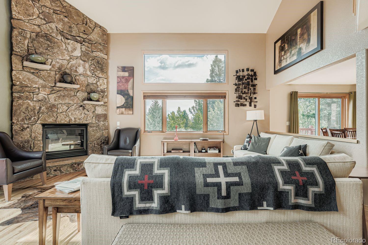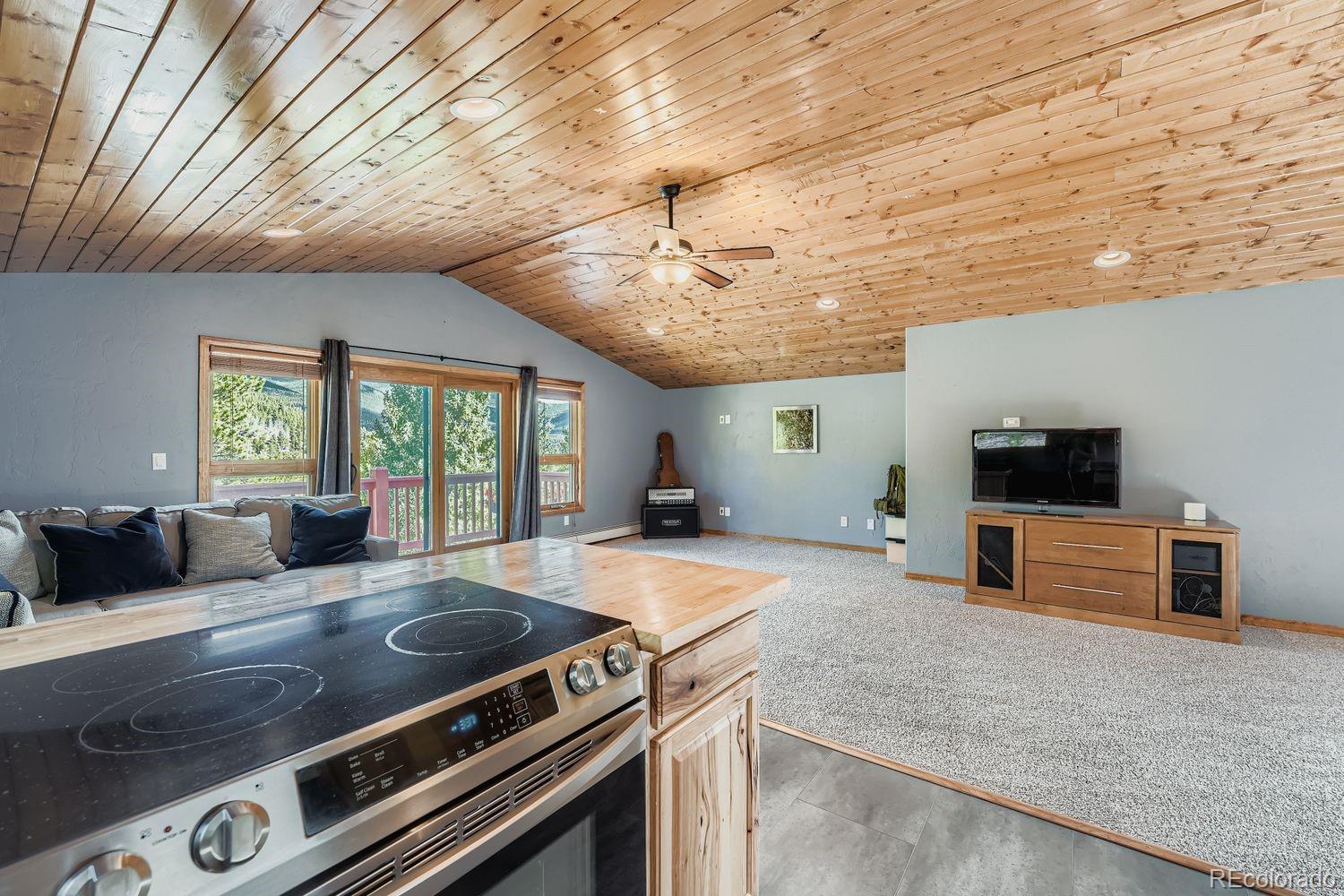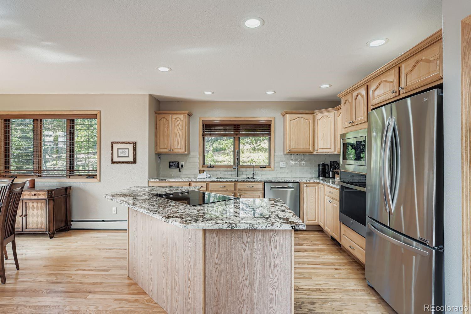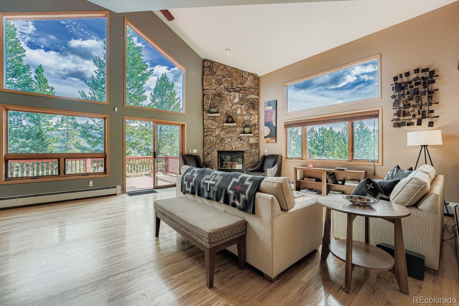 Private site with 5-car heated garage, level paved driveway & studio ADU-This one is special! Beautiful custom mountain contemporary on 3.29 private and usable acres with big foothill and valley views! The paved drive leads to a welcoming covered porch and a home designed for light, space, and everyday comfort. The main level features a sun-filled great room with soaring T&G ceilings, hardwood floors, and a stone fireplace that anchors the space. The open kitchen is a dream—granite island and counters, stainless appliances, and pantry—flowing easily into the dining area and out to wide decks for morning coffee or sunset dinners. Upstairs, you’ll find a loft, spacious bedrooms, and a luxurious primary suite with dual walk-in closets, private balcony, and spa bath with jetted tub and granite vanities. The walk-out level adds a huge family room, guest suite, and tall ceilings. Car lovers will love the heated 5-car garage plus RV parking and storage! Bonus: an upper-level studio with full kitchen and bath—perfect for guests, office, or multi-gen living. Radiant heat, Buderus boiler, generator, and high-speed internet. Peaceful Forest Ridge location just minutes to Hwy 285, Staunton State Park, and Pike National Forest. Move-in ready—this one has it all!