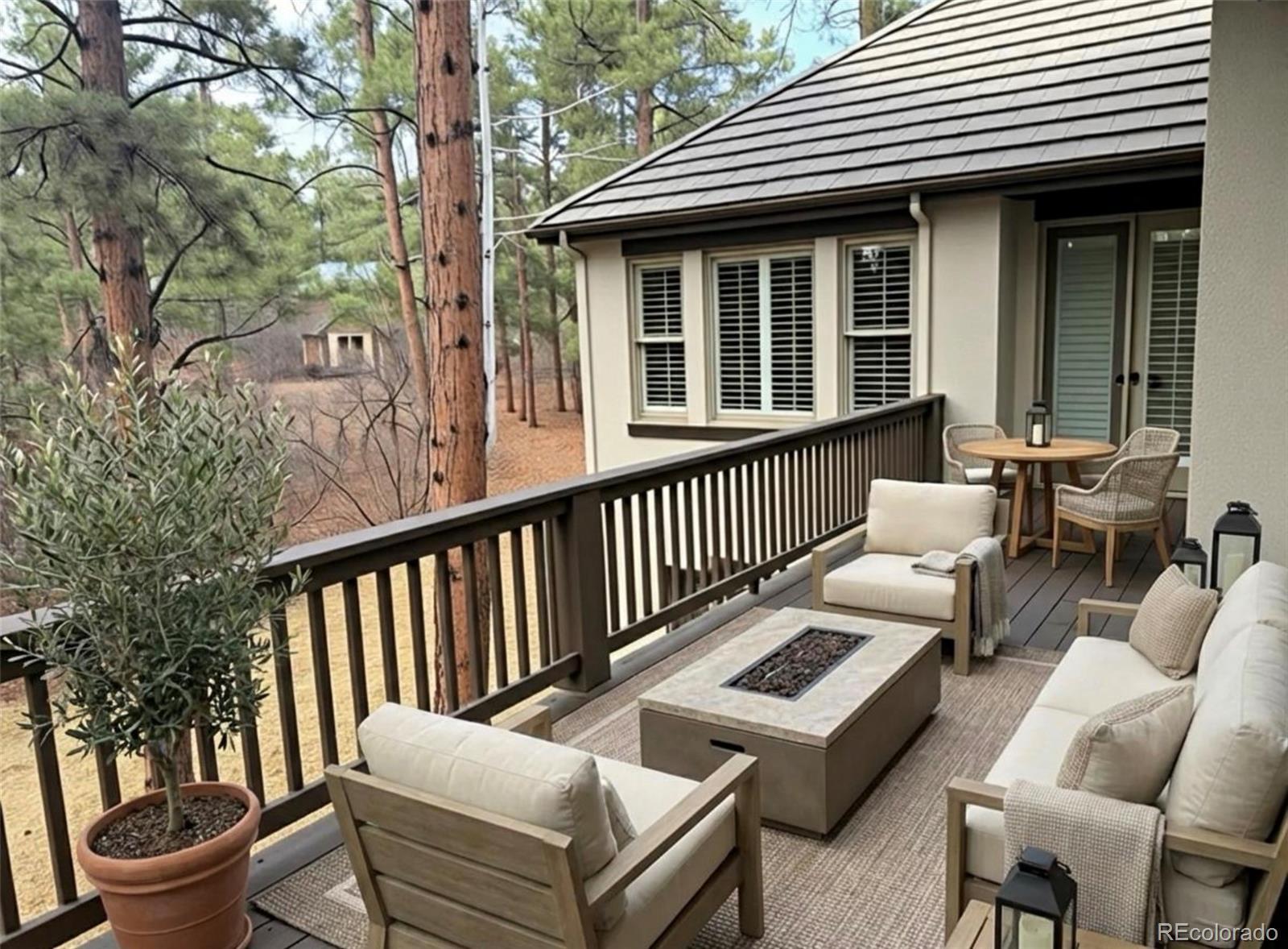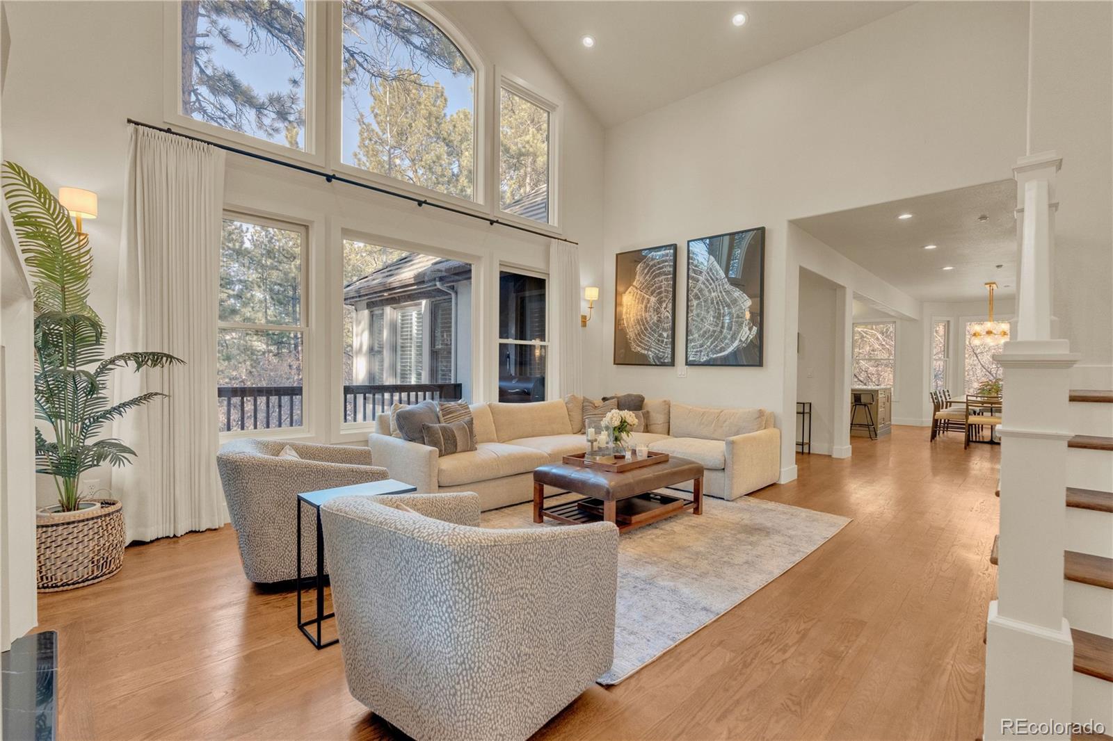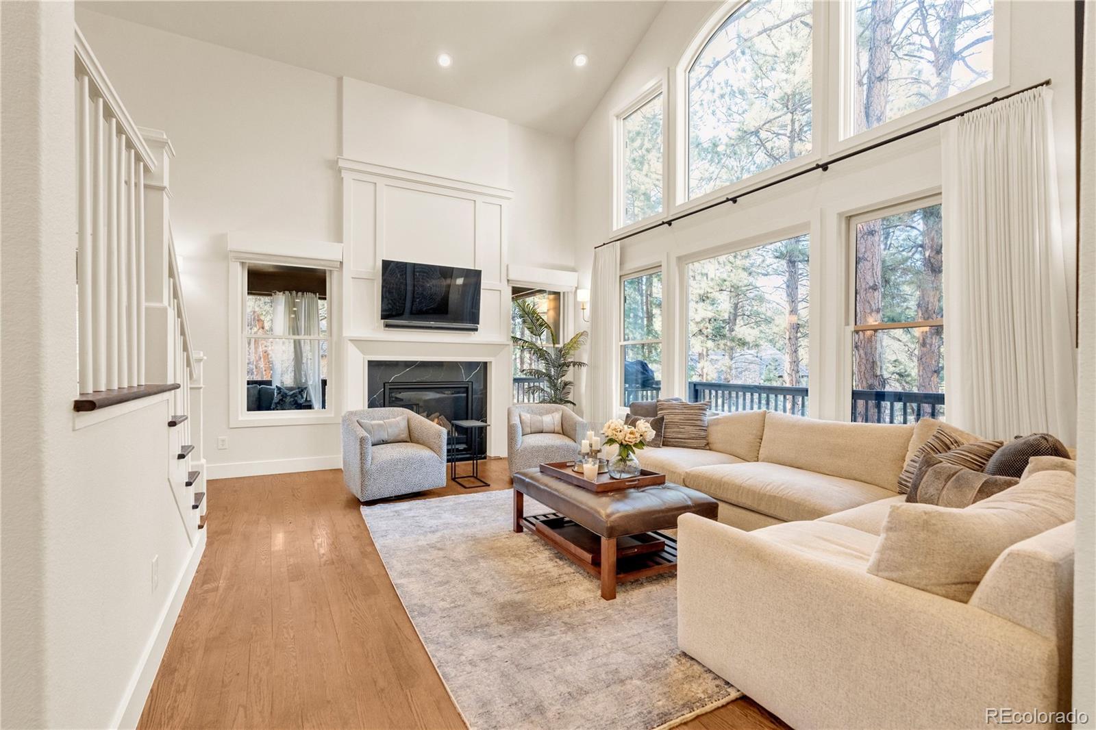 Set quietly among the towering pines of Castle Pines Village, this beautifully updated home offers the perfect blend of privacy, thoughtful design, and modern comfort on nearly 3/4 of an acre. With over 5,700 square feet, a main-floor primary suite and an easy-flowing layout, it lives like a ranch while still offering generous space for everyday living and entertaining. Expansive windows bring in natural light and frame peaceful forest-like views throughout. The remodeled chef’s kitchen is truly the heart of the home, featuring quartzite surfaces, custom cabinetry, & high-end appliances, all designed with both function & style in mind. Sunlit living spaces connect seamlessly to a wrap-around deck that is accessible from the primary suite. The expansive deck creates a quiet outdoor setting that feels tucked into nature — something buyers love about Village living. With an outdoor TV & privacy curtains, this deck creates a stunning extension of the home & the perfect setting to relax or entertain while surrounded by Colorado’s natural beauty. Upstairs there are 3 additional bedrooms and 2 baths. Bedroom 3 has a freshly remodeled en suite bath. While the walk-out lower level includes a media & recreation space, wet bar, gas fireplace, 2 bedrooms, and a newly remodeled full bath. Which provides ideal space for gatherings, movie nights, or hosting guests. Private, welcoming, and effortlessly livable, this Castle Pines Village residence captures the feeling of Colorado living at its best.