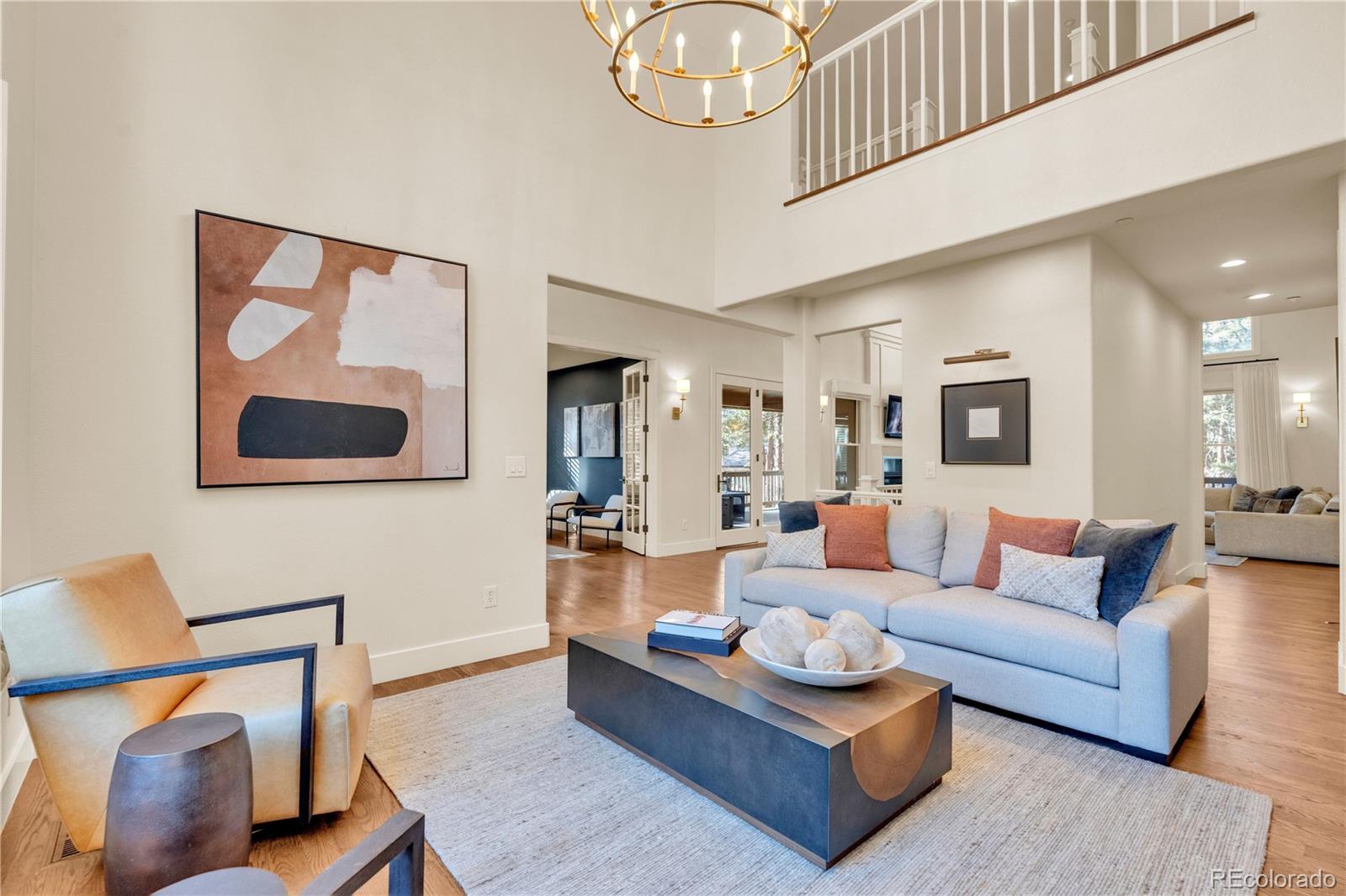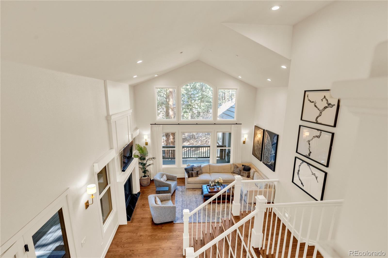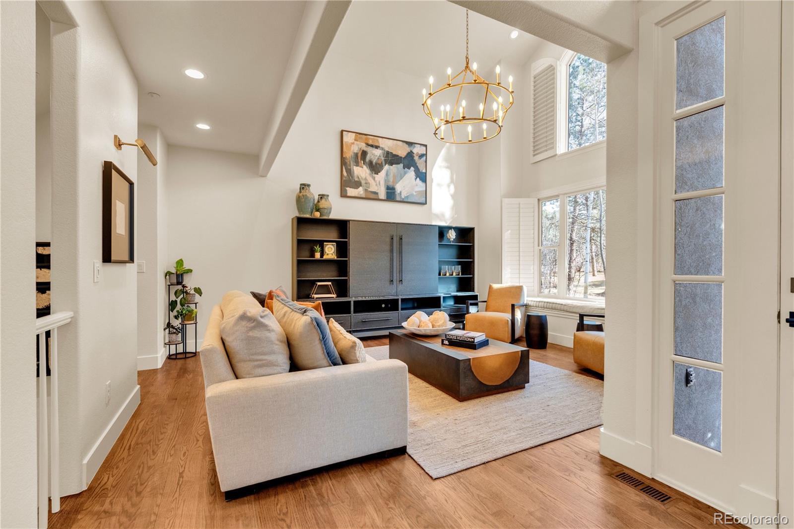 Set quietly among the towering pines of Castle Pines Village, this beautifully updated home offers the perfect blend of privacy, thoughtful design, and modern comfort on nearly 3/4 of an acre. With over 5,700 square feet, a main-floor primary suite and an easy-flowing layout, it lives like a ranch while still offering generous space for everyday living and entertaining. Expansive windows bring in natural light and frame peaceful forest-like views throughout. The remodeled chef’s kitchen is truly the heart of the home, featuring quartzite surfaces, custom cabinetry, & high-end appliances, all designed with both function & style in mind. Sunlit living spaces connect seamlessly to a wrap-around deck that is accessible from the primary suite. The expansive deck creates a quiet outdoor setting that feels tucked into nature — something buyers love about Village living. With an outdoor TV & privacy curtains, this deck creates a stunning extension of the home & the perfect setting to relax or entertain while surrounded by Colorado’s natural beauty. Upstairs there are 3 additional bedrooms and 2 baths. Bedroom 3 has a freshly remodeled en suite bath. While the walk-out lower level includes a media & recreation space, wet bar, gas fireplace, 2 bedrooms, and a newly remodeled full bath. Which provides ideal space for gatherings, movie nights, or hosting guests. Private, welcoming, and effortlessly livable, this Castle Pines Village residence captures the feeling of Colorado living at its best.