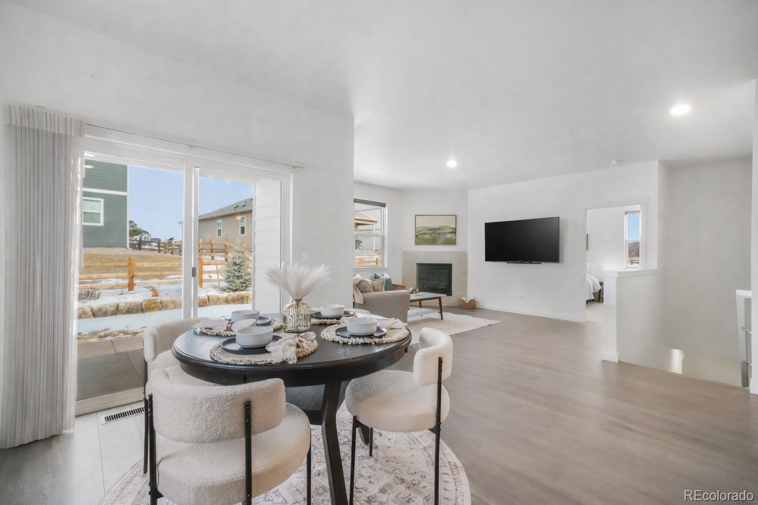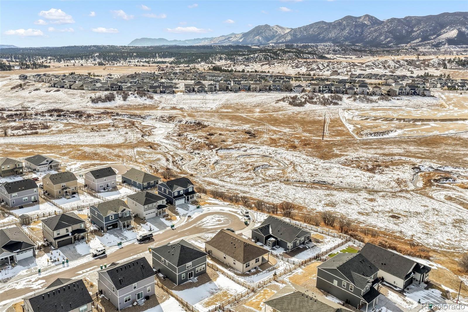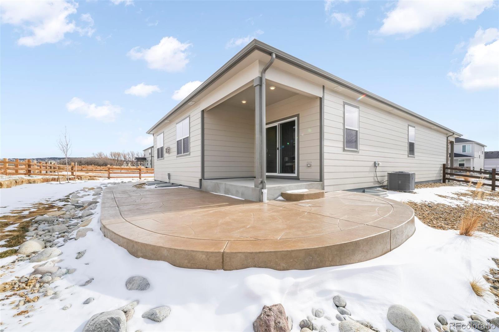 Nestled in a quiet cul de sac in Willow Springs Ranch, this beautifully maintained home offers exceptional mountain views, a neutral designer palette, and easy access to I-25 and downtown Monument. Thoughtfully designed for main level living, the home features luxury vinyl plank flooring throughout the main living spaces. The open concept kitchen is a standout with upgraded cabinetry, stainless steel appliances including a gas stove top, a walk-in pantry, and a large island ideal for gathering and entertaining. The kitchen flows seamlessly into a spacious dining area and inviting living room anchored by a cozy gas fireplace. A sliding glass door leads to the covered back patio, which has been extended with stamped concrete and complemented by a stamped concrete walkway, creating an ideal outdoor living space. The primary suite offers a generously sized bedroom and an ensuite bath with dual sinks, step-in shower, private water closet, and a large walk-in closet. The main level also includes three secondary bedrooms, a full hallway bathroom and a laundry room with new washer and dryer included. The unfinished basement provides excellent expansion potential with a rough-in for an additional bathroom, allowing future owners to customize to their needs. Additional highlights include a 2-car attached garage, split rail fencing, central air conditioning and fully landscaped front and back yards. This move-in ready home combines comfort, functionality, and location in one of Monument’s newest neighborhoods!