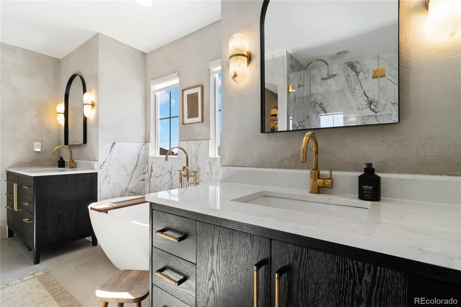 Step into designer luxury at its finest in this stunningly reimagined Solterra residence, where every detail has been elevated with style and sophistication. This interior designer’s personal home showcases a complete transformation—featuring new engineered hardwood flooring, a custom staircase with white oak treads and wrought iron railings, and curated finishes that blend comfort and elegance. Additional upgrades include a whole-house steam humidifier and 220 for future EV charger in the garage, enhancing wellness and convenience. The inviting great room flows effortlessly into a chef’s kitchen with an expanded quartz island, all-new appliances—including an Ilve gas range with a custom Roman clay hood—designer lighting, and a spacious butler’s pantry with coffee/bar area and walk-in pantry. A formal dining room and private home office offer functionality and flair, while the living area opens to a beautifully landscaped backyard with mature trees providing exceptional privacy—rare for the neighborhood—and no homes behind. The large patio and landscape lighting create a warm evening ambiance, perfect for entertaining or quiet nights beneath Colorado’s star-filled sky. Completing the main level are a moody powder room and a laundry/mudroom off the garage. Upstairs, the primary suite feels like a serene retreat with illuminated built-ins, dual walk-in closets, and a spa-inspired bath with soaking tub, dual vanities, and oversized shower—all enhanced by custom brass fixtures. Two bedrooms share a chic Jack-and-Jill bath, and the versatile loft—with sleek built-ins—offers flexible space or a potential fifth bedroom. The finished basement extends the living area with a custom wet bar, media lounge, playroom, and guest suite with bath. Enjoy resort-style living with Solterra clubhouse, infinity pool, tennis courts, and miles of scenic trails. With sweeping views of the Front Range and Red Rocks, this home embodies refined Colorado living.