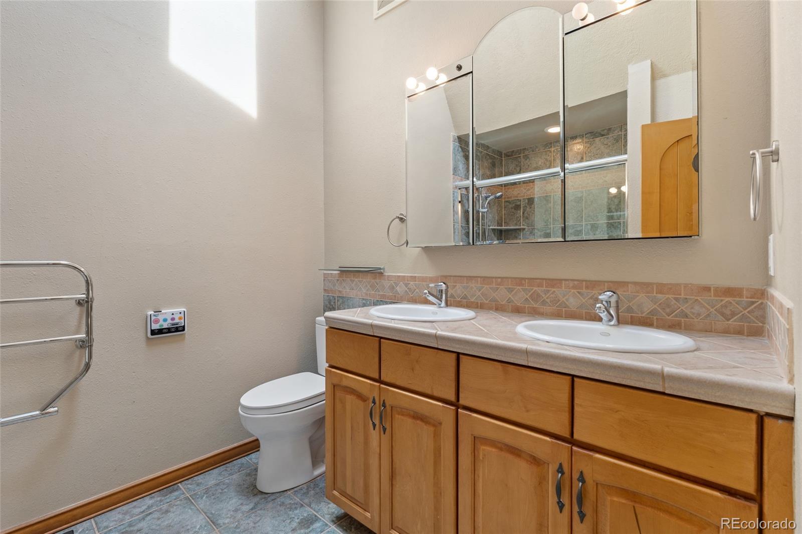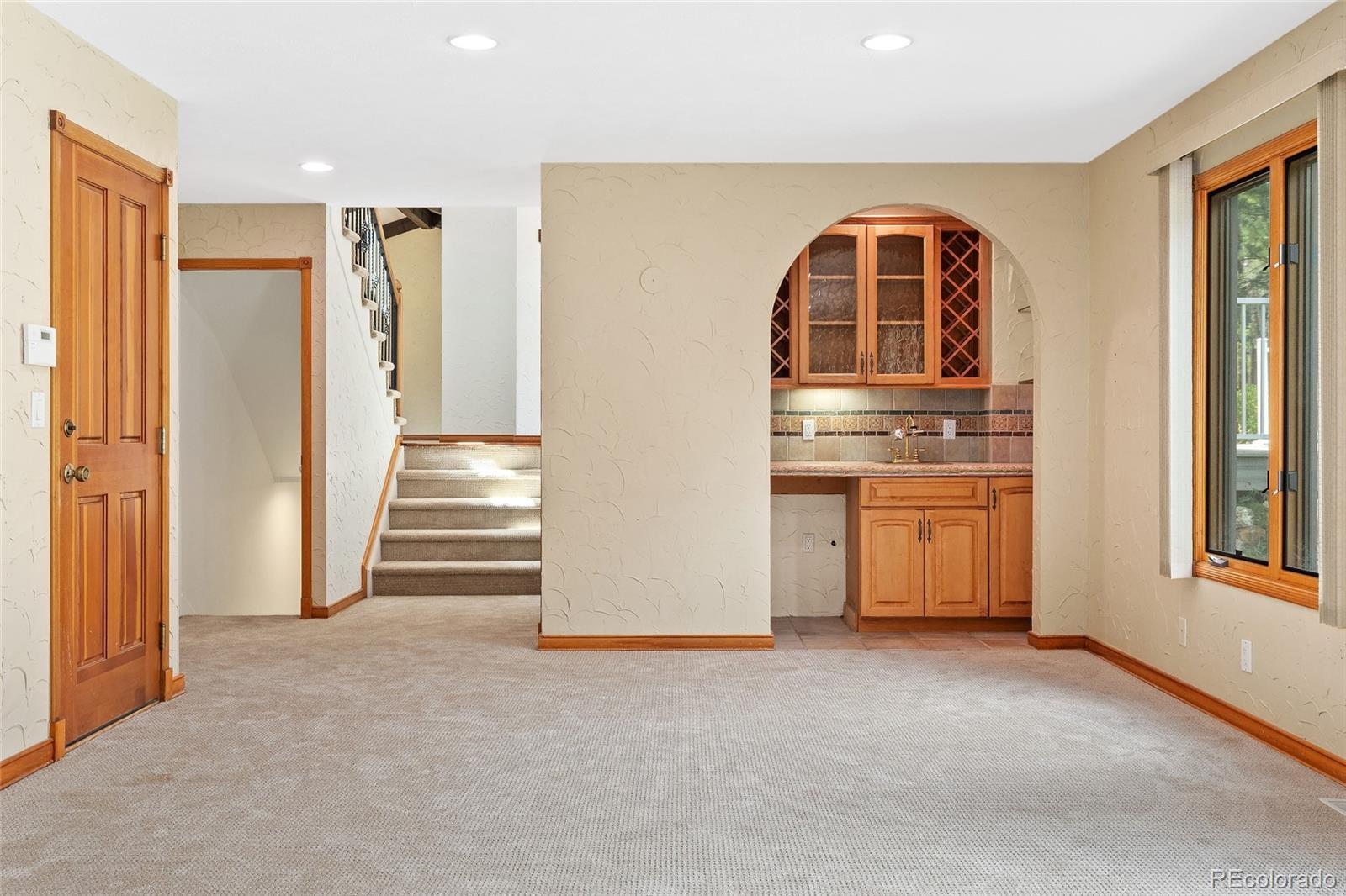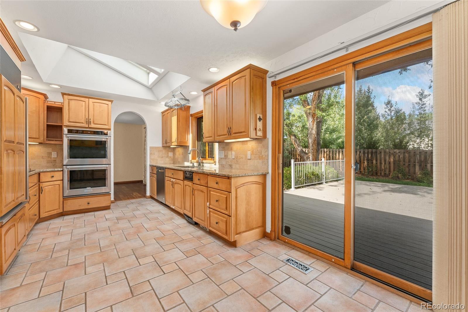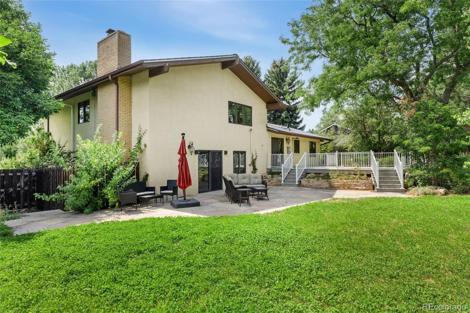 Nestled on a quiet street in Boulder Country Club, this wonderfully updated custom tri-level home sits on an oversized lot, offering exceptional privacy and a beautifully landscaped setting. The impressive living room welcomes you with a dramatic beamed vaulted ceiling and rich cherry wood floors that create a spacious and inviting atmosphere, flowing seamlessly into the elegant dining room and gorgeous kitchen. The kitchen features granite countertops, stainless steel appliances, and refined finishes including skylights, arched doorways, and skip trowel walls that add timeless character throughout the home. The lower level family room is a true gathering spot with plush carpeting, a stylish wet bar, and a cozy fireplace, perfect for entertaining or relaxing. Upstairs, you will find spacious bedrooms including a luxurious primary suite accessed through double doors. This serene retreat boasts ample closet space and a spa-inspired five-piece bathroom with a heated floor, designed for comfort and elegance. An oversized bonus room provides versatile space for a home office, playroom, or creative studio. The finished basement adds even more living space featuring modern touches in the recreation room, a conforming bedroom, and an ensuite bathroom ideal for guests or multi-generational living. Additional features such as a solar roof and power walls bring energy efficiency and sustainability to everyday living. Blending classic architectural details with thoughtful modern updates, this residence embodies a harmonious balance of style and functionality. From its peaceful, private setting to its expansive living spaces designed for both everyday comfort and grand entertaining, this home invites you to experience a truly elevated lifestyle in Boulder Country Club.