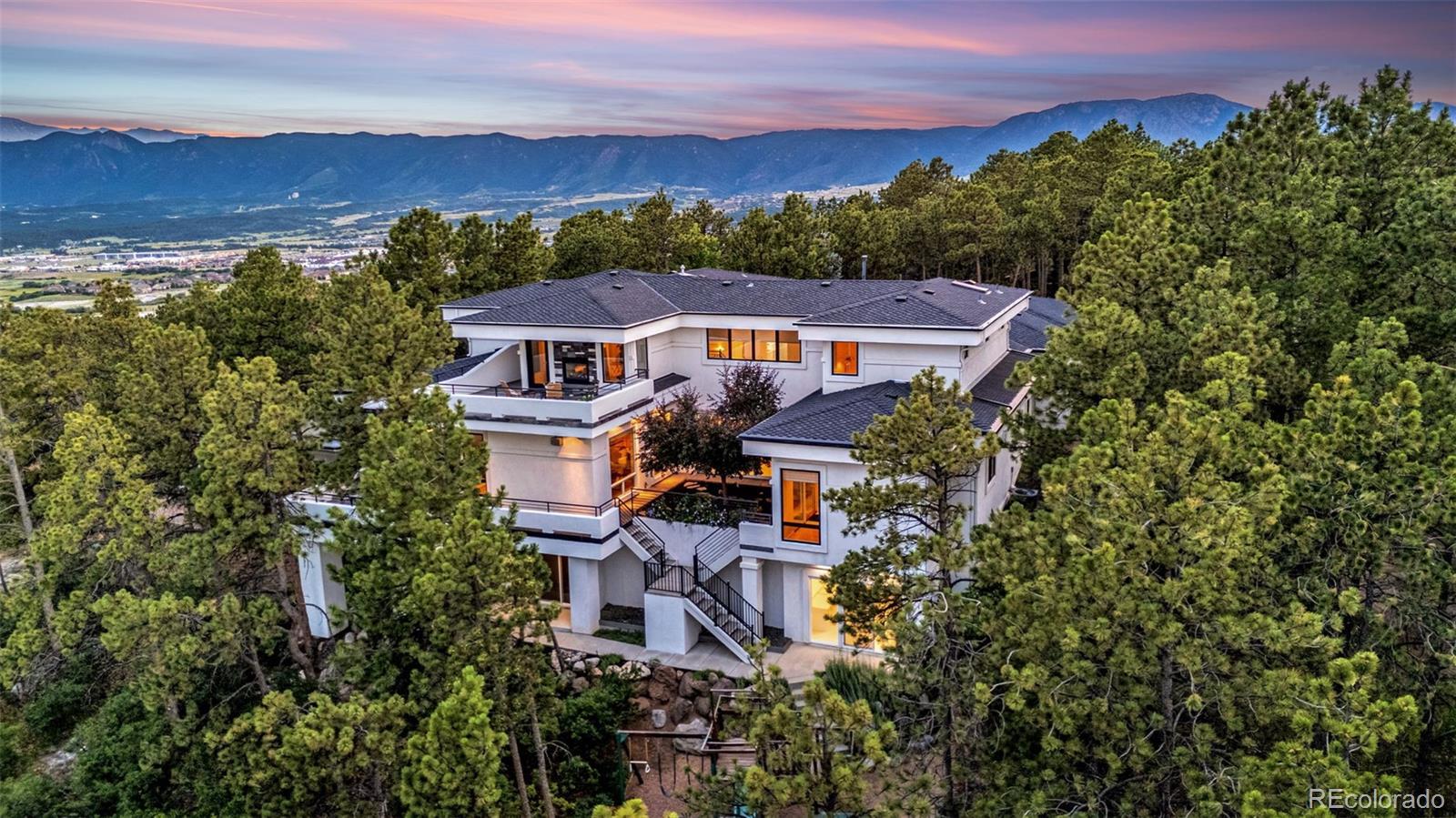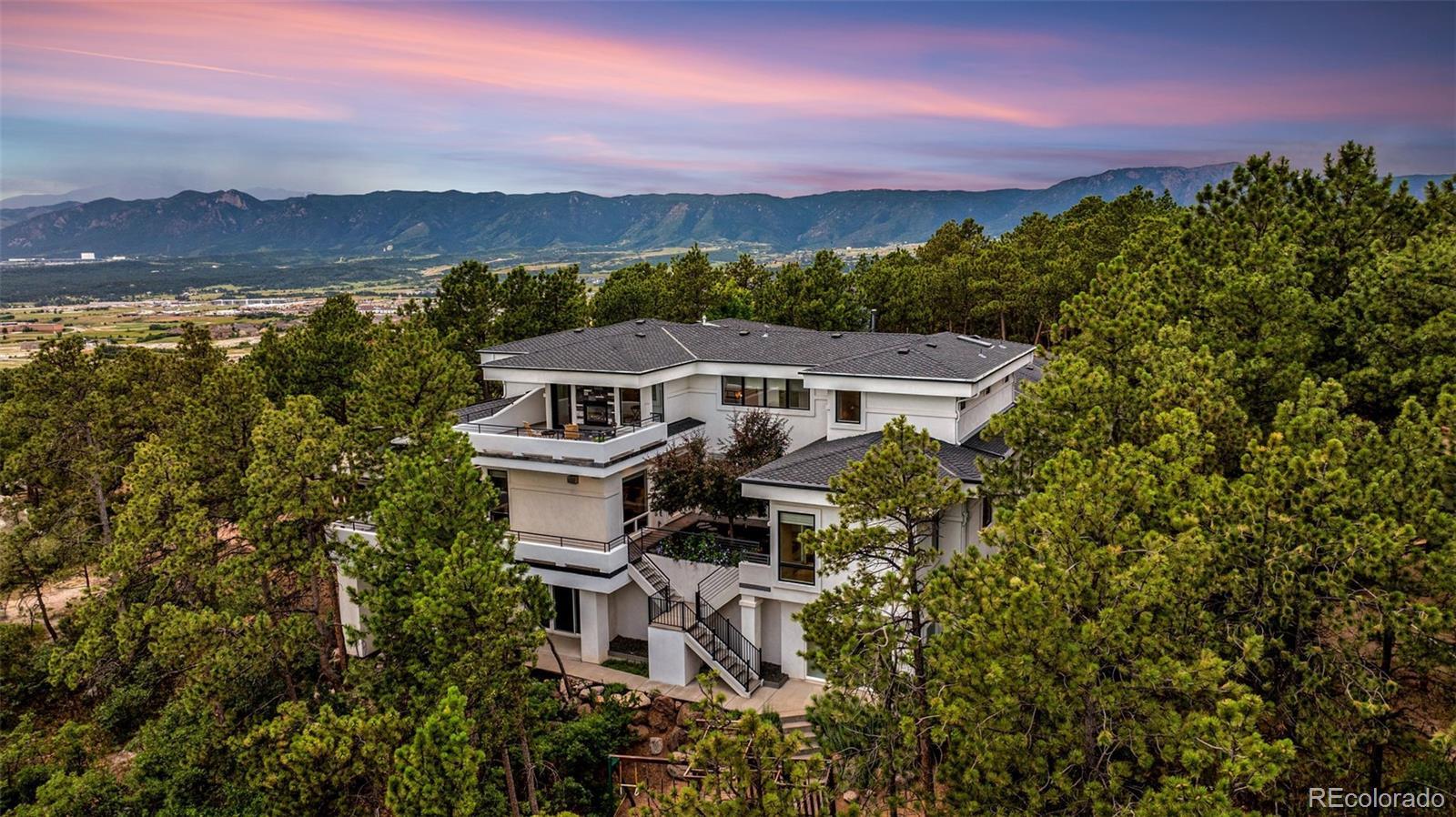 Discover a one-of-a-kind residence crafted by architect Mike Schock, a visionary in custom design. This 6023 sq. ft., 4-bedroom, 6 bath custom home seamlessly blends form and function, offering open concept living spaces, numerous large windows highlighting views of the surrounding lodge pole pines, Pikes Peak, the Air Force Academy, and the lights of Colorado Springs in the distance. The innovative layout maximizes natural light and flow, creating an airy, serene ambience perfect for both relaxation and entertaining. Nestled in the trees of South Woodmoor at the end of a peaceful cul-de-sac, this bespoke creation features 2 levels plus a finished walk-out basement all connected by an in-home elevator. The two wings of the upper level include the primary suite (sitting room with 2-sided fireplace onto upper deck, bedroom, dual bathrooms, each with heated floors, and dual walk-in closets), large upstairs laundry, and secondary bedroom with en-suite bath (heated floors) and walk-in closet. The main level (kitchen with walk-in pantry and butler’s pantry, family room, dining room, living room, powder room, 2-desk office, 2 bedrooms with Jack & Jill bath and mud room) surrounds a courtyard garden with a spring-flowering tree which connects to the concrete deck off the kitchen. The maintenance-free, concrete, main level deck, accessed from the nook, entry and office has a built-in gas barbeque grill as well as a fire pit –both connected to the house gas line. The full walk-out basement includes a wet bar, fridge, entertainment center, half bath, 2 shelved storage rooms, and a craft/plant room with sink. Completing the home is an over-sized 3-car garage and access to 24/7 Woodmoor Security. This unique home truly offers luxury, space, comfort, and location.