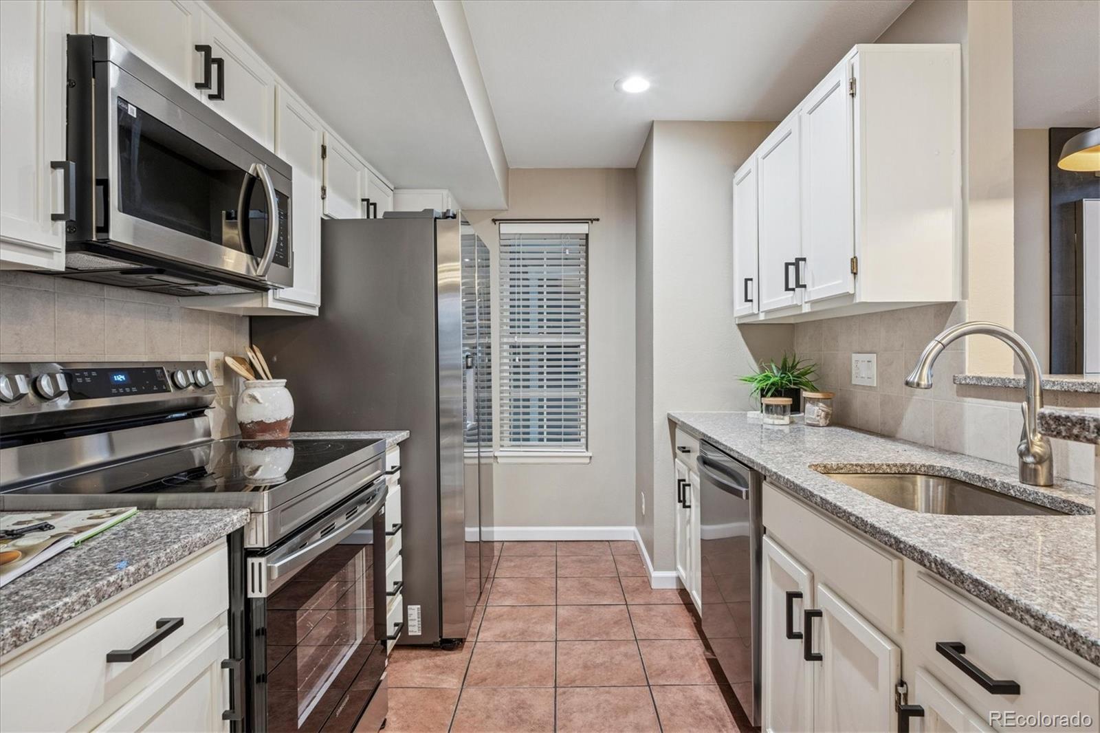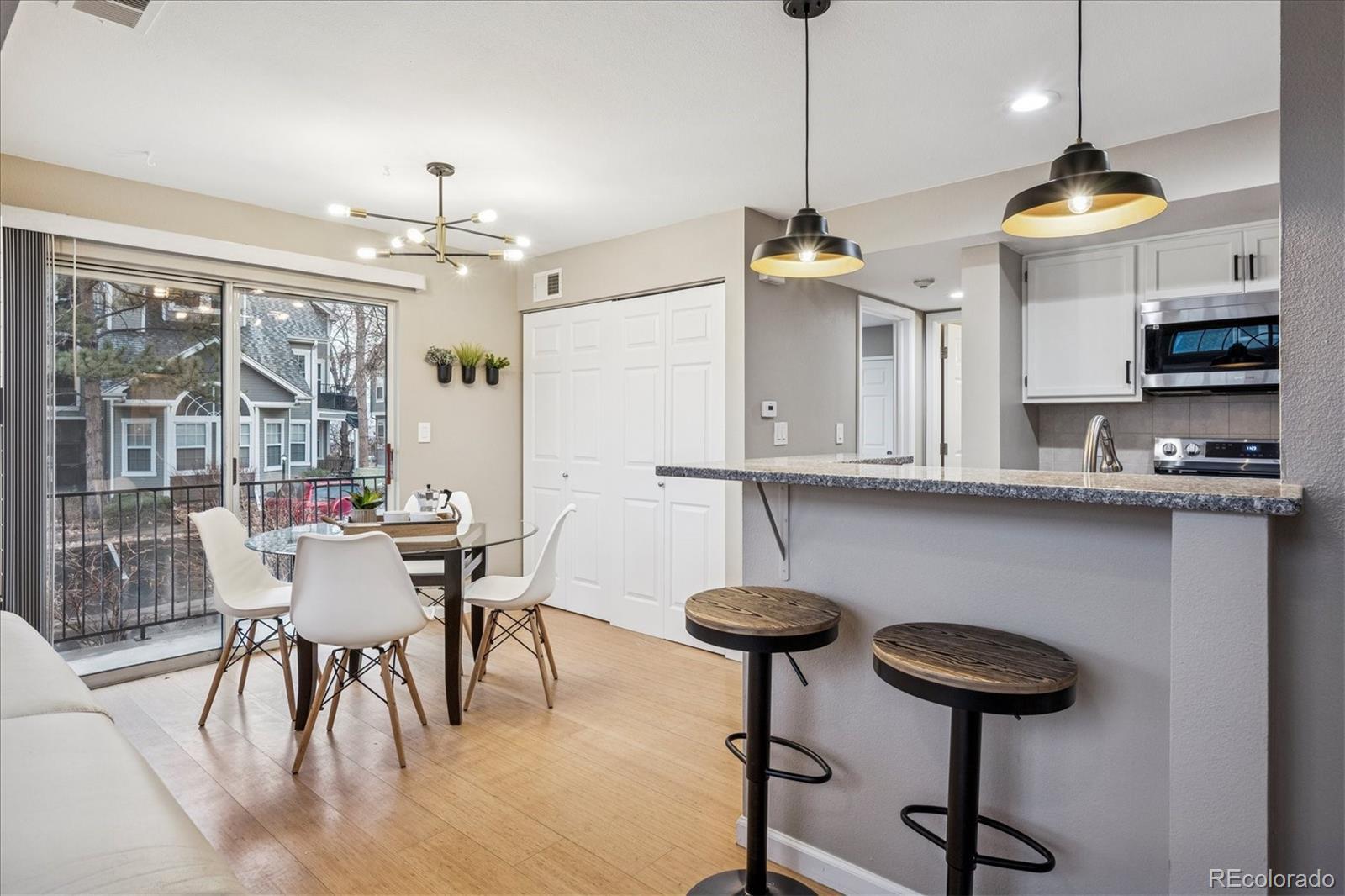 Step inside this beautifully updated first-floor unit and immediately feel at home. Sunlight floods the vaulted living room through large windows, highlighting the gorgeous tile-lined wood-burning fireplace. The open flow leads effortlessly to the dining area and kitchen, complete with crisp white cabinetry, granite countertops, stainless steel appliances, as well as striking black hardware—perfect for cooking and entertaining. The spacious master suite is a private retreat with a large closet and en-suite bath, while the secondary bedroom is bright and inviting, accompanied by a full bath featuring a luxurious rain shower. Enjoy morning coffee or evening sunsets on your balcony. Take advantage of the cleverly tucked-away laundry closet and recessed lighting that adds a modern, polished touch throughout. This unit includes Parking Spot #23 and benefits from a strong HOA with amenities like a pool, clubhouse, and more. Perfectly located between Arapahoe Rd. and Holly St., steps from the Tennis Center, Willow Creek Trail, and just minutes from Greenwood Plaza’s grocery stores, dining, and entertainment—this is convenience, comfort, and style all in one prime location!