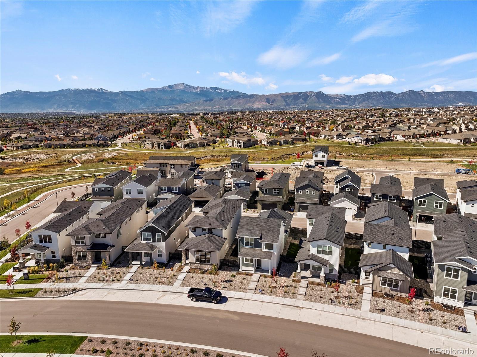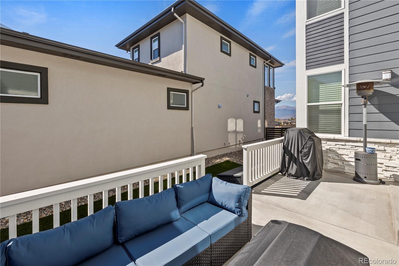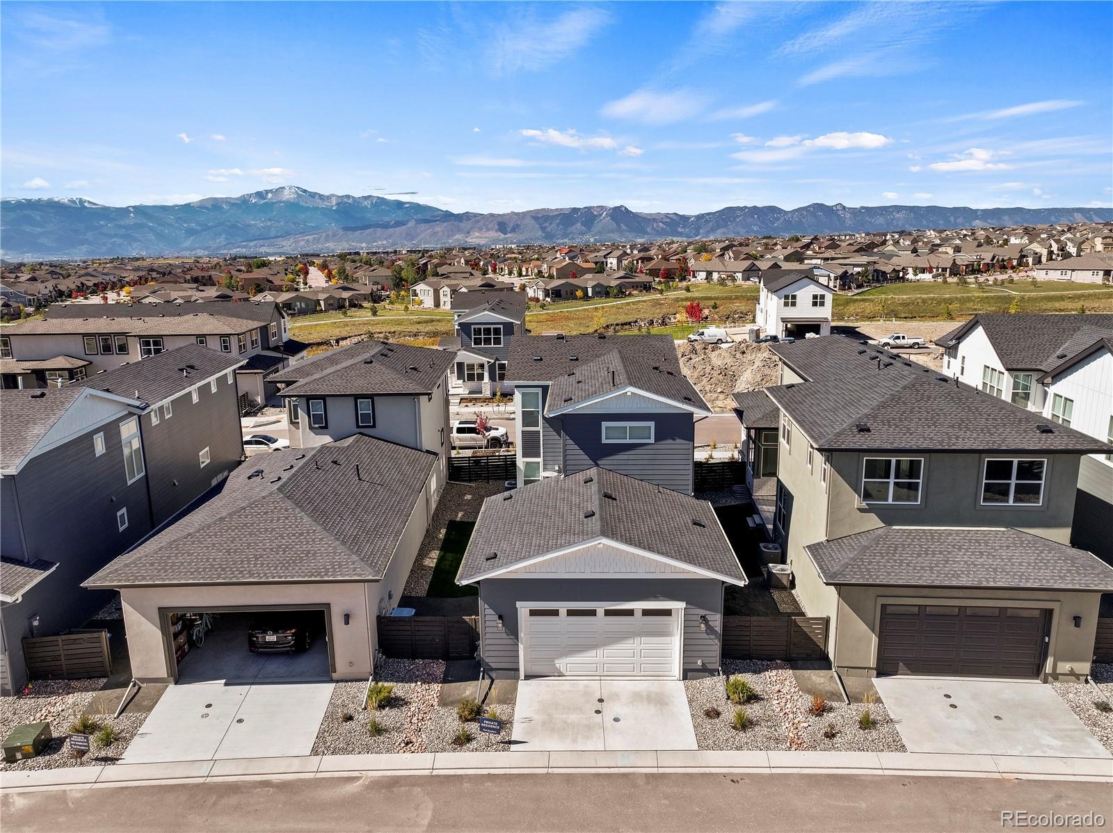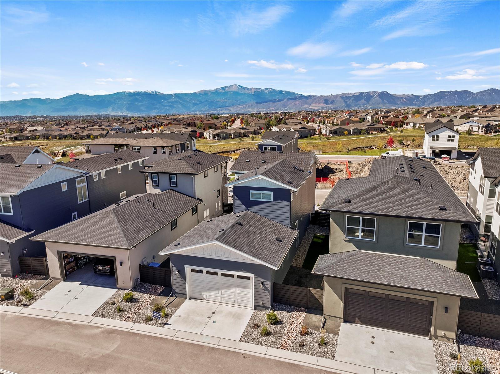 This spacious home seamlessly blends comfort and sophistication in a thoughtfully designed two-story floor plan. A welcoming foyer opens into a spacious great room with electric fireplace & included 85" TV, ideal for both everyday living and entertaining. The chef-inspired kitchen offers a generous island with breakfast bar, top of the line Kitchen-Aid & LG stainless steel appliances, a walk-in pantry, abundant cabinetry, and direct access to a private patio for seamless indoor-outdoor living. The upper level contains the primary suite with a walk-in closet and a spa-style bath featuring dual vanities, a luxe shower with seat & dual shower heads. Two additional bedrooms—one with its own walk-in closet—share a well-appointed full bath with separate vanity area. The unfinished basement with rough-in bath provides additional space for an additional bedroom and entertainment area. The oversized garage is fully drywalled and insulated. Ample outdoor living space with the spacious patio & a fenced backyard with low maintenance turf. Additional highlights include a first-floor powder bathroom, convenient upper level laundry w/ sink, dual zone HVAC system, custom window coverings, & Pikes Peak views from the primary suite, living room, & covered front porch.