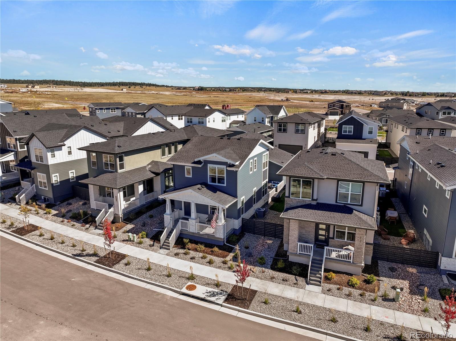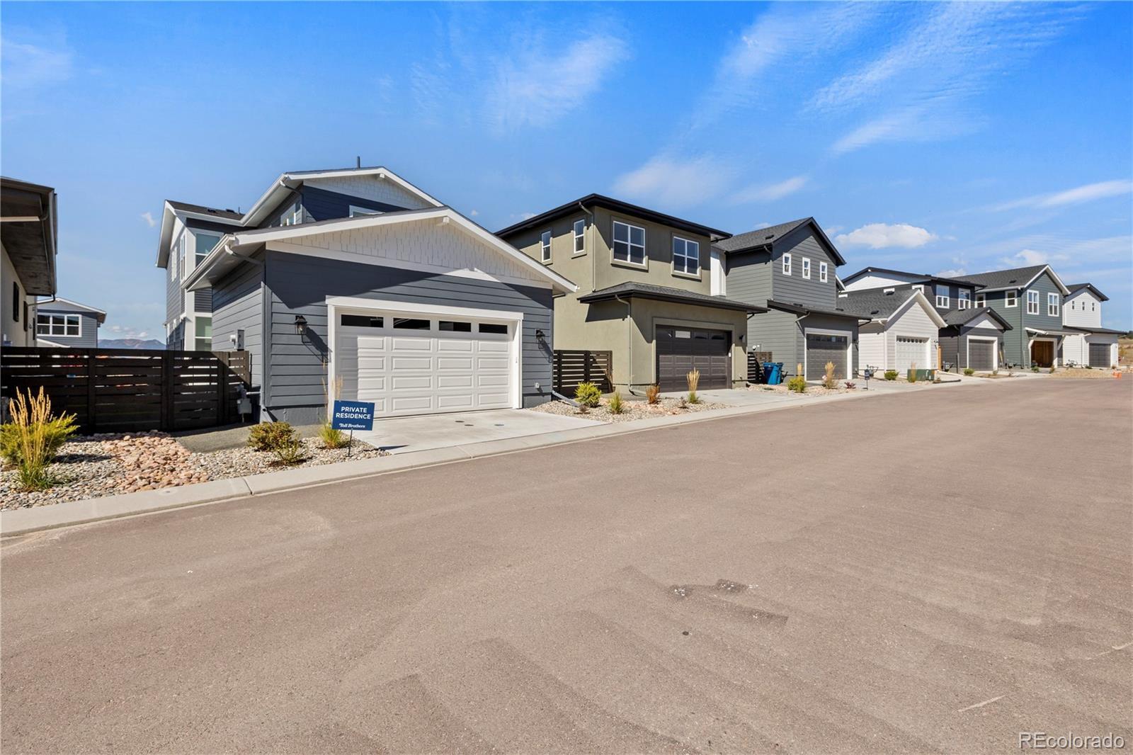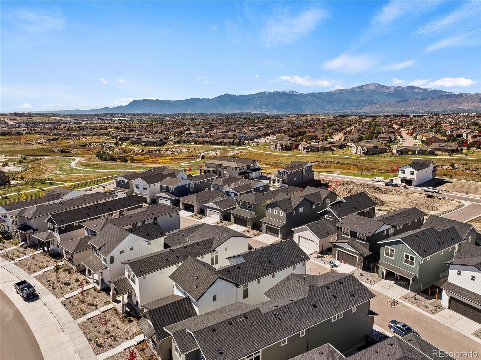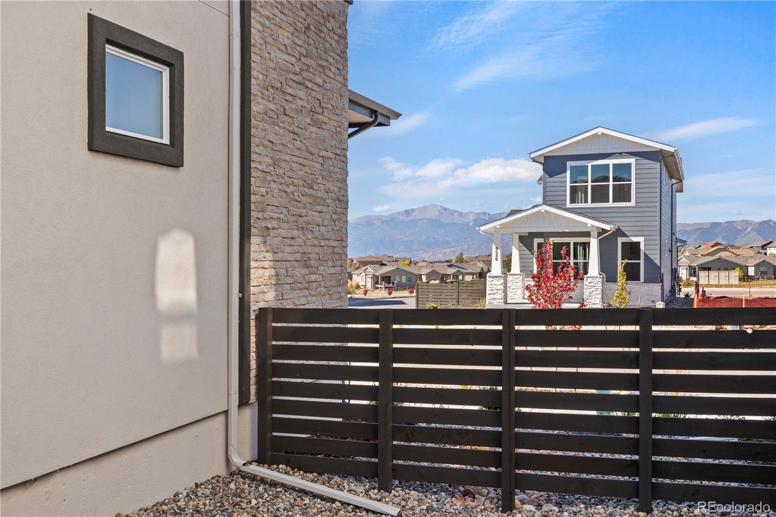 This spacious home seamlessly blends comfort and sophistication in a thoughtfully designed two-story floor plan. A welcoming foyer opens into a spacious great room with electric fireplace & included 85" TV, ideal for both everyday living and entertaining. The chef-inspired kitchen offers a generous island with breakfast bar, top of the line Kitchen-Aid & LG stainless steel appliances, a walk-in pantry, abundant cabinetry, and direct access to a private patio for seamless indoor-outdoor living. The upper level contains the primary suite with a walk-in closet and a spa-style bath featuring dual vanities, a luxe shower with seat & dual shower heads. Two additional bedrooms—one with its own walk-in closet—share a well-appointed full bath with separate vanity area. The unfinished basement with rough-in bath provides additional space for an additional bedroom and entertainment area. The oversized garage is fully drywalled and insulated. Ample outdoor living space with the spacious patio & a fenced backyard with low maintenance turf. Additional highlights include a first-floor powder bathroom, convenient upper level laundry w/ sink, dual zone HVAC system, custom window coverings, & Pikes Peak views from the primary suite, living room, & covered front porch.