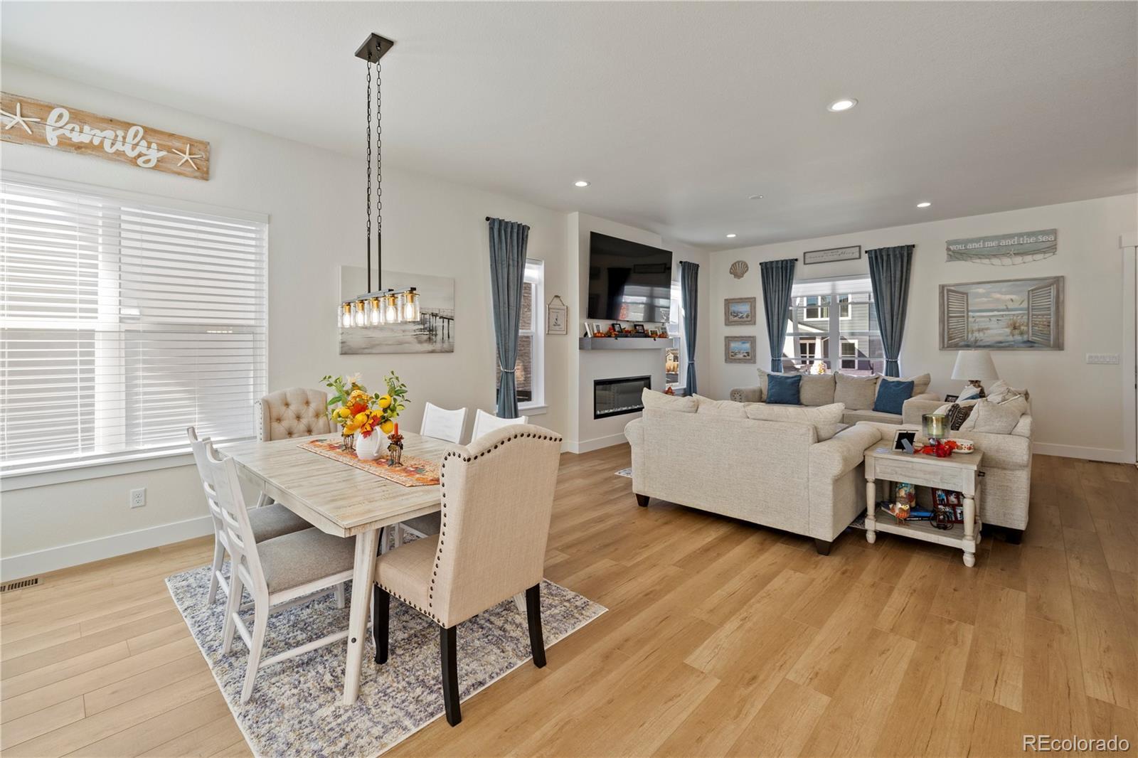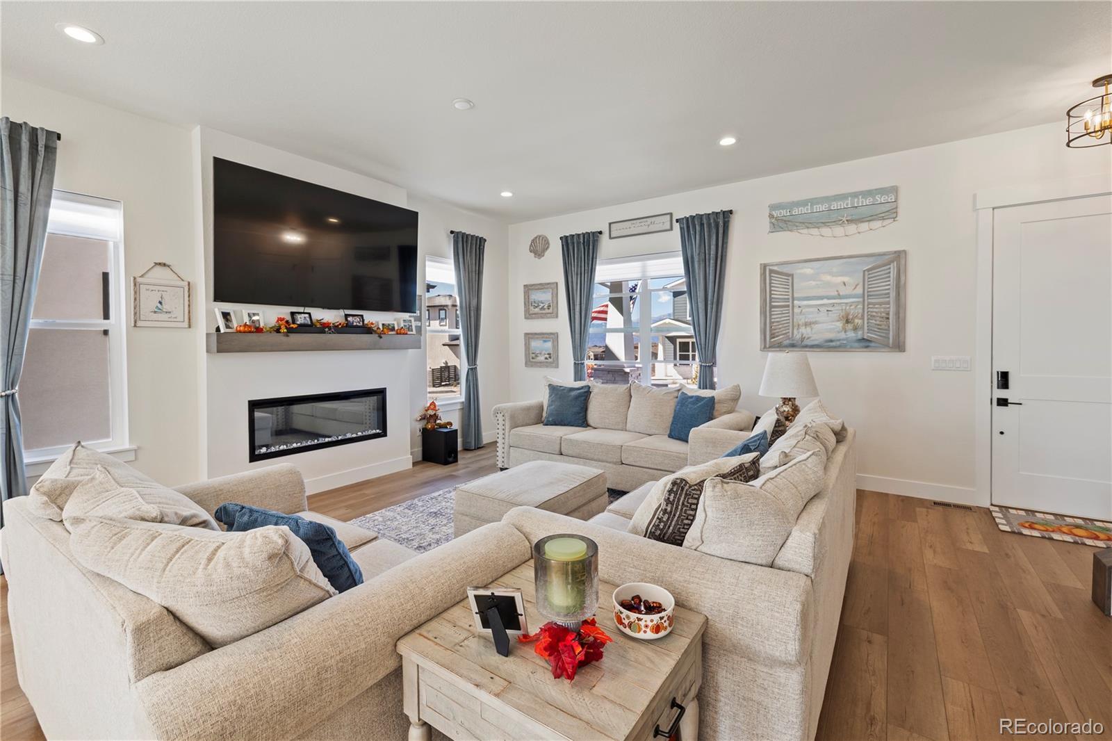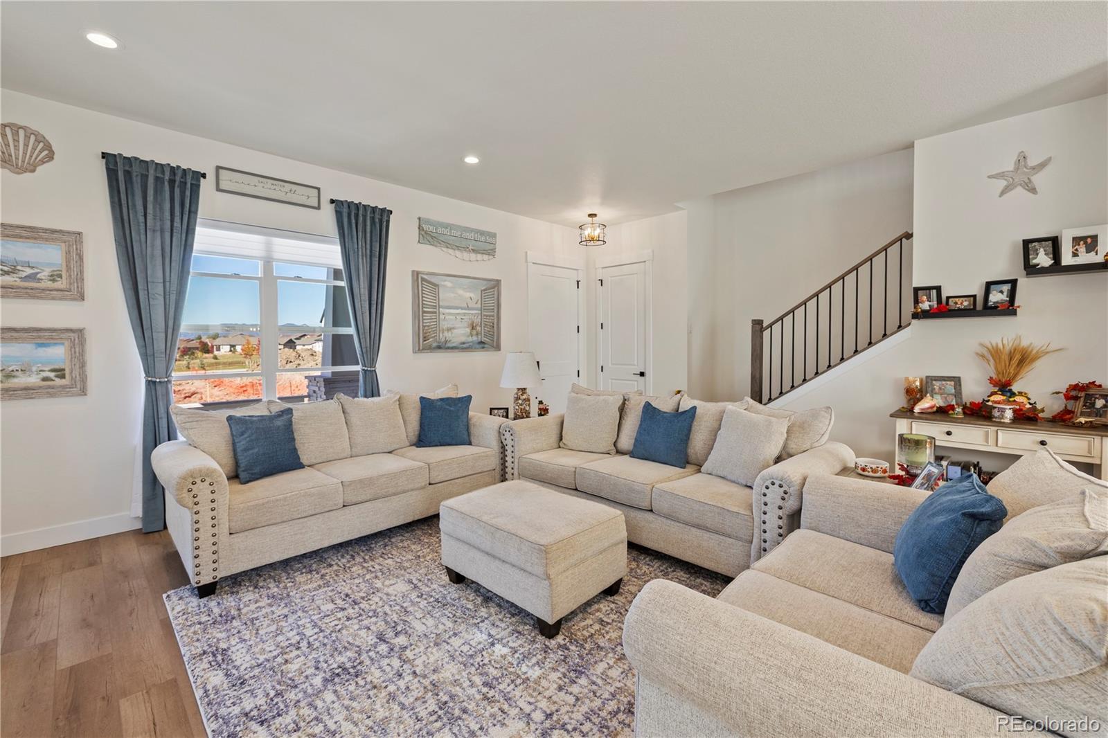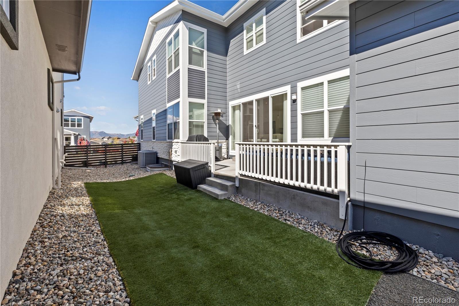 This spacious home seamlessly blends comfort and sophistication in a thoughtfully designed two-story floor plan. A welcoming foyer opens into a spacious great room with electric fireplace & included 85" TV, ideal for both everyday living and entertaining. The chef-inspired kitchen offers a generous island with breakfast bar, top of the line Kitchen-Aid & LG stainless steel appliances, a walk-in pantry, abundant cabinetry, and direct access to a private patio for seamless indoor-outdoor living. The upper level contains the primary suite with a walk-in closet and a spa-style bath featuring dual vanities, a luxe shower with seat & dual shower heads. Two additional bedrooms—one with its own walk-in closet—share a well-appointed full bath with separate vanity area. The unfinished basement with rough-in bath provides additional space for an additional bedroom and entertainment area. The oversized garage is fully drywalled and insulated. Ample outdoor living space with the spacious patio & a fenced backyard with low maintenance turf. Additional highlights include a first-floor powder bathroom, convenient upper level laundry w/ sink, dual zone HVAC system, custom window coverings, & Pikes Peak views from the primary suite, living room, & covered front porch.