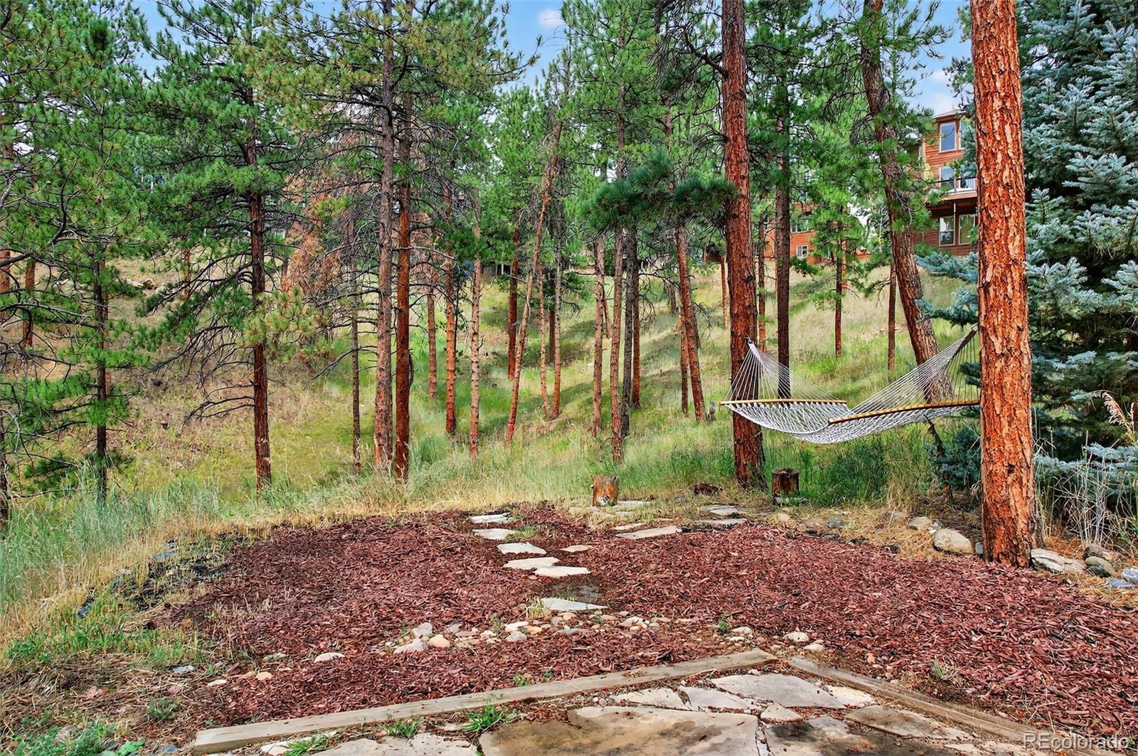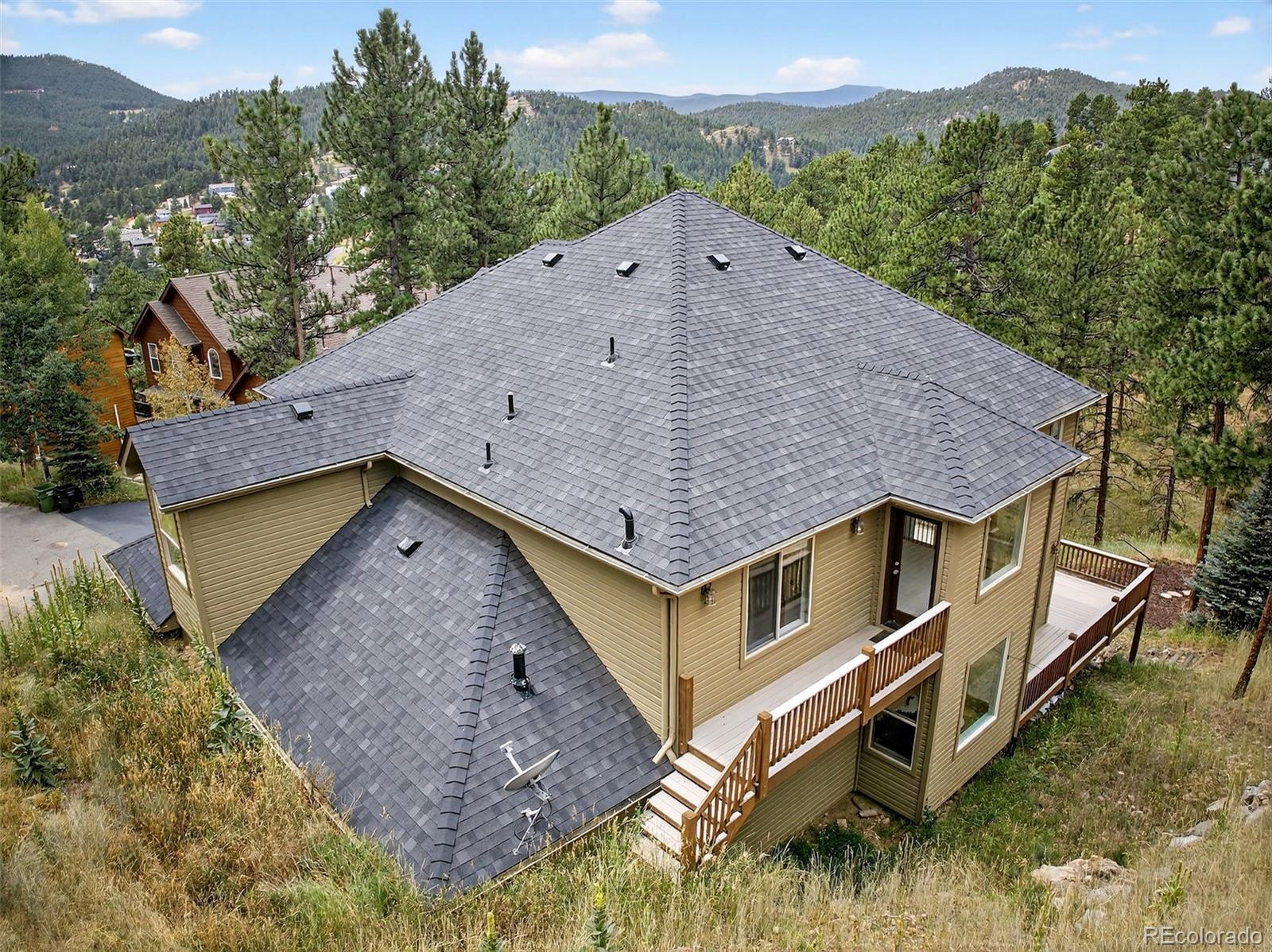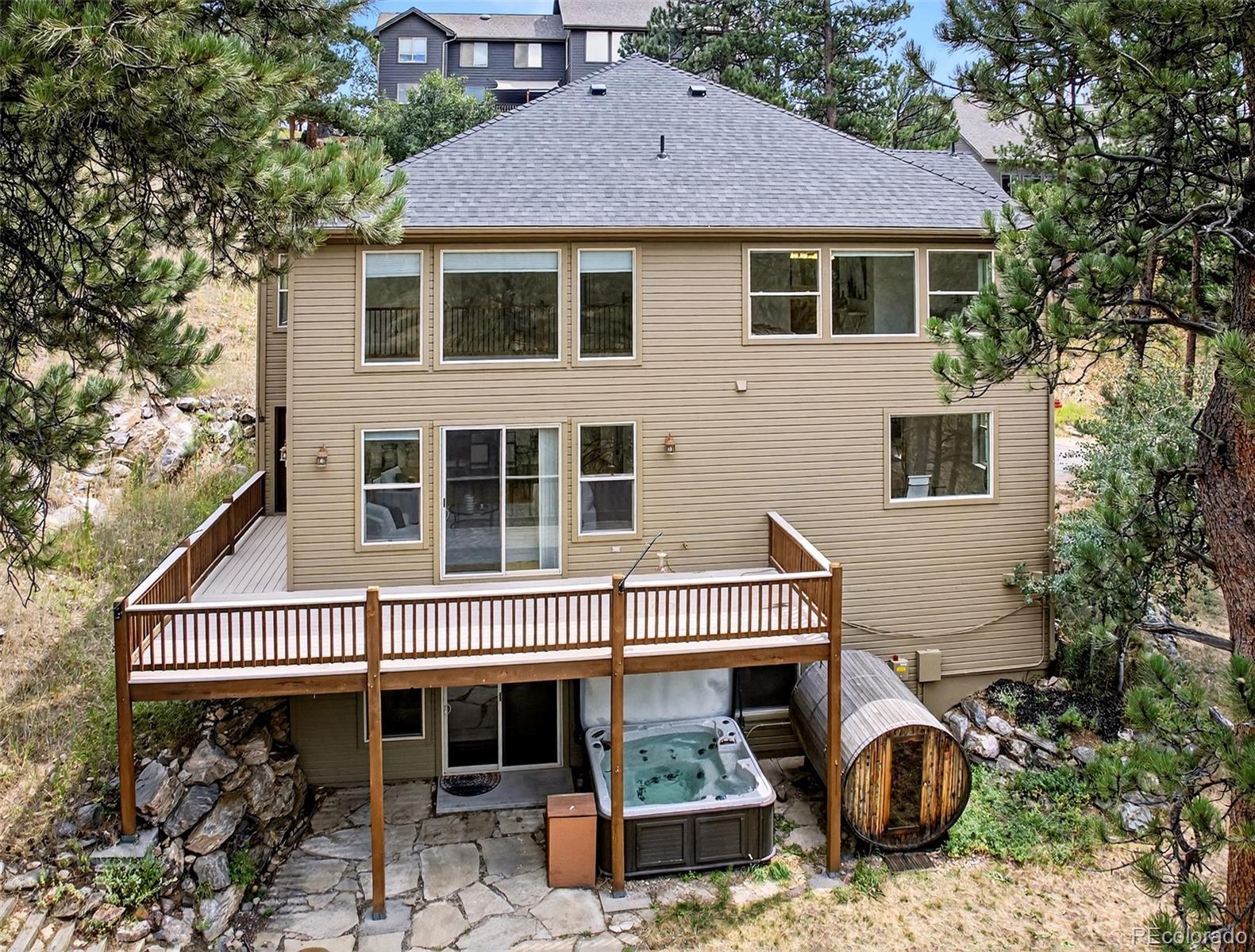 OPEN SATURDAY 11 am - 1pm!!! Step into this stunning mountain home where soaring ceilings, expansive windows, and sweeping views create an immediate sense of space and light. The two-story living room is anchored by a dramatic floor-to-ceiling stacked stone fireplace and connects seamlessly to the kitchen and dining areas, ideal for both everyday living and entertaining. The kitchen features stainless steel appliances, alder cabinetry, granite countertops, and hickory flooring, flowing into a casual dining space. A formal dining room sits just off the entry, along with a private office with French doors—easily adaptable as a main-floor bedroom with access to a full bath. Just off the living area, a spacious deck is perfect for morning coffee, evening meals, and gatherings with mountain views. Recent updates include fresh designer paint throughout and brand-new plush carpet upstairs and in the walk-out basement, giving the home a crisp, move-in ready feel. Upstairs, the primary suite offers incredible views, a five-piece bath, and a large walk-in closet. Two additional bedrooms share a Jack-and-Jill bath, and a versatile loft provides space for an office, reading nook, playroom, or fitness area. The bright walk-out lower level includes a pool table area, fourth bedroom, full bath, and a large unfinished section with a partially finished room—perfect for a gym, media room, or studio. An oversized three-car garage with tandem third bay offers high ceilings and great storage. The private yard features a sauna, hot tub, and seating area for a true mountain retreat. New roof installed August 2023. Located minutes from Downtown Evergreen with easy access to shops, dining, and outdoor recreation, including Lair O’ the Bear Park (4.5 miles), Red Rocks (15 minutes), Denver (45 minutes), DIA (1 hour 20 minutes), and skiing within 1.5 hours. *** PHOTOS DON'T DO THIS HOME JUSTICE .. .SCHEDULE A SHOWING TODAY ***