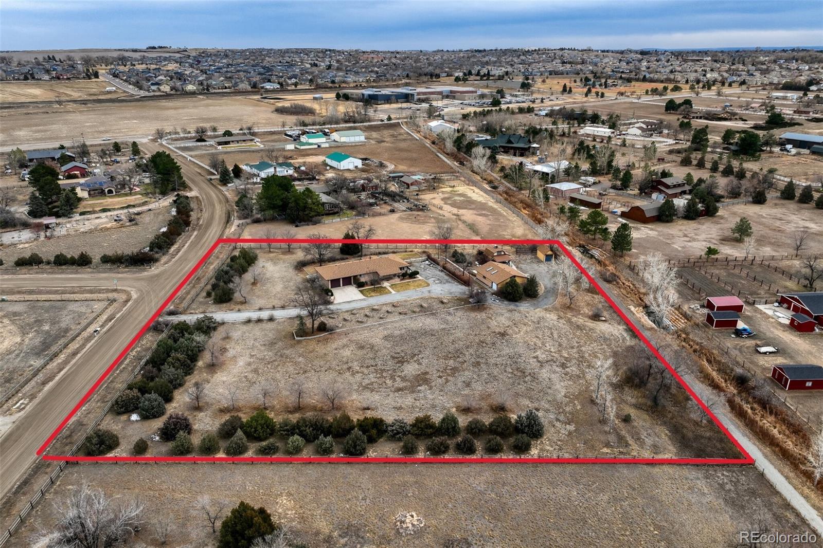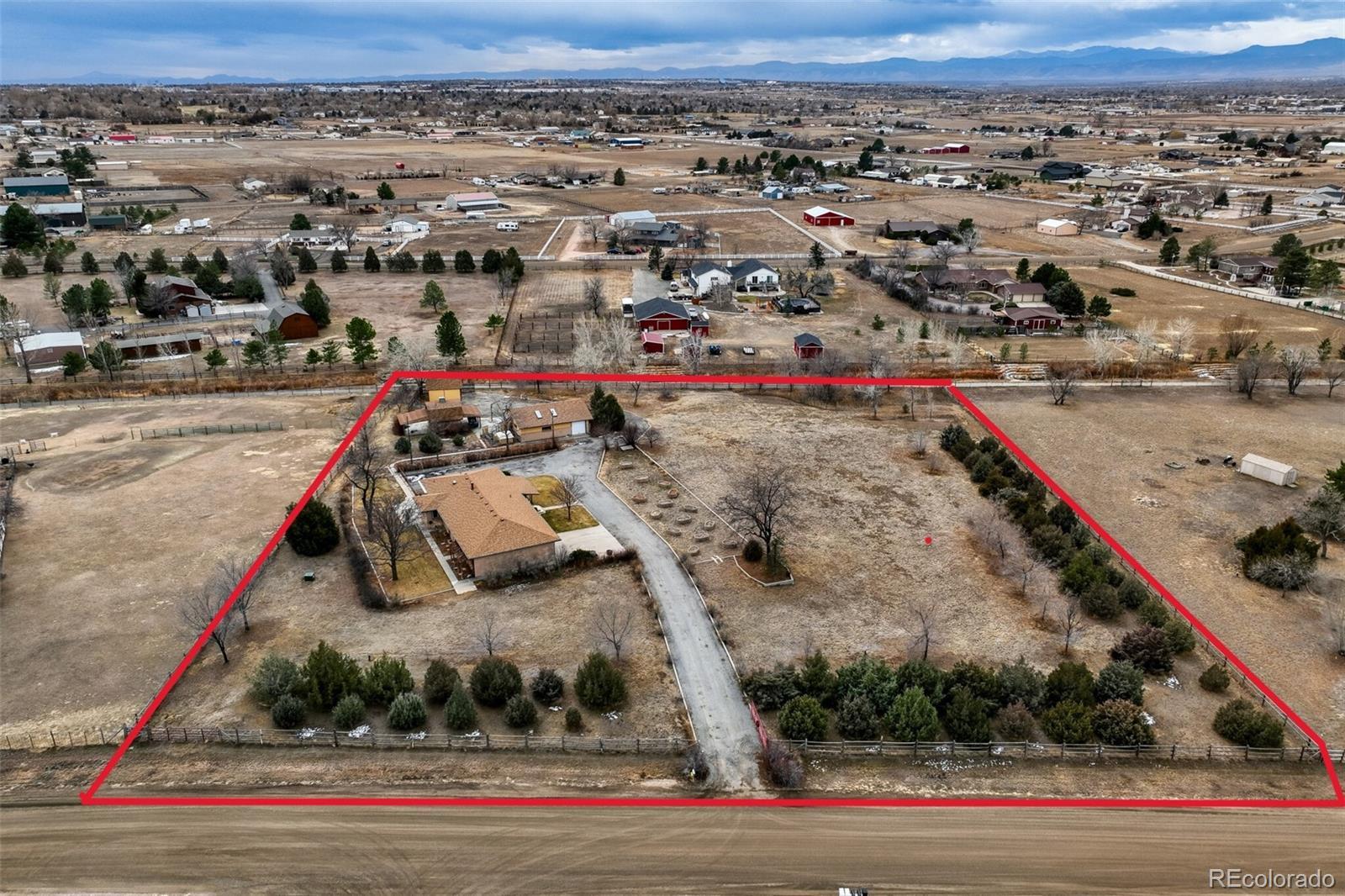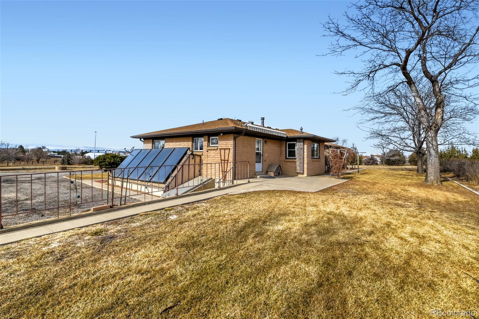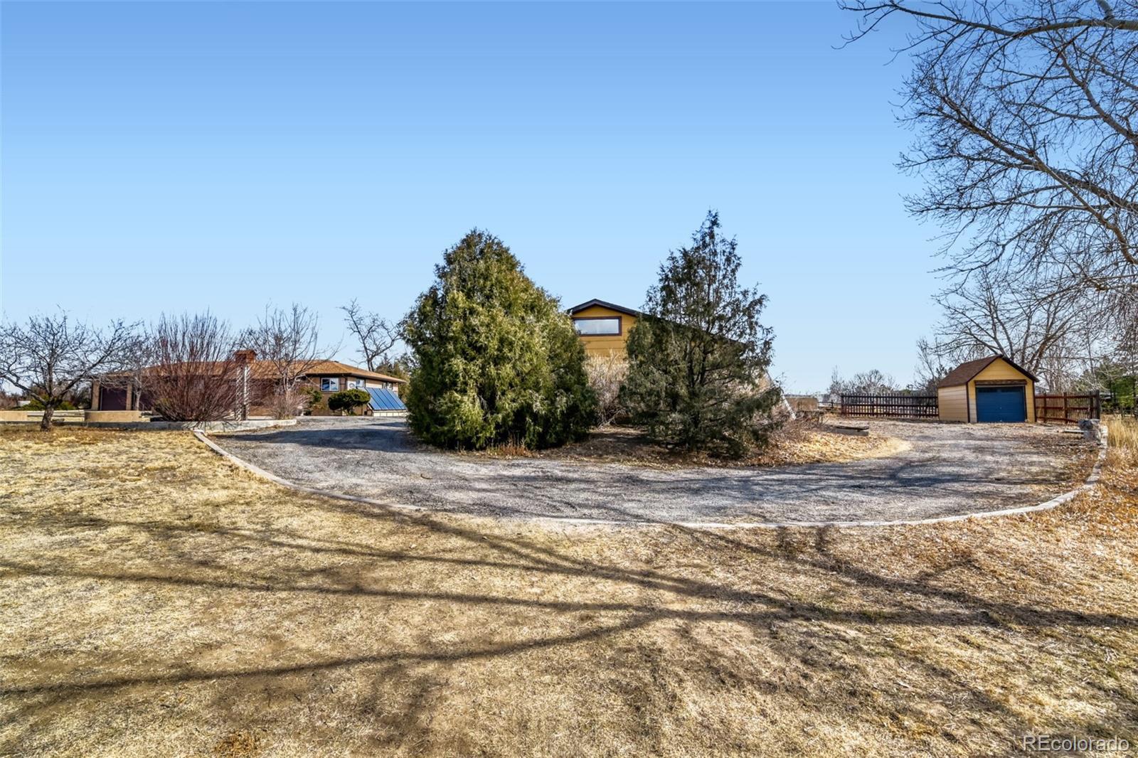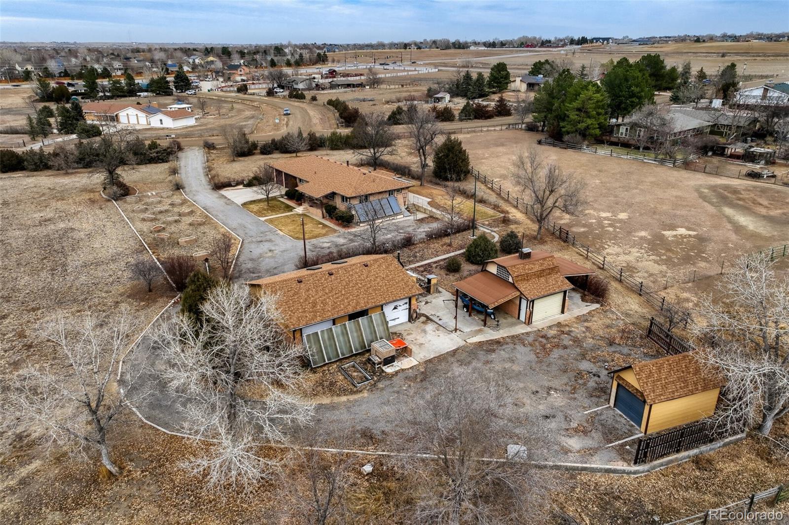 LOCATION, LOCATION, LOCATION! Rare opportunity in Wadley Farms! This 3,252 SF brick walkout ranch on 2.6 acres boasts breathtaking mountain views! Enjoy country living with close proximity to everything! Bring your horses, goats, chickens, RV's, toys, custom cars and whatever you can think of! Lovingly maintained by original owner, this custom ranch has a ton of potential! Brand new carpet, interior paint & lighting on the main level. Use your imagination for the HUGE open family room/rec space in the basement. Plenty of room to have a pool table, living space, gym, home office or addt'l bedroom. The large un-finished space with walkout access offers endless opportunities for a home business. The OS two car attached garage has a mechanics pit plus pull down attic access. On the exterior of this home you'll find nicely landscaped front and back yards (with sprinkler system), covered patios, a garden & garden boxes, and tons of parking! Enjoy access to the community walking/bridle path and water feature just beyond the back fence. Now, let's talk about the 1,044 SF heated workshop w/3 single car garage doors, skylights, electric hoist, pull down attic access, numerous 220 outlets and more! There is also a 285 SF barn w/loft, garage door access and 2 covered overhangs, plus a 198 SF storage shed with a garage door access. Property upgrades include: Mini-split A/C (4 yrs), brand new well pump (2025), Boiler (7 yrs), New roofs & gutters on all buildings (incl leaf guards on the house, 2024), Vinyl windows, Solar panels (paid for), Plumbed for evap cooler, Sprinkler system front & back. All of this amazing country living is close to schools, I25, shopping, restaurants, DIA, Boulder, Denver and more! Too much to list! Don't miss this gem!