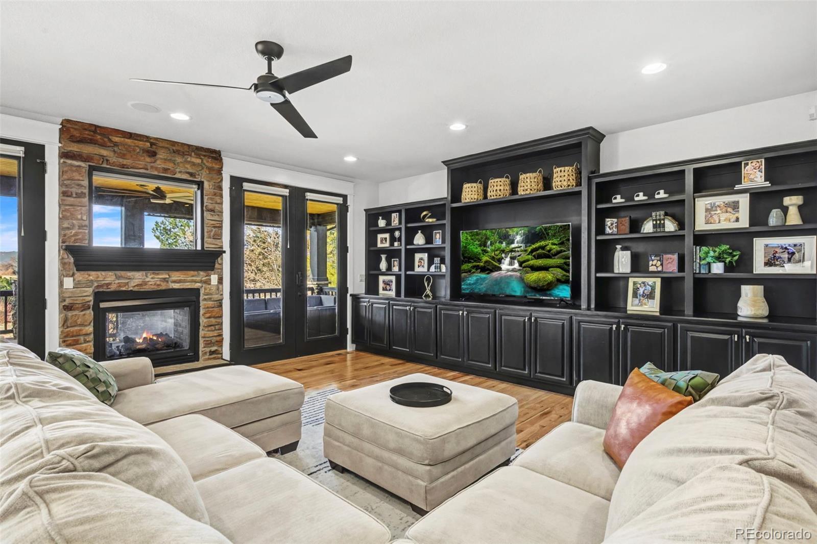 A RARE PROPERTY BLENDING LUXURY ACREAGE, MOUNTAIN VISTAS, AND A 10-CAR GARAGE. Experience elevated living on 3.11 acres, where thoughtful design, and breathtaking mountain views come together in a truly exceptional estate. This 6-bedroom, 5-bathroom residence is surrounded by over $800,000 in professionally designed landscaping, creating a serene, park-like setting complete with a water feature, fire pit, and fully lit grounds. Also, every tree and plant is supported by a comprehensive drip irrigation system. The home is perfectly positioned to capture panoramic views from the expansive wrap-around Trex deck, warmed by a stunning double-sided fireplace.. Inside, refined finishes include oak flooring, extensive custom built-in shelving, and a whole-home audio system with speakers in every room. A dedicated fitness room with mirrors adds a wellness-focused retreat, while the hot tub (included) is thoughtfully designed with proper drainage for ease of ownership. Designed for both luxury and functionality, the property features heated driveways, including a cobblestone main drive fully plumbed for heat, and fully paid-off solar, offering energy efficiency without compromise. The attached 3-car garage complements an extraordinary detached, fully finished and climate-controlled garage with room for a 50’ RV, collector grade automotive bays, 220V power, an office, and a bathroom. The RV bay includes a dedicated dump tied directly to septic, making this property ideal for RV enthusiasts or collectors. The entire yard is secured with an "Invisible" dog fence, while an additional acre provides endless possibilities—horses, a dirt bike track, or the option to build. This is a rare opportunity to own a meticulously designed estate that balances privacy, versatility, and high-end living—crafted for those who expect more, and built to accommodate it all.